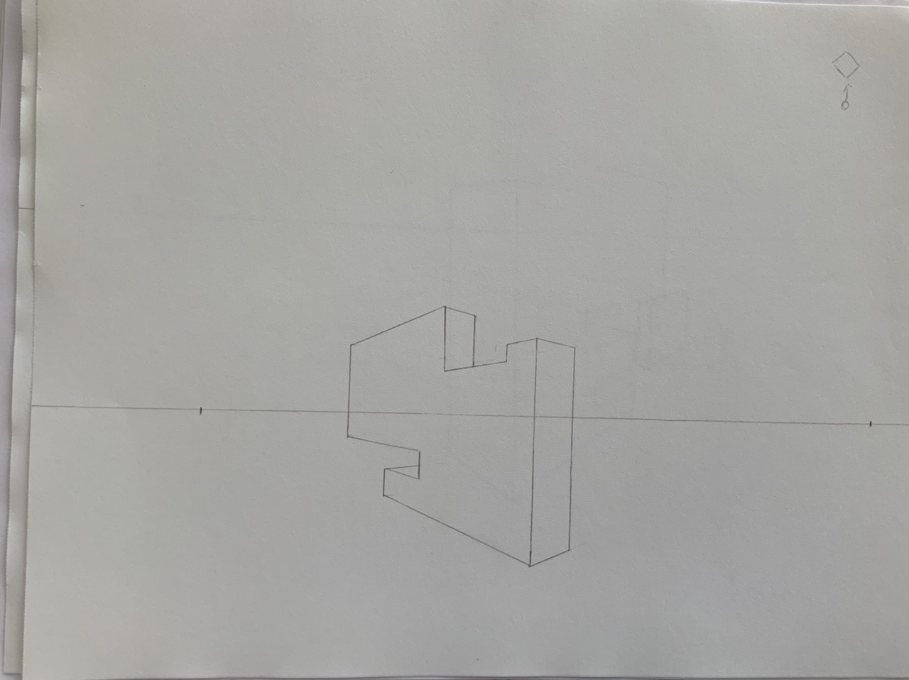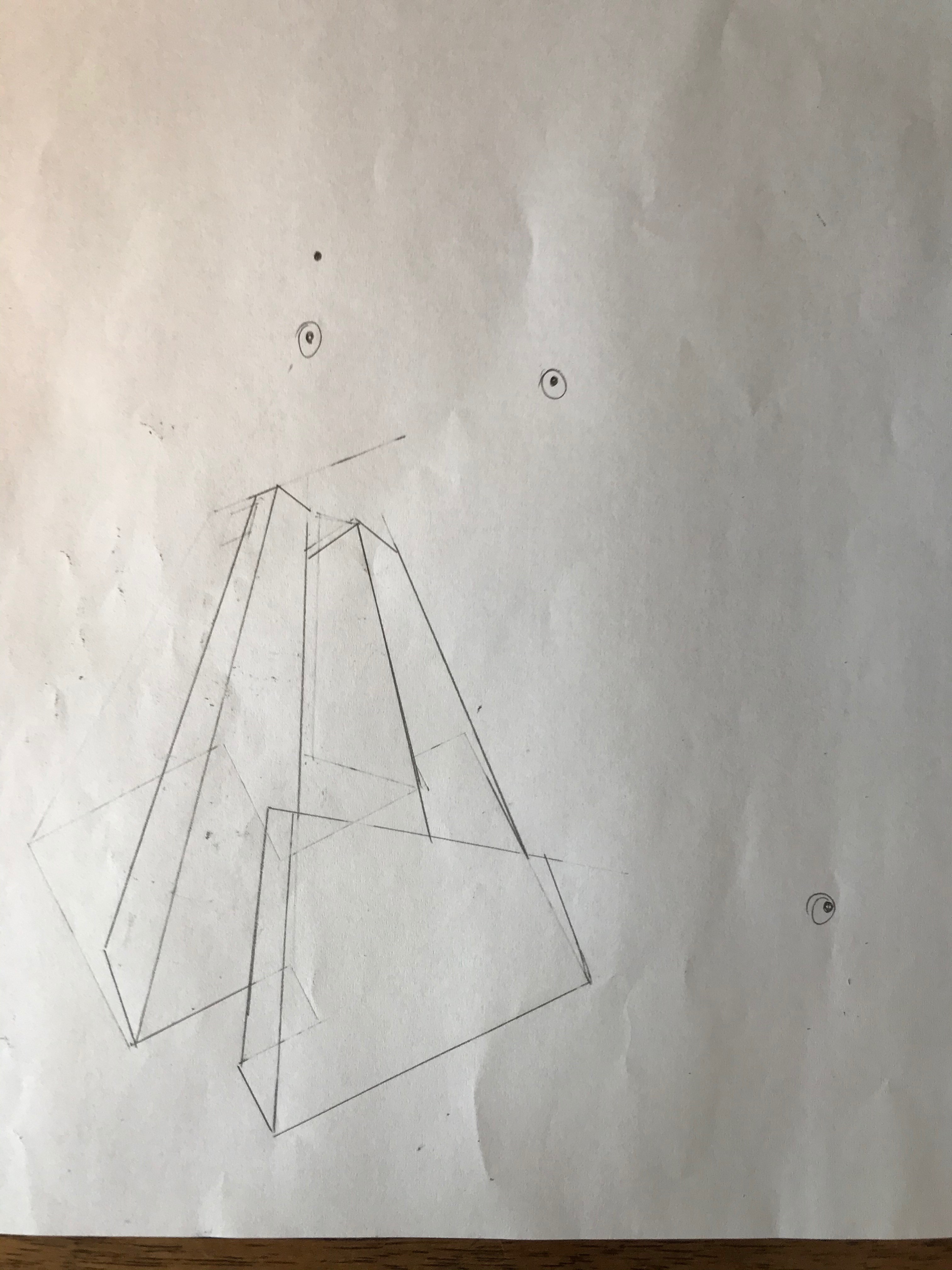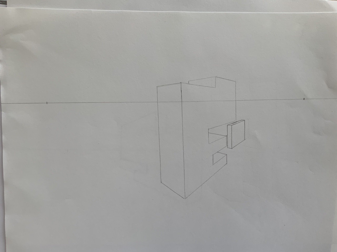 Ici j'ai l'impression que tu as fait fuir des droites qui devraient normalement fuir vers un même point, vers deux points différents. Par exemple, la forme à gauche, l'arrête tout en haut et tout en bas à gauche. Donc deux droites horizontales qui fuient vers la profondeur. Celle du haut semble fuir vers le point numéro 2, et celle du bas qui devrait normalement fuir aussi vers ce point fuit vers un autre point situé hors cadre visiblement. Comme je ne sais pas dans quel sens tu as fait ton dessin, je ne sais même pas si tes deux premiers points sont situés sur la même ligne d'horizon (il faut).