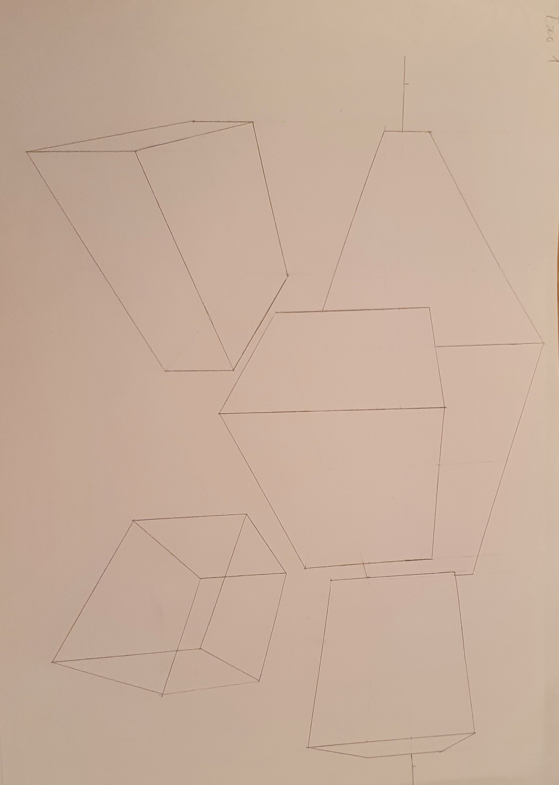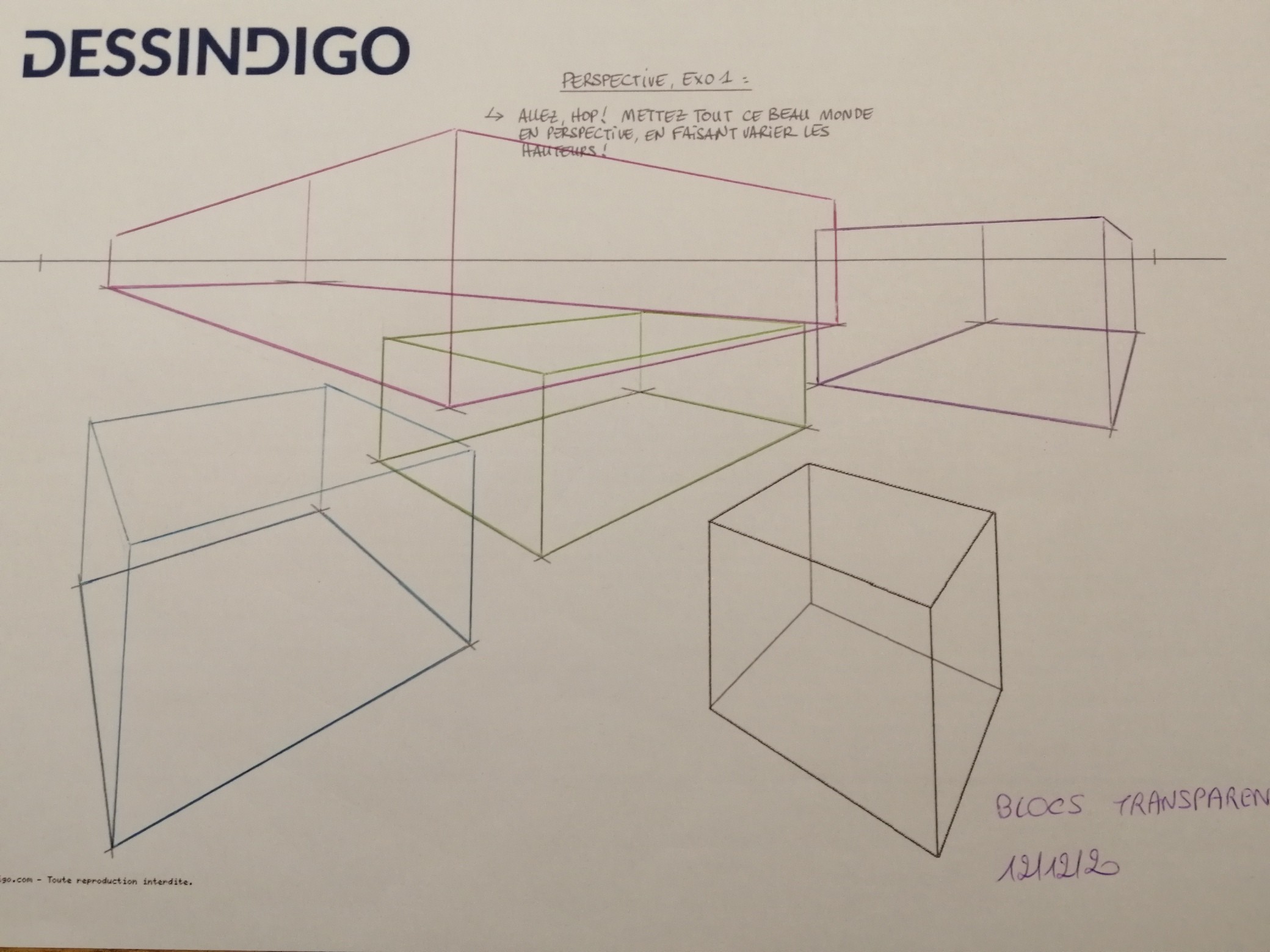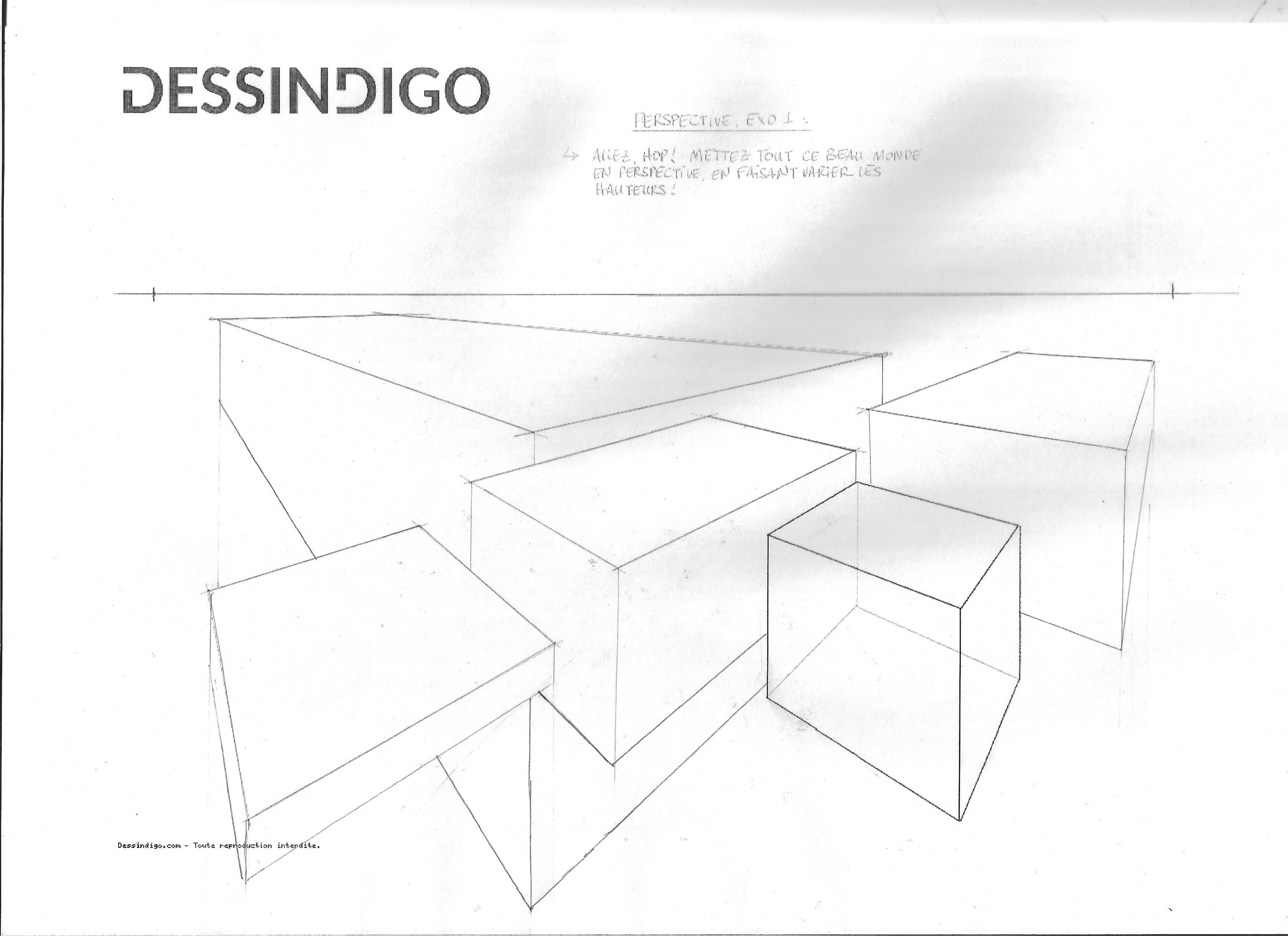 J'observe que tu as fait "descendre" le pavé du milieu au lieu de le faire "monter". Ce n'est pas grave en soi mais ça change le rendu puisqu'il n'est pas "au sol" comme les autres (en tout cas la base ne l'est pas, bref), et de plus tu es mal tombé puisque tu as un angle qui tombe pile sur une arrête du pavé de gauche, ça nuit beaucoup à la lisibilité. Pour un exercice comme ça ce n'est pas grave mais dans un "vrai" dessin il faut faire attention à ce genre de chose, que les traits ne se chevauchent pas !