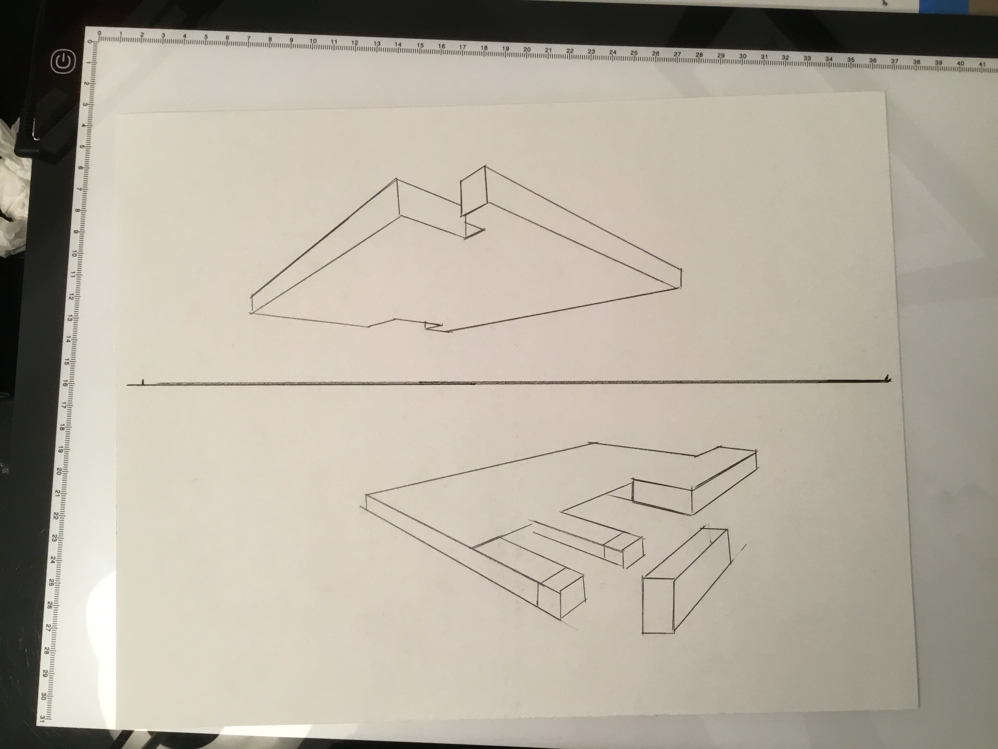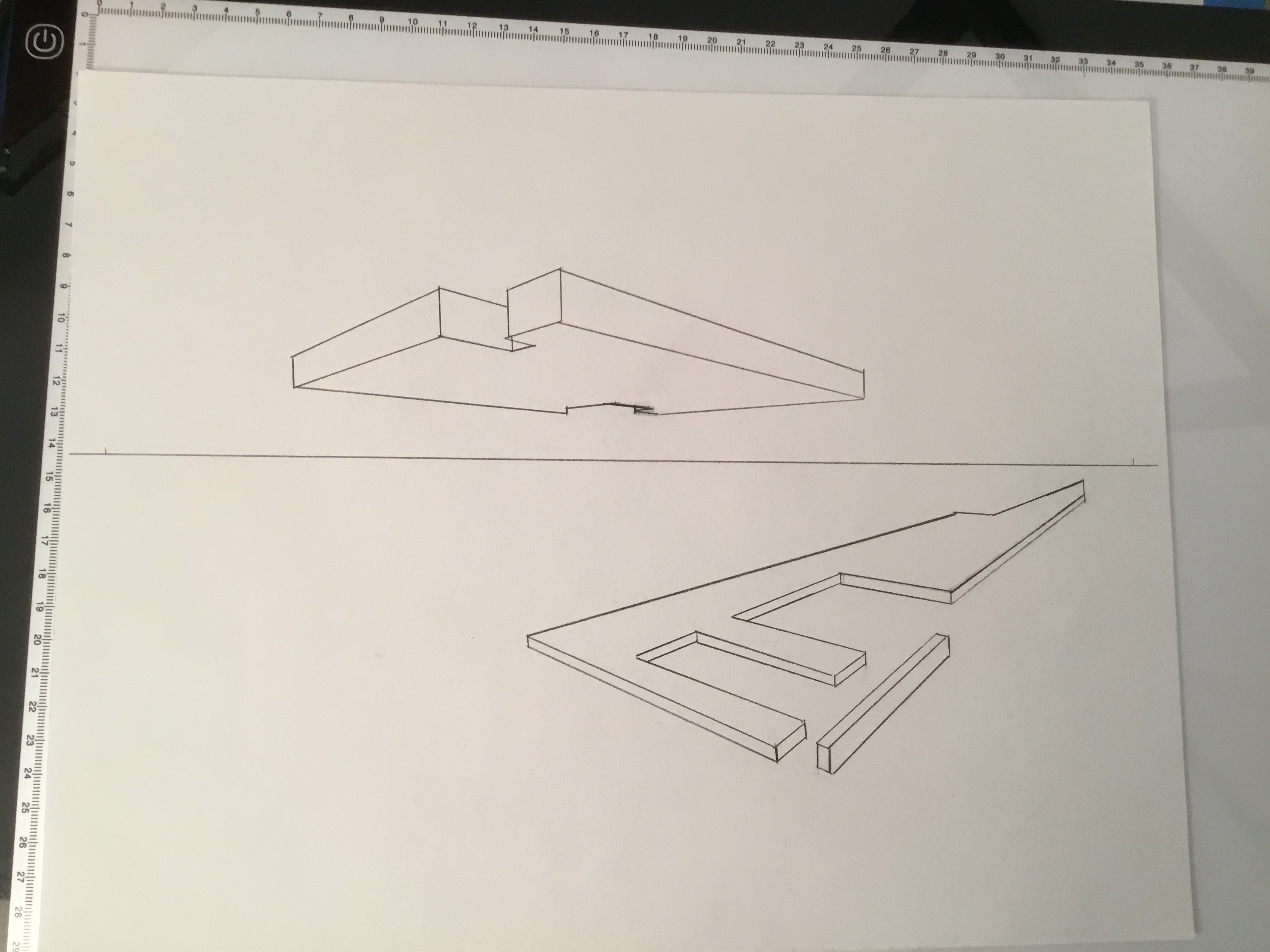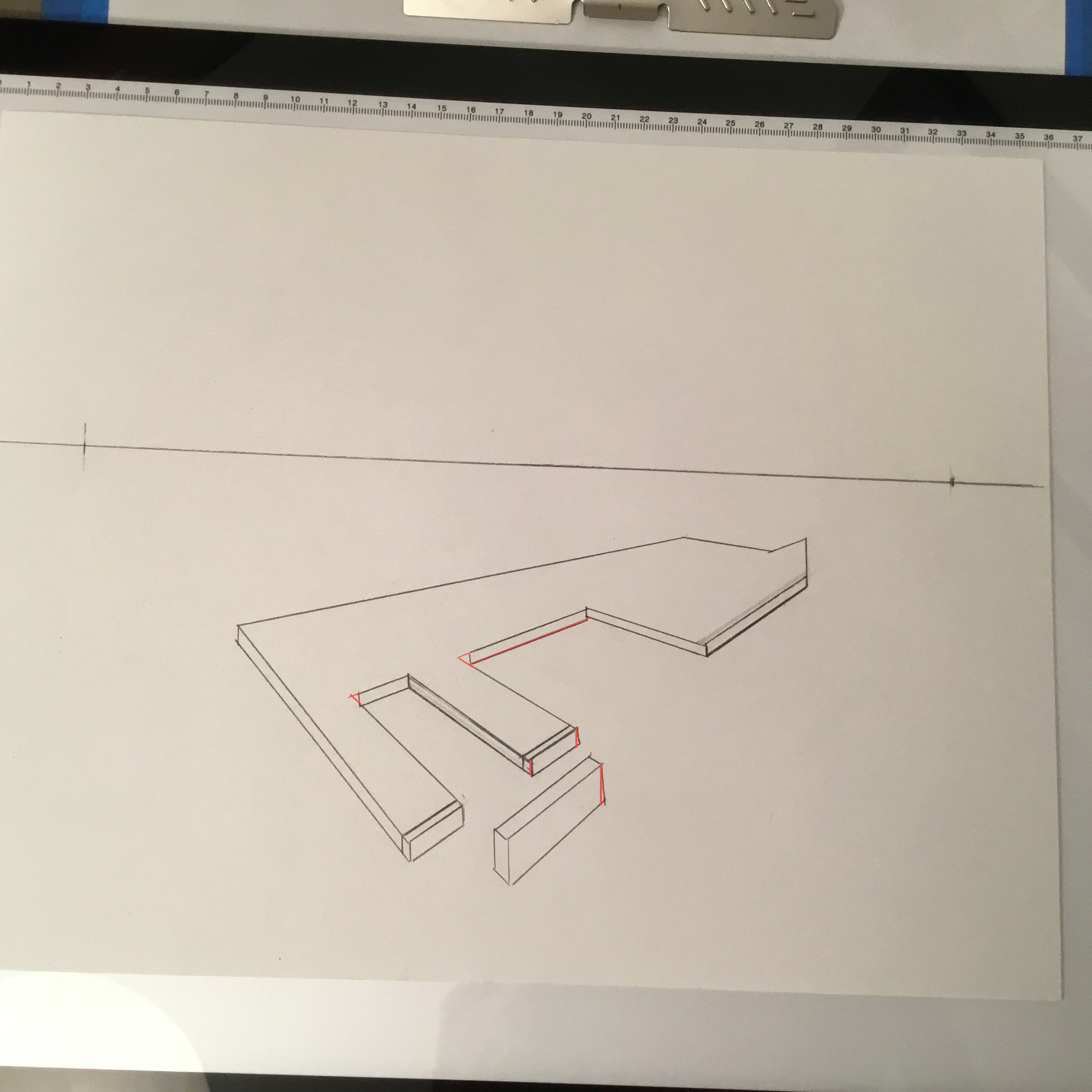 Tu as pris une feuille, tracé la forme en perspective puis ajouté une ligne d'horizon avec deux points de fuite c'est ça ?