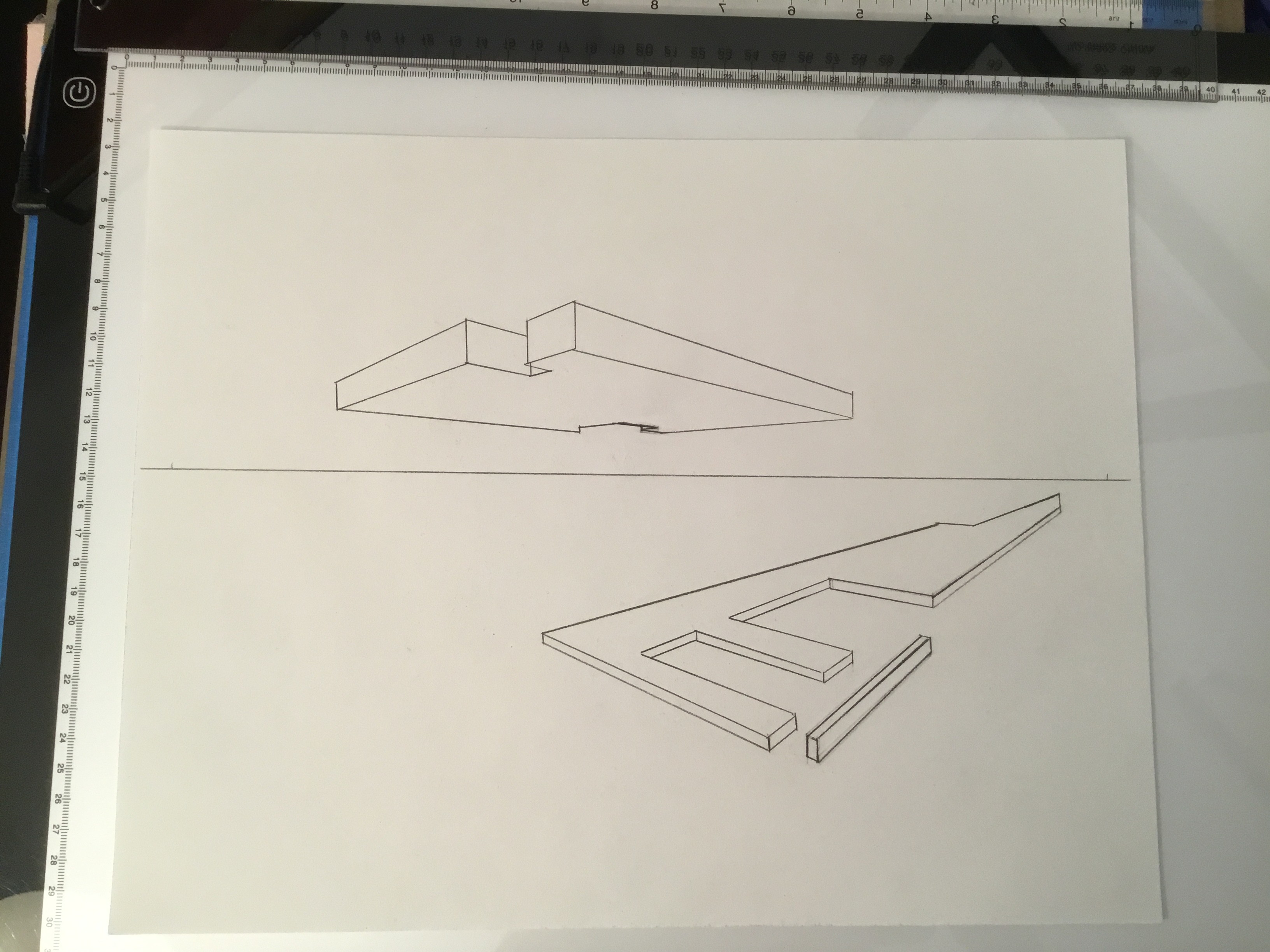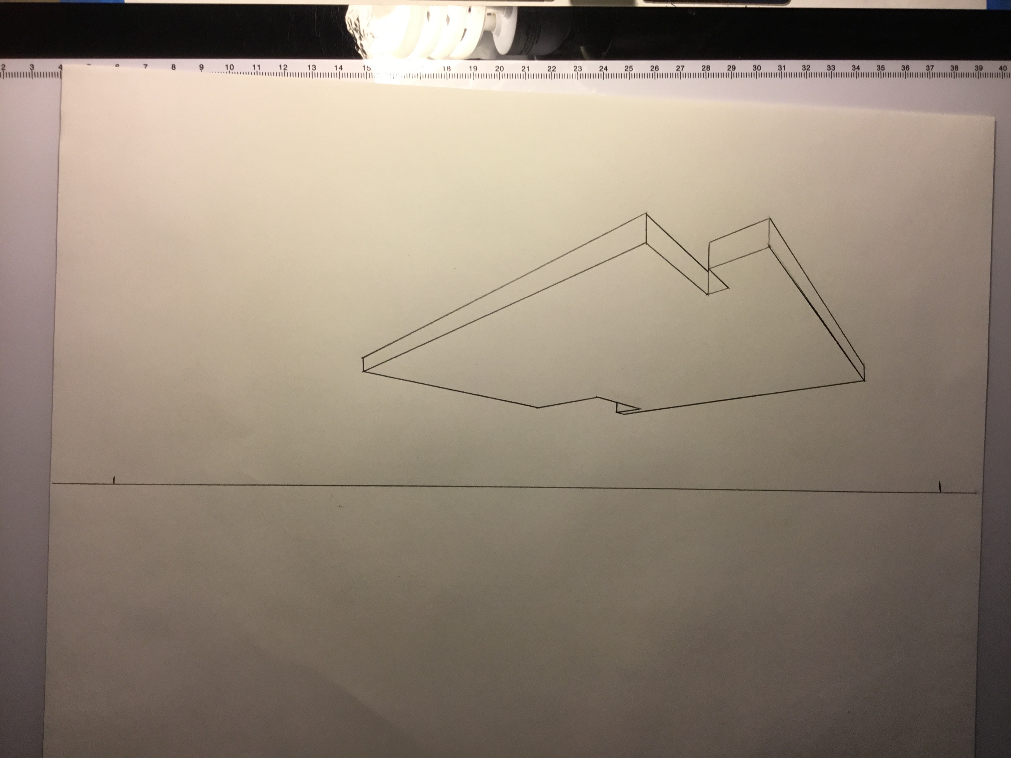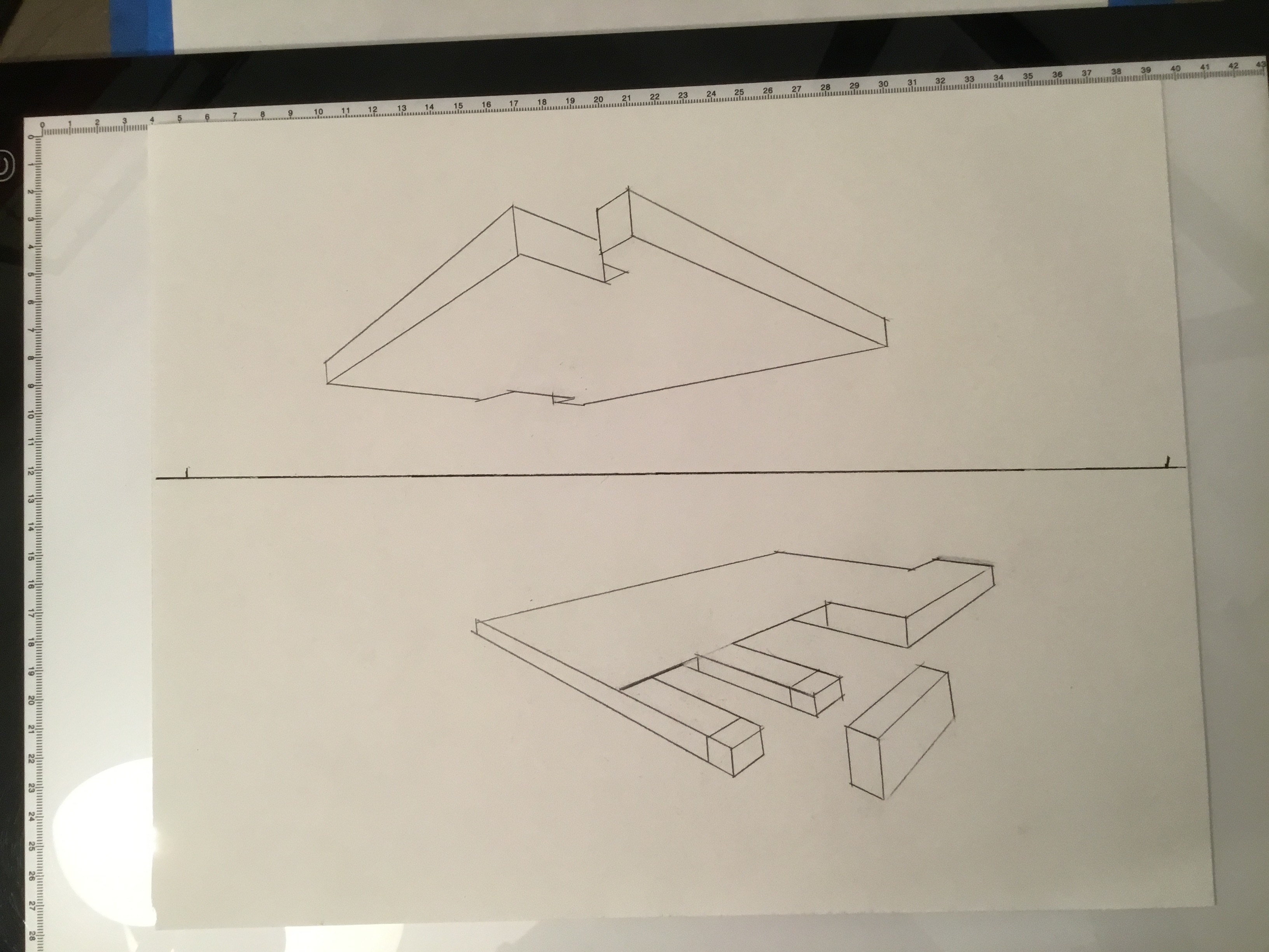 Tu as pris une feuille, tracé la forme en perspective puis ajouté une ligne d'horizon avec deux points de fuite c'est ça ?