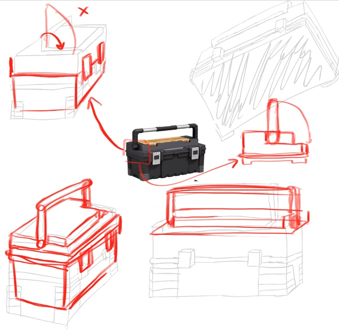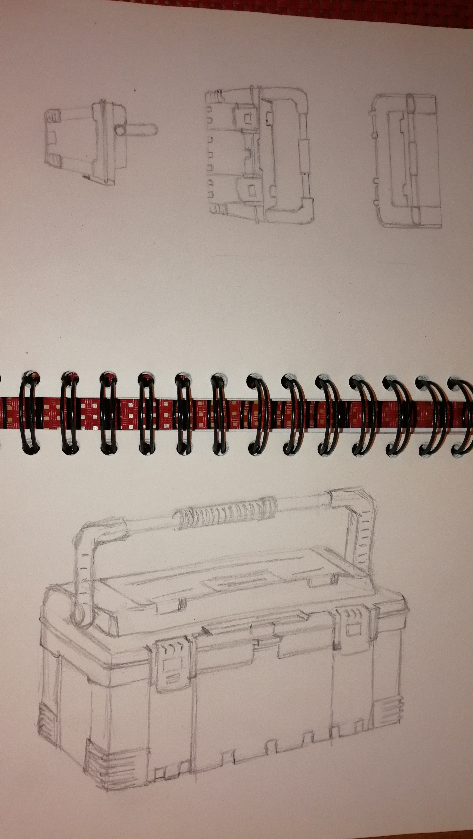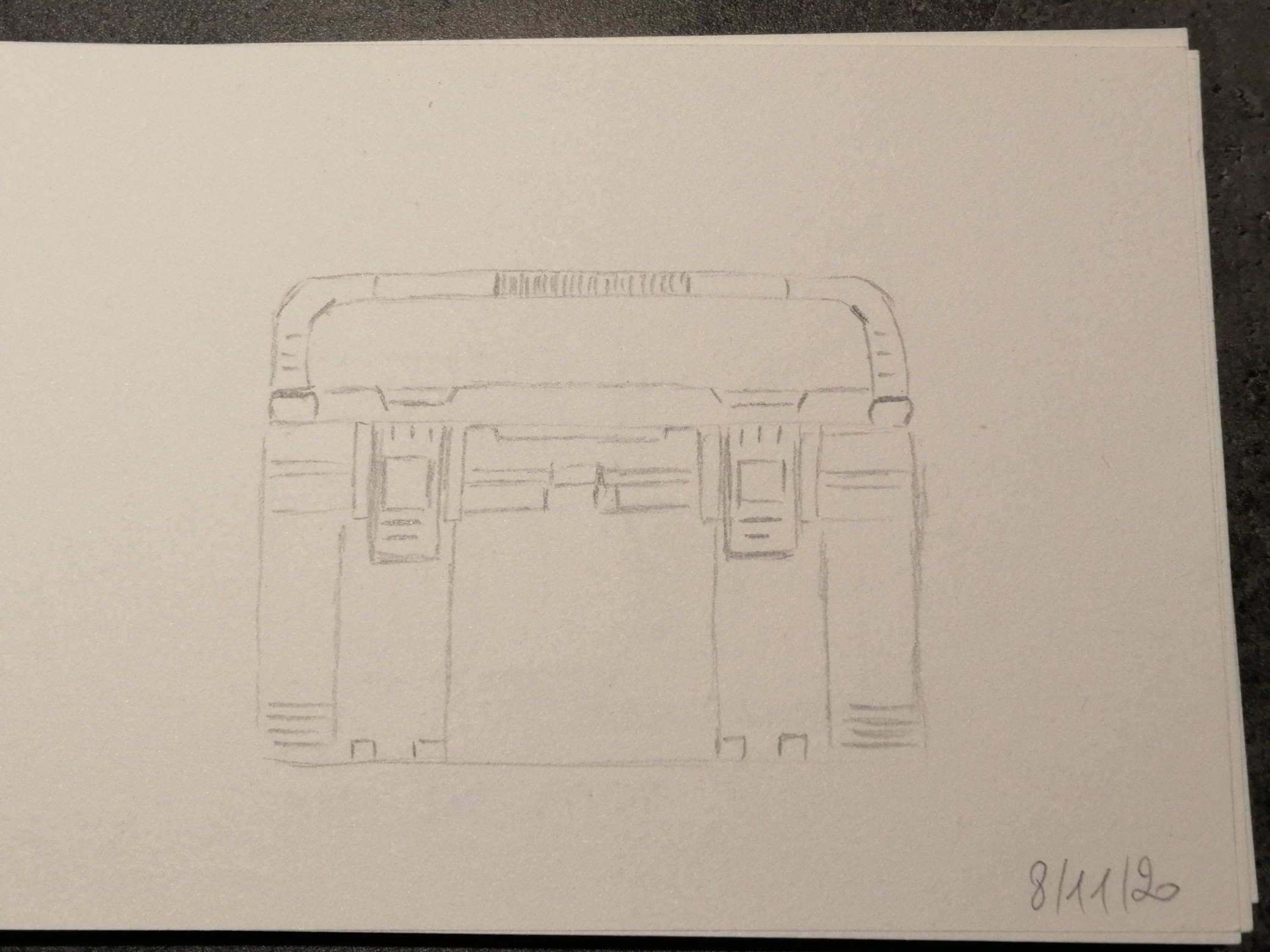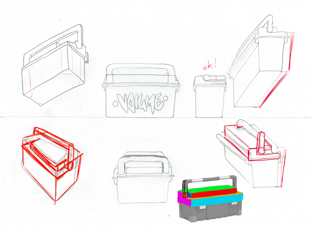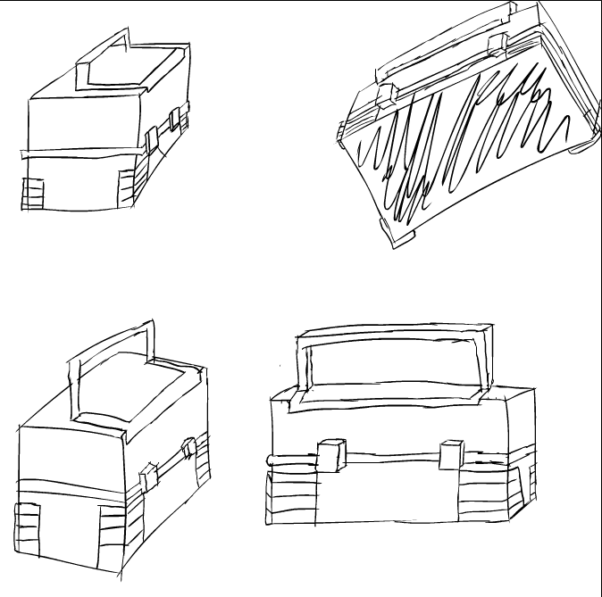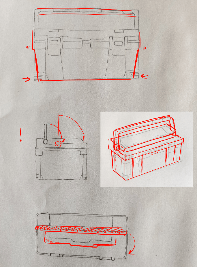 - cafouillage de compréhension des volumes au niveau de la poignée. Regarde de nouveau le modèle, tu verras que la poignée fait toute la largeur de la mallette, elle ne s'inscrit pas à l'intérieur comme tu l'as fait ici. C'est presque ça sur ton premier dessin, mais sur celui à droite et du bas tu fais un volume super large pour la poignée (?) que je ne comprends pas trop. On dirait presque que tu t'es embrouillé en prenant référence sur ton premier dessin au lieu de reregarder la ref.