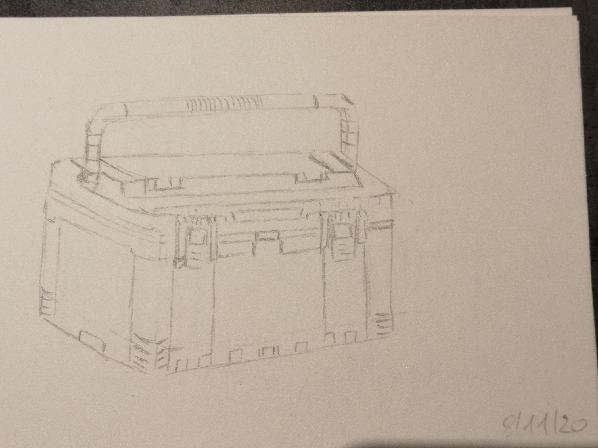Tons seul petit point noir c'est la poignée. Sur quasiment toutes tes vues, si on l'imagine se refermer, on constate qu'elle dépasserait du couvercle alors que celui si est justement conçu pour accueillir la poignée repliée. Selon les vues, ça vient soit du fait qu'elle est trop grande/longue, soit du fait que tu as placé sa base un peu trop en avant sur ta boîte. Tu as aussi un petit souci de proportions sur ta vue du dessous.