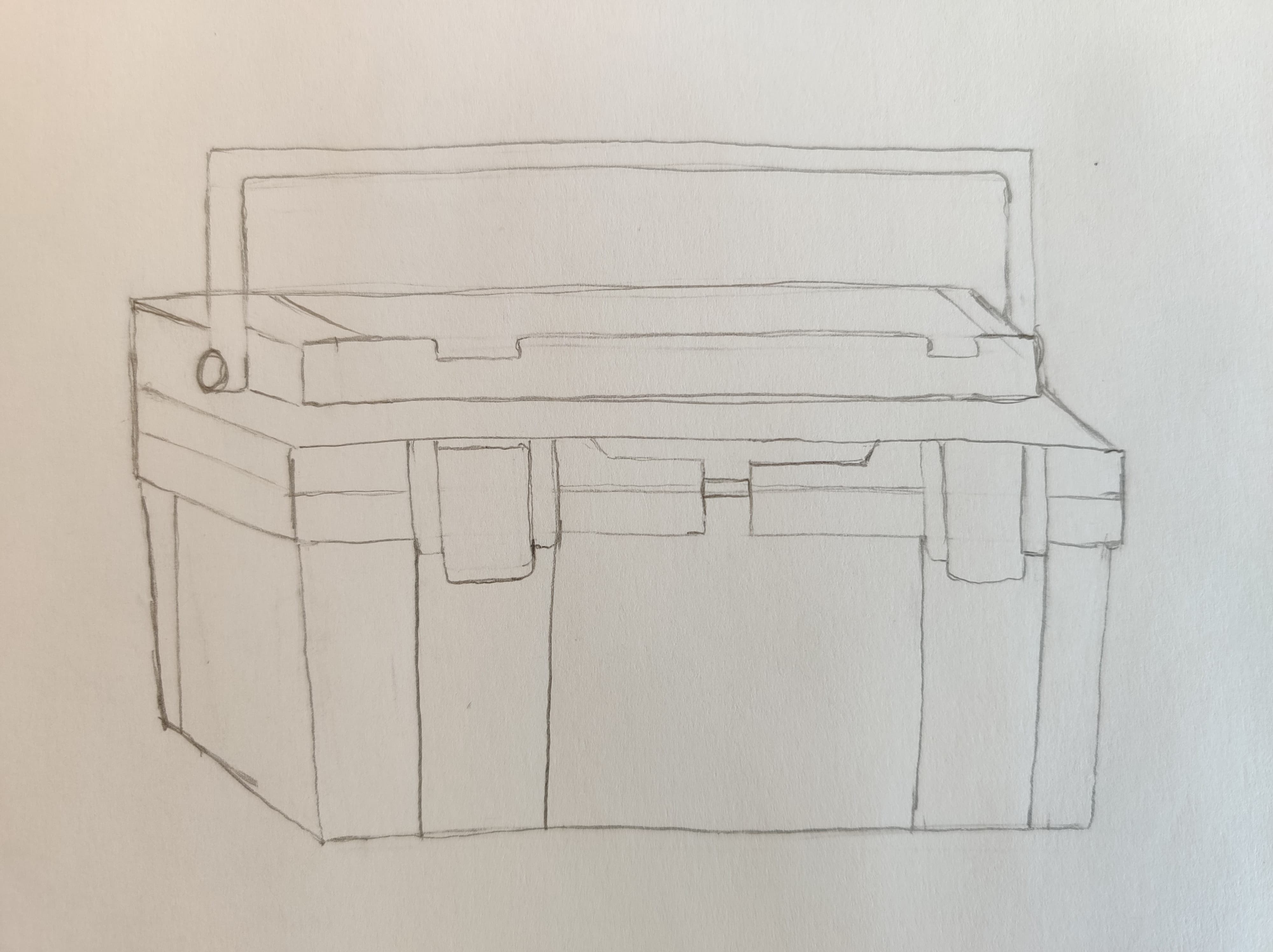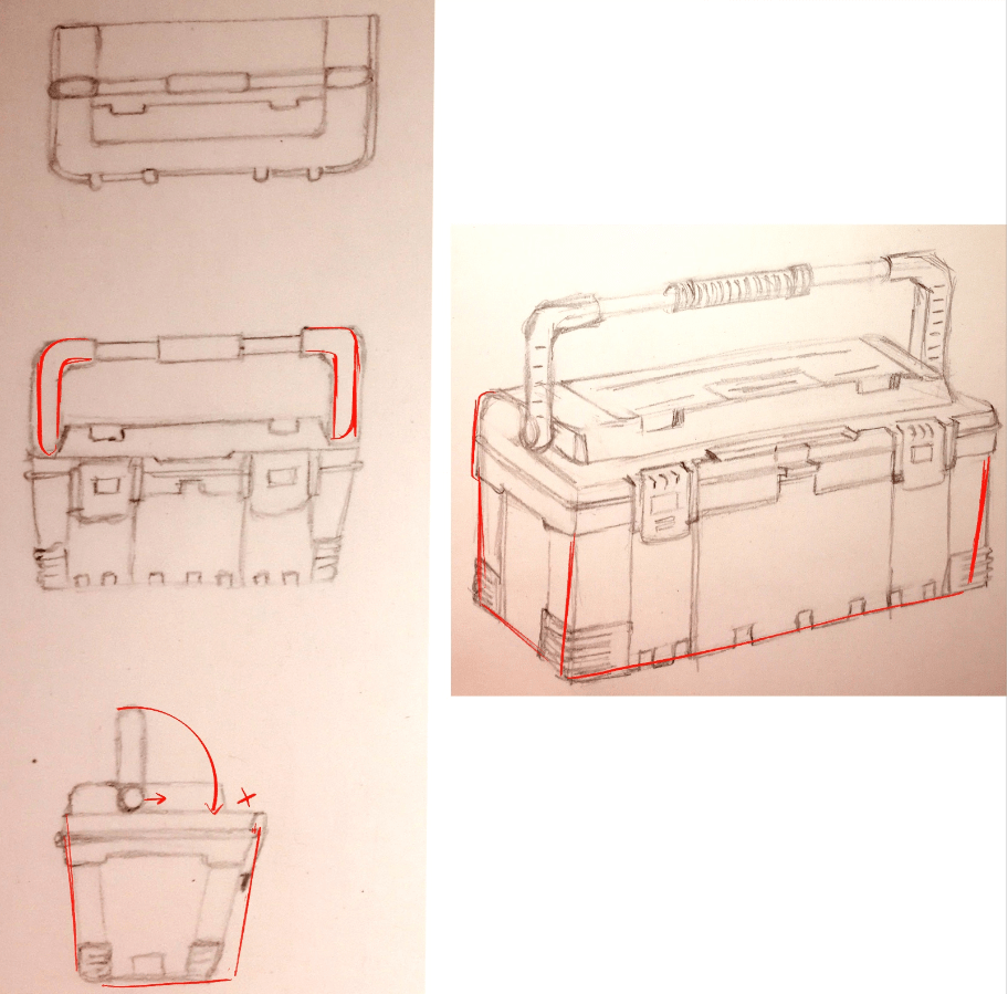 Ta perspective en bas à gauche semble très accentuée et pas très droite, en terme de proportions tu as eu tendance à faire ta mallette un poil trop fine. Et en terme du volume du couvercle, tu as assez bien compris le truc mais on dirait que quelques nuances de volumes t'ont échappé... j'ai essayé de te corriger ça rapidement, et je t'ai mis quelques couleurs sur la ref pour que ce soit plus clair peut-être !