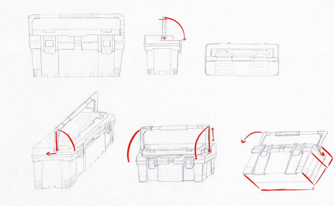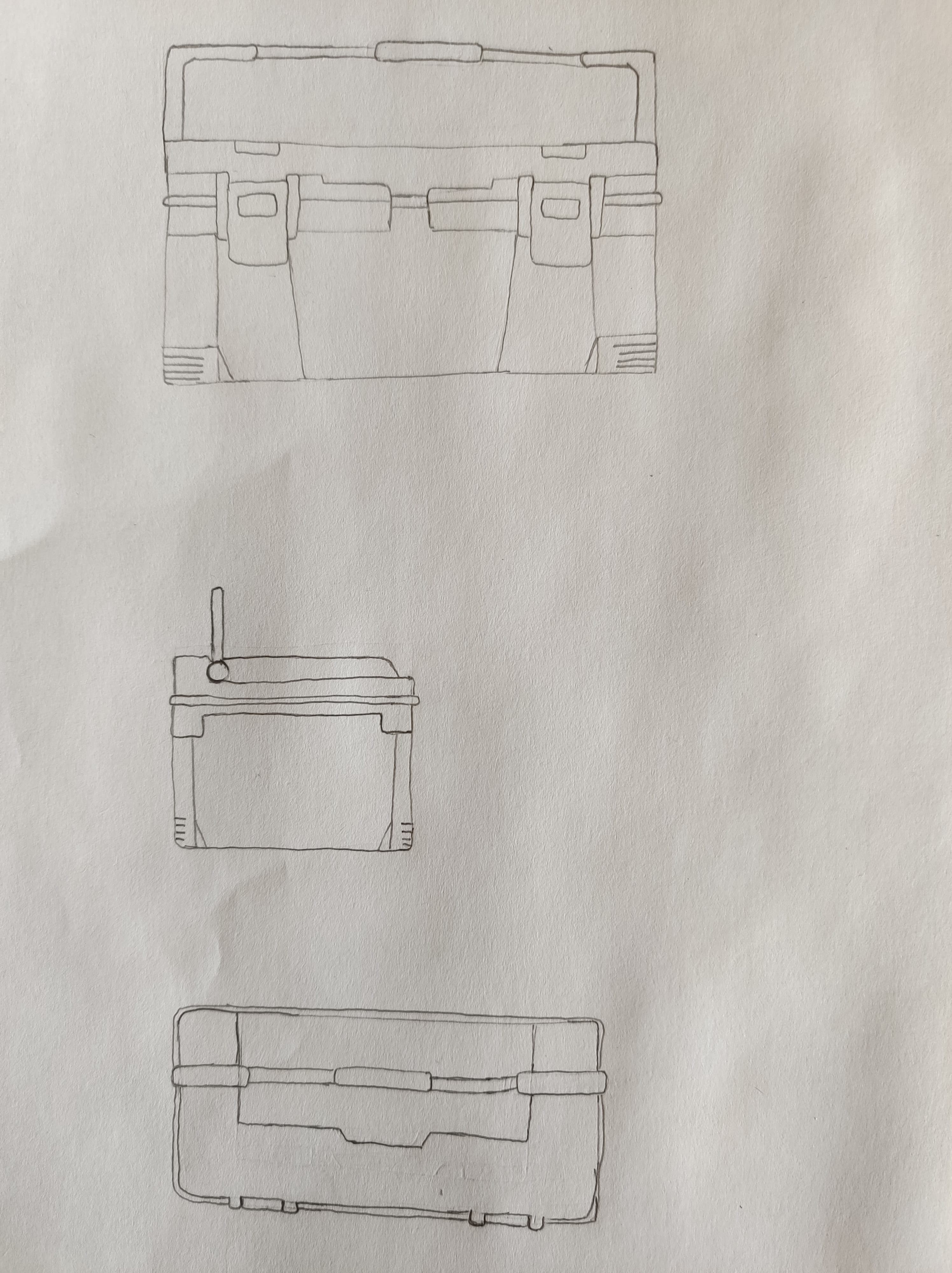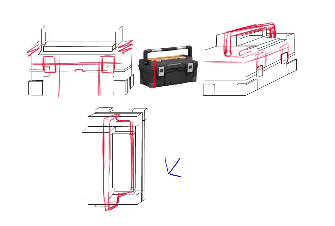 La grosse erreur que je vois c'est ta poignée sur ta vue de profil... Elle ne peut pas du tout se rabattre là ! 😆 La base de la poignée devrait être plus en avant (vers le milieu) et la poignée elle-même devrait être plus longue, pour pouvoir se rabattre correctement au bout du couvercle conçu pour ça 😉