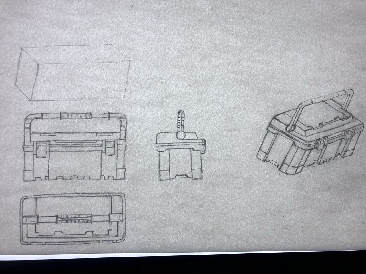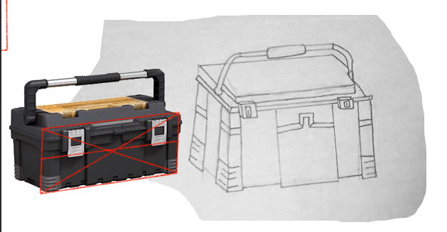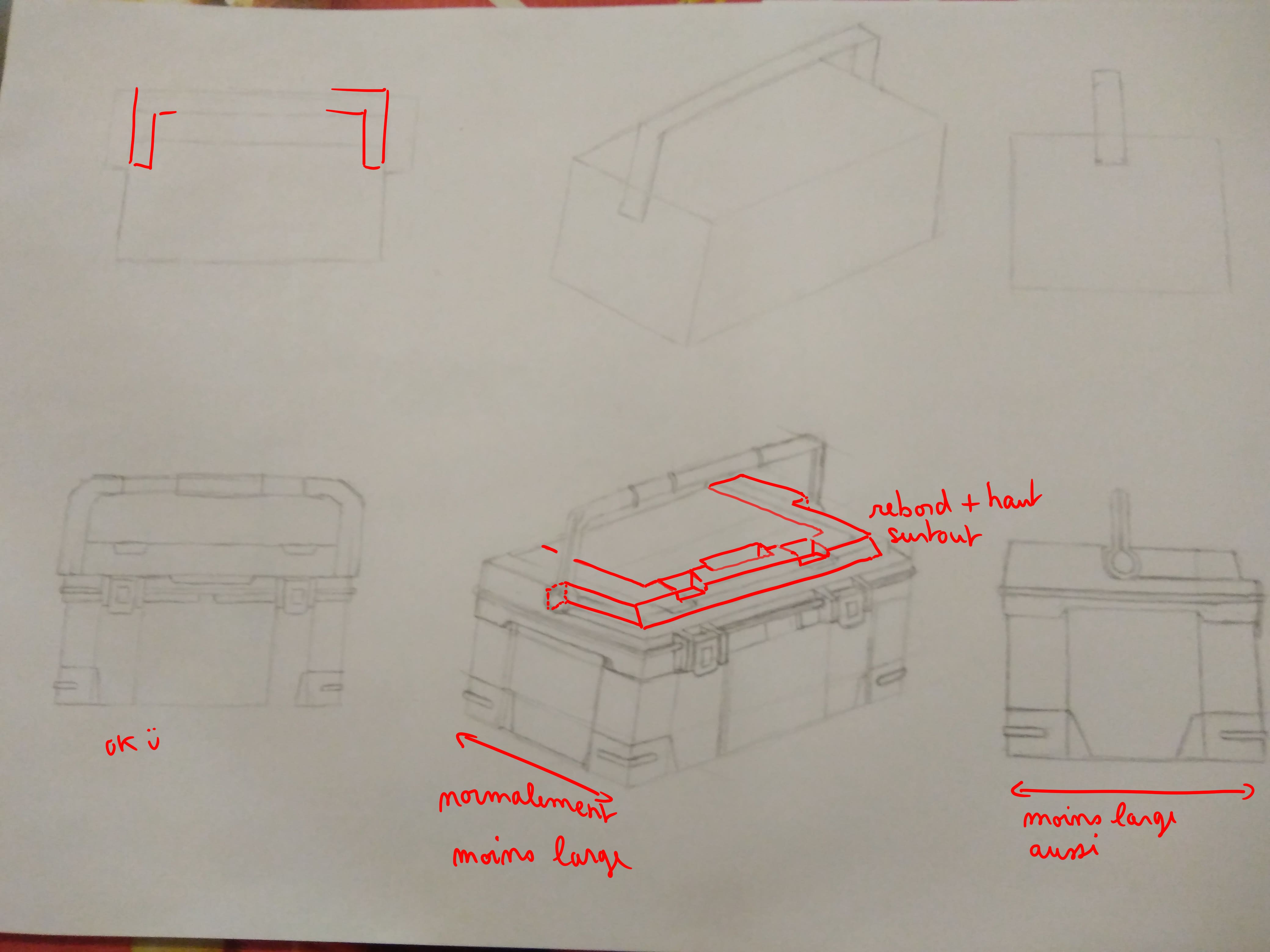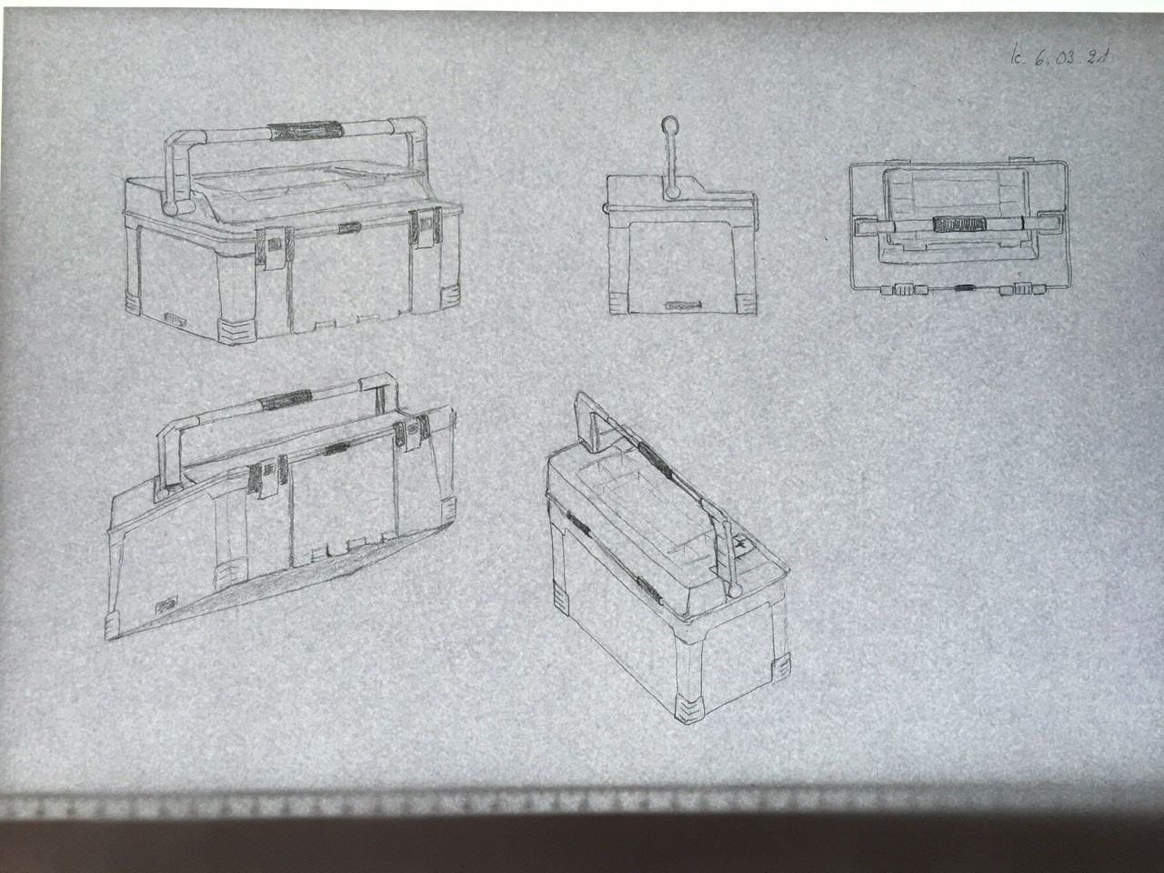 Tu es beaucoup allée dans les détails, ce n'est pas un mal puisque tu t'en es bien sortie, mais il manque juste une petite rigueur dans le trait car là, notamment sur tes deux vues du haut, ta boite à outils semble un peu "molle" ou "tordue", à cause de la structure qui n'est pas parfaitement droite.