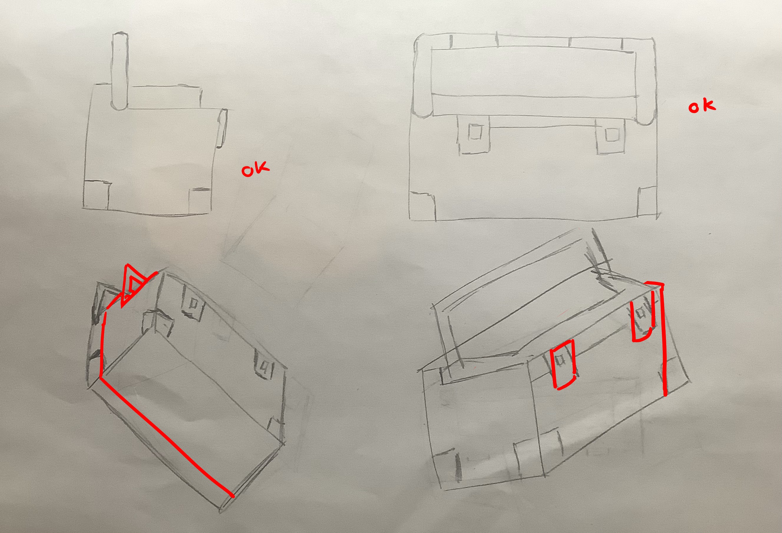 Tes vues 2D sont plutôt bien, à part les boucles de fermeture qui sont bien trop petites et hautes. Si tu regardes la référence, le bas des boucles arrive à peu près au milieu de la hauteur de la boîte.