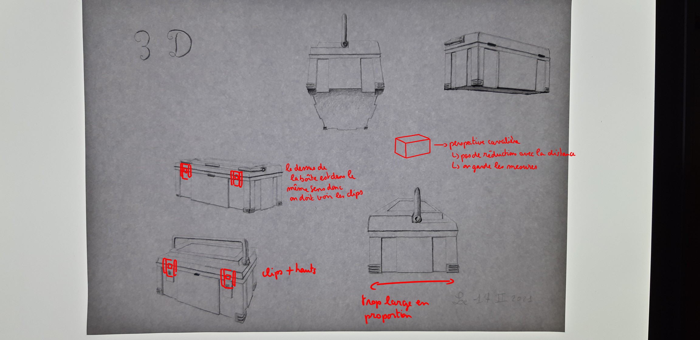 Pour ta vue volume, même chose pour les boucles. Ensuite, ta boîte a tendance à s'évaser vers sa base alors que sur la référence, c'est plutôt l'inverse. Et là encore tes traits en sont pas très droits, notamment sur la poignée... et donc le résultat est un peu tordu !