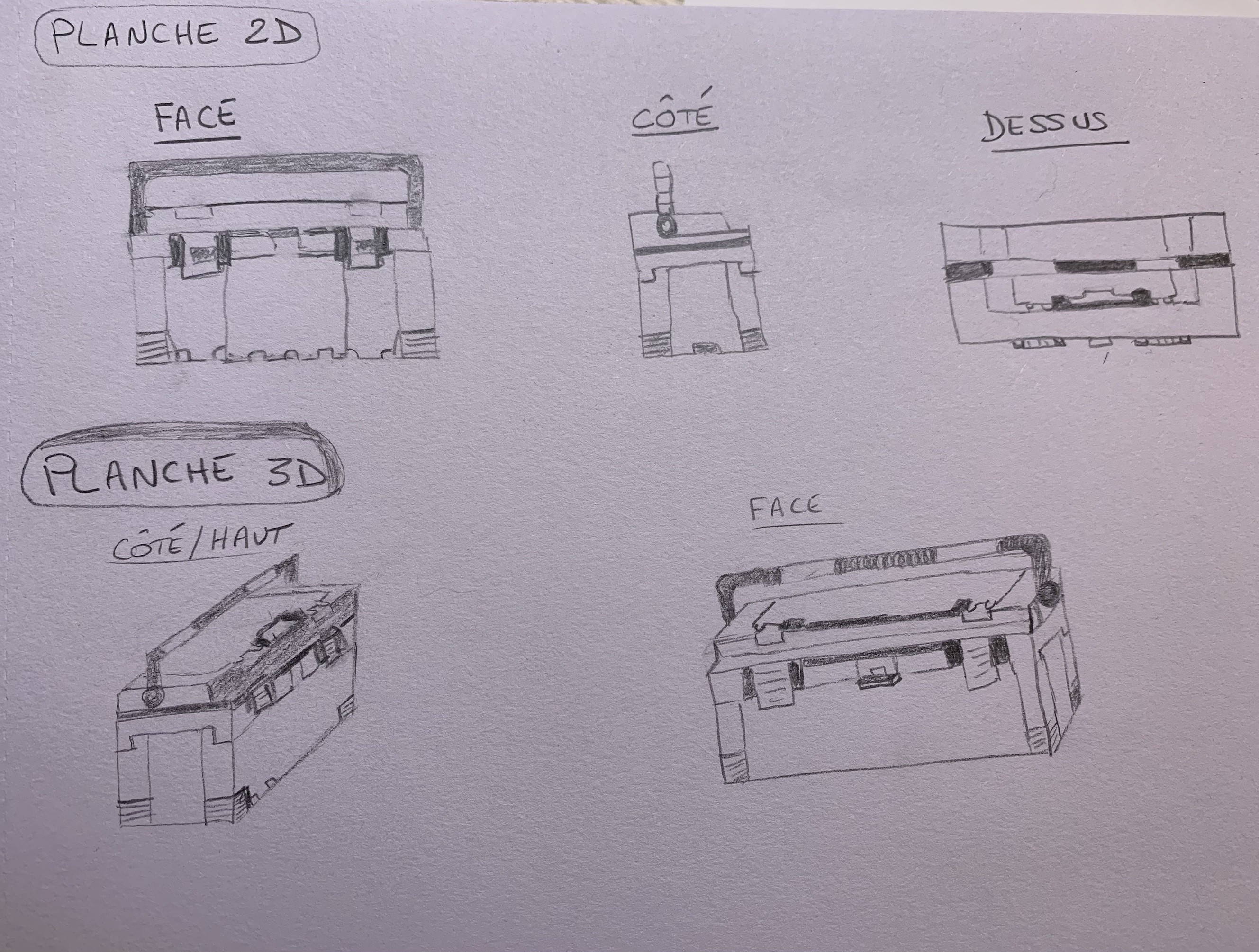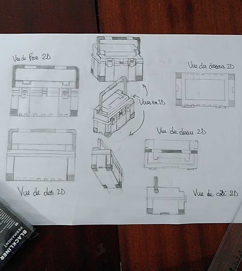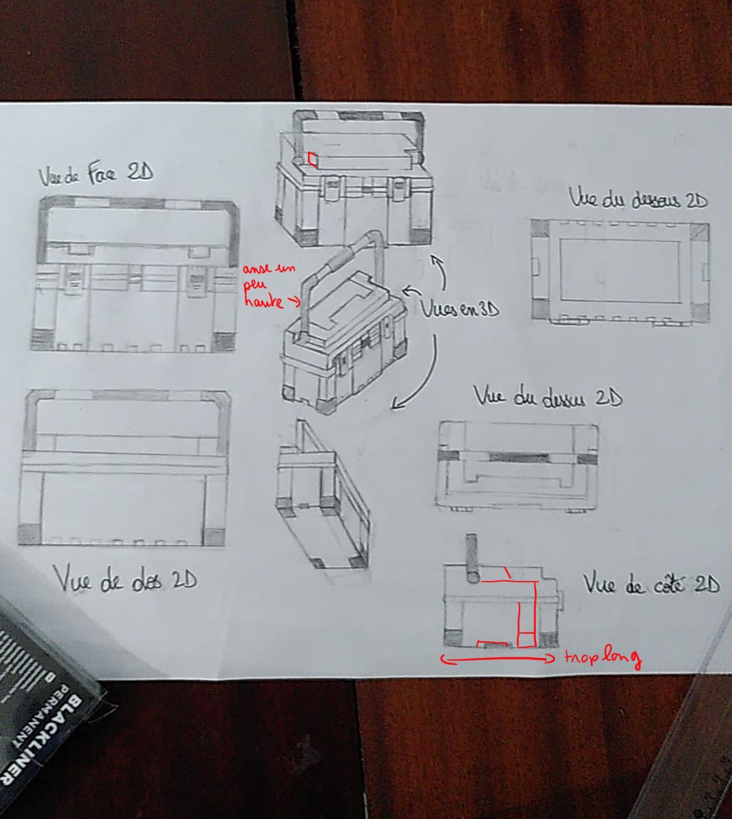Voici mes planches 2D et 3D de la boîte à outils. Merci d'avance pour vos corrections et commentaires.