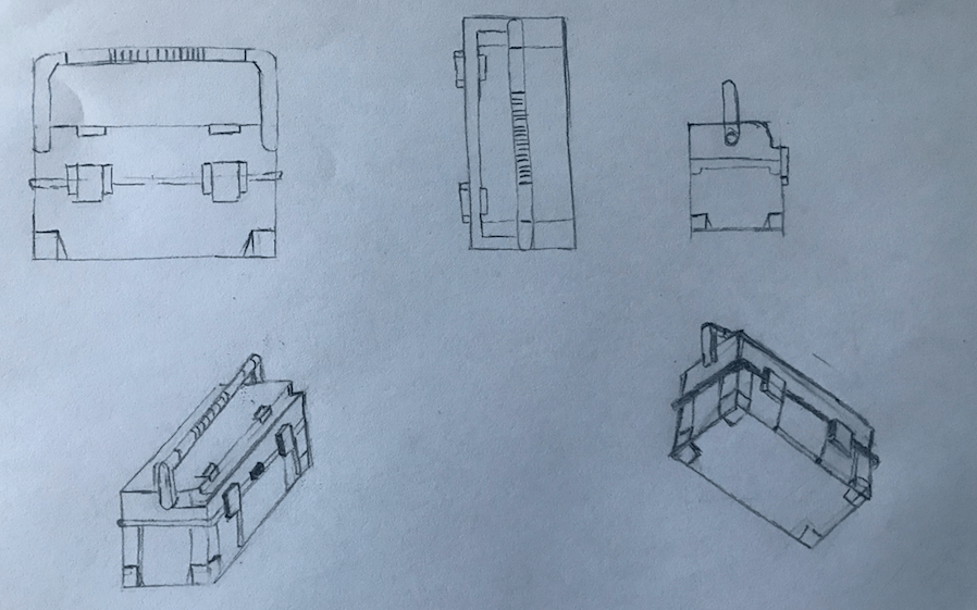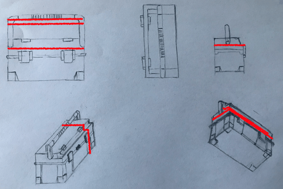 Sur beaucoup de tes vues tu as oublié de marquer la ligne "de base" du couvercle (le plan au dessus des boucles de fermeture et sur lequel est posé la base de la poignée).
