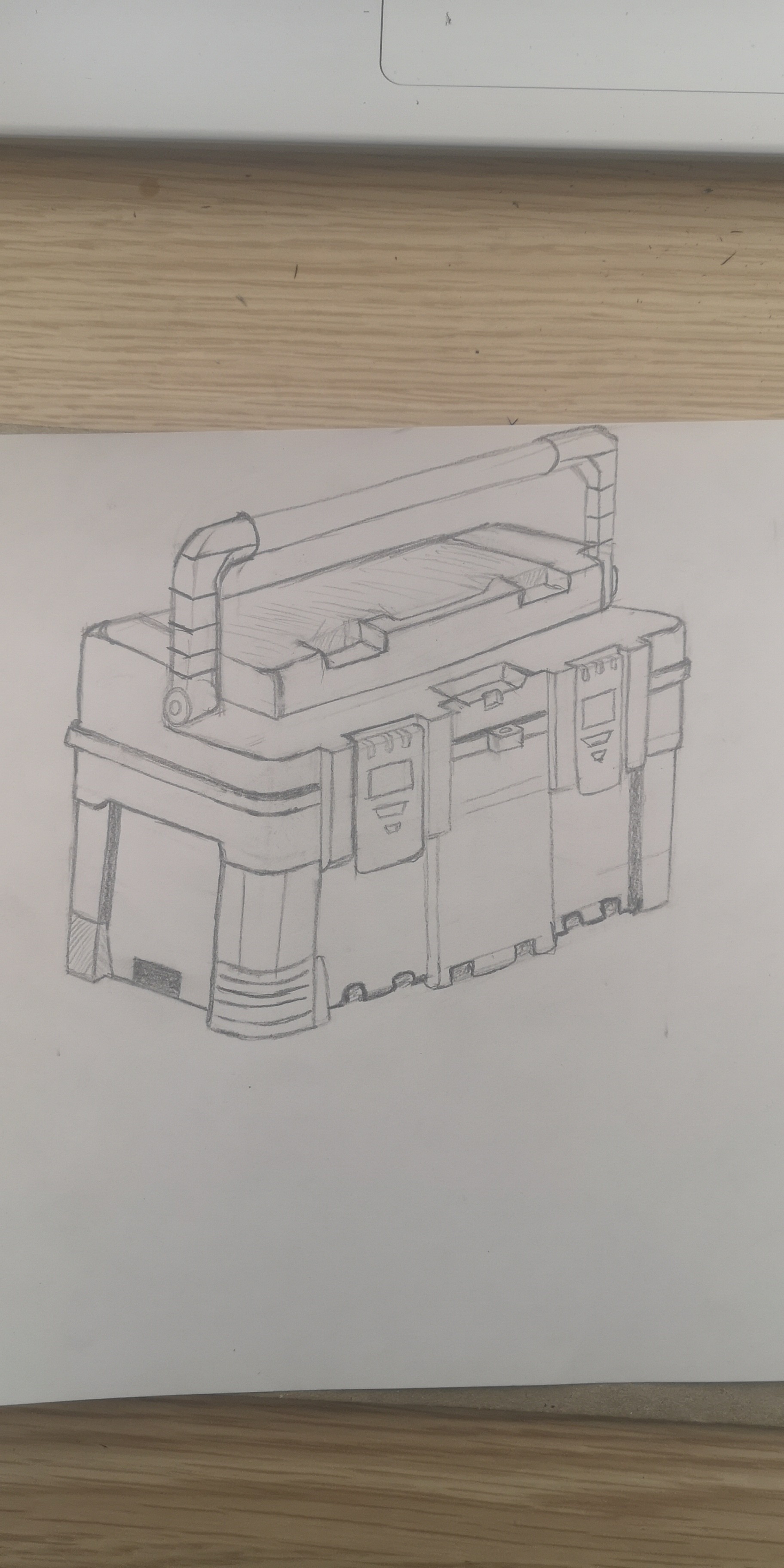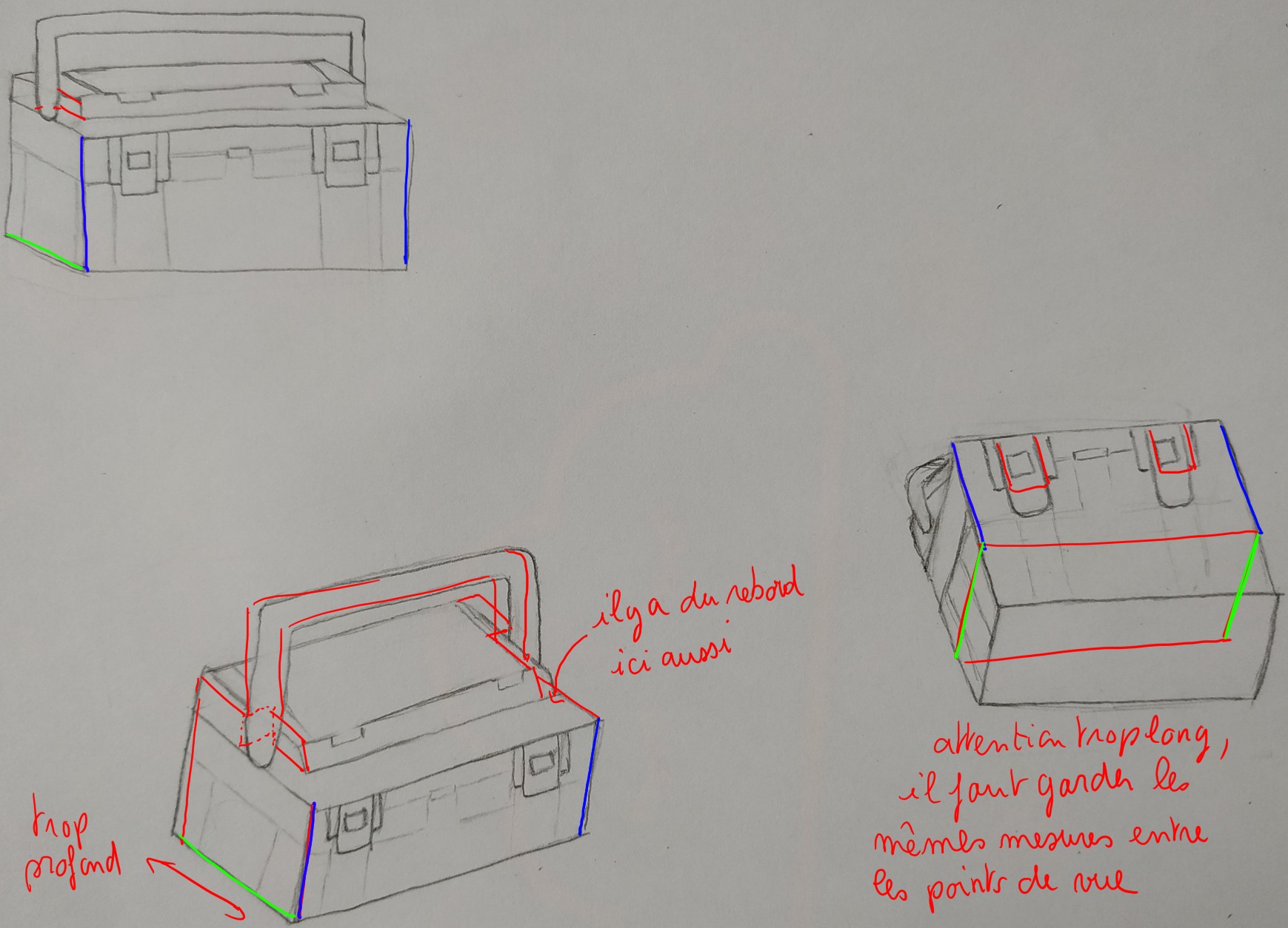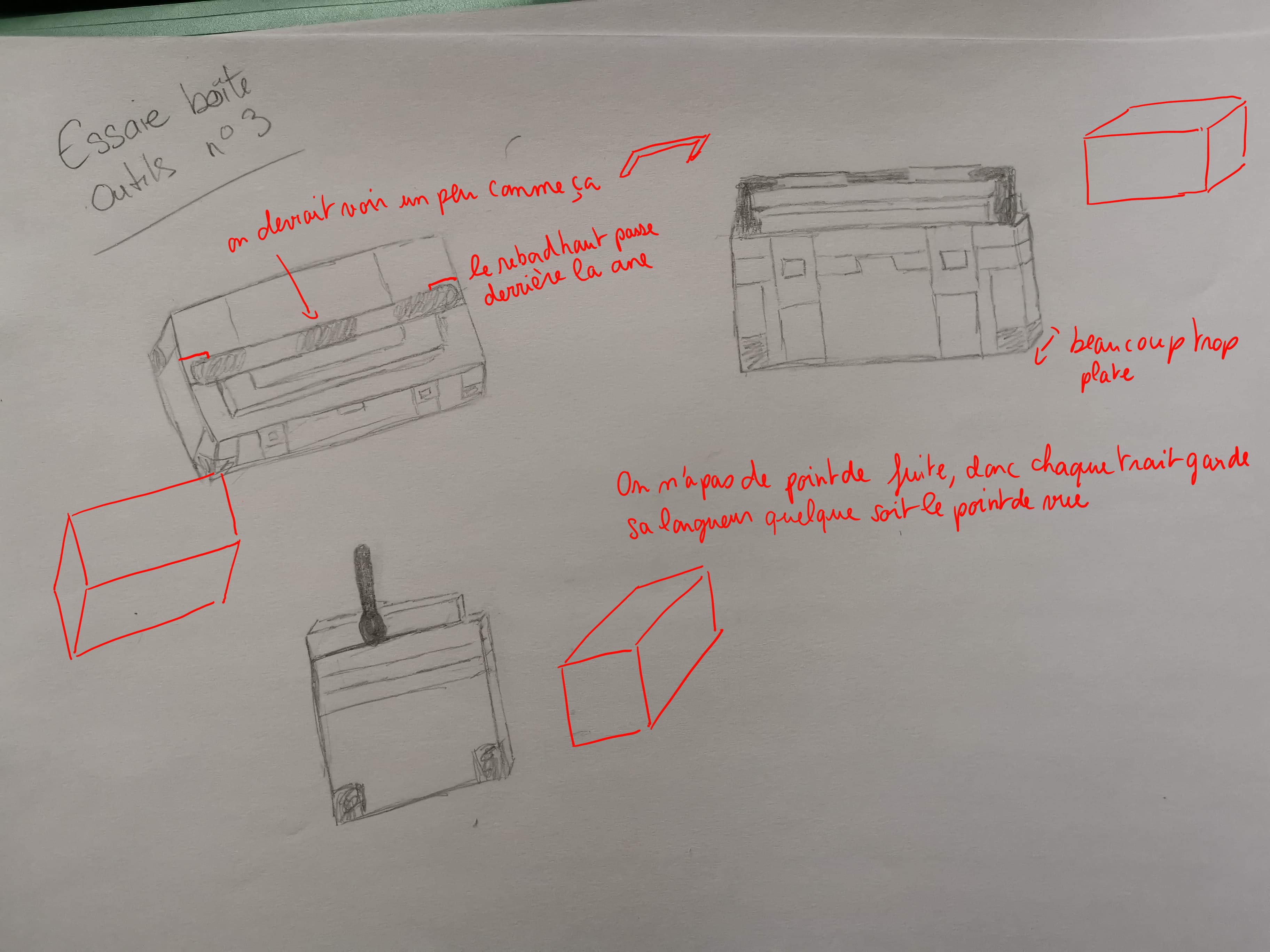 Voila pour ma caisse a outils. Honnetement j'ai bien galéré: j'arrive bien a découper le modèle en des formes très simples (je l'ai fait sur une autre feuille), je pense que le 2D j'ai bien compris. là ou jai du mal c'est pour accorder les formes en volume entre elles. J'ai toujours l'impression que mes formes en volume n'ont pas le meme angle de vue et j'ai du mal a toutes les organiser dans le meme sens...