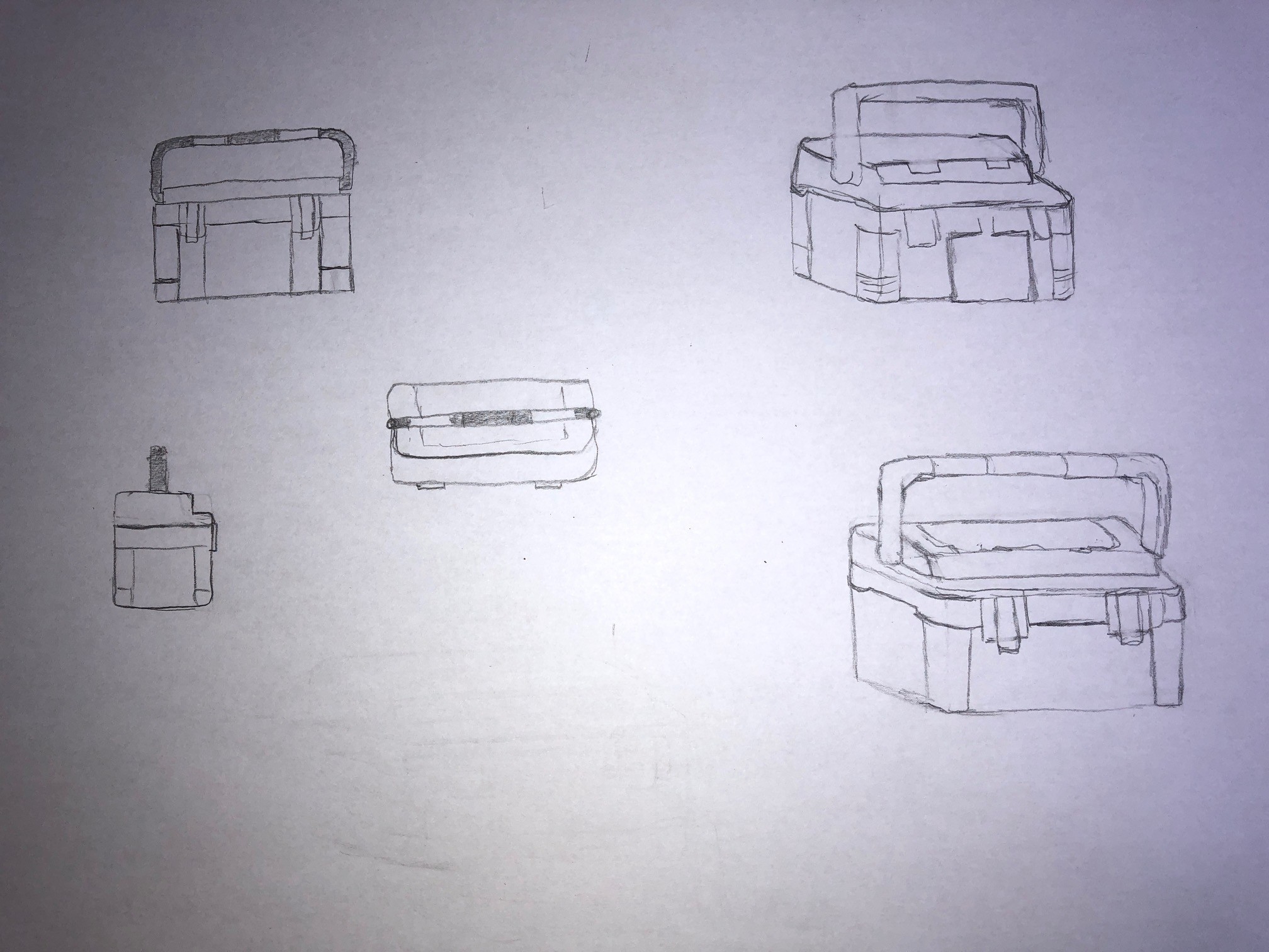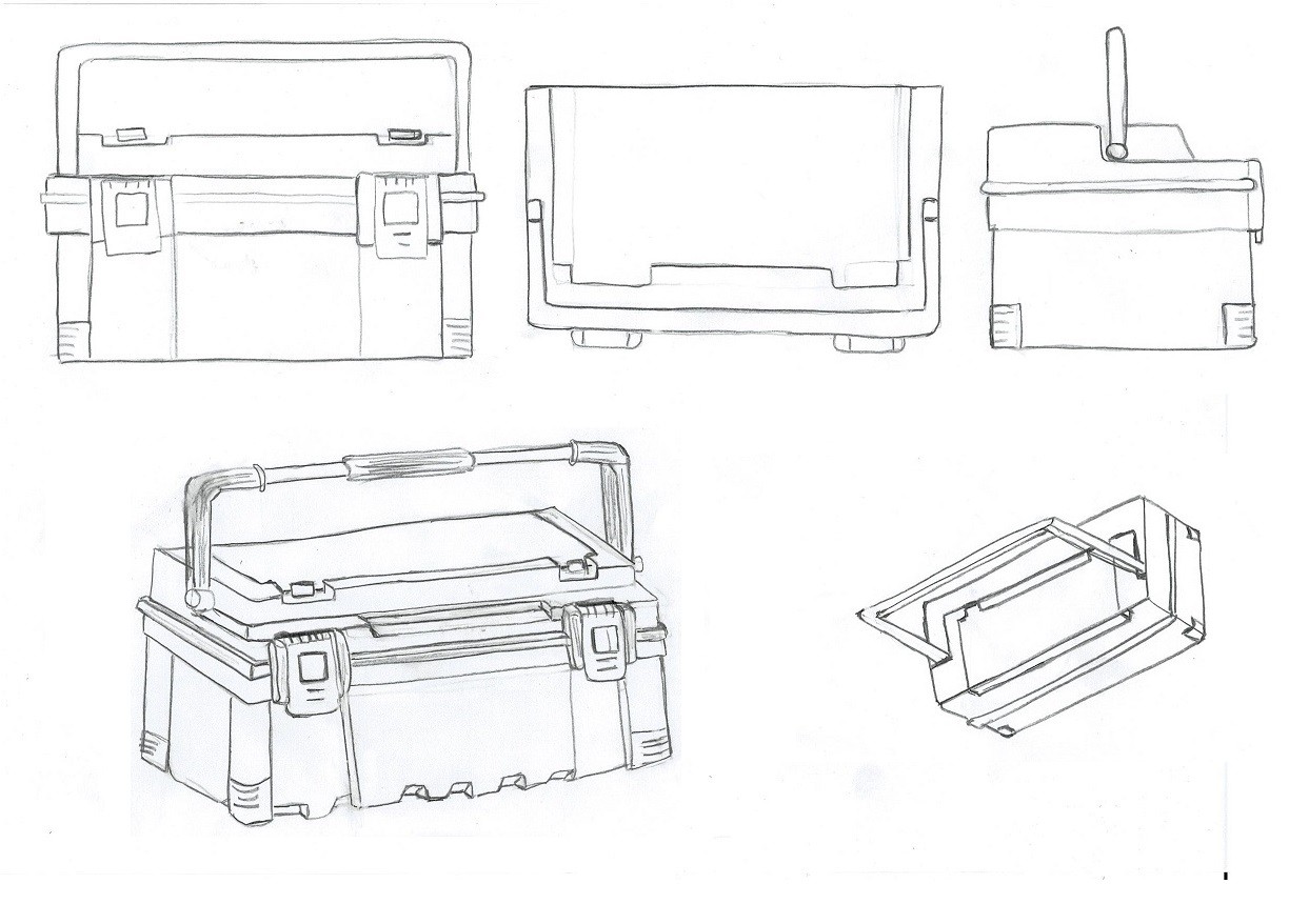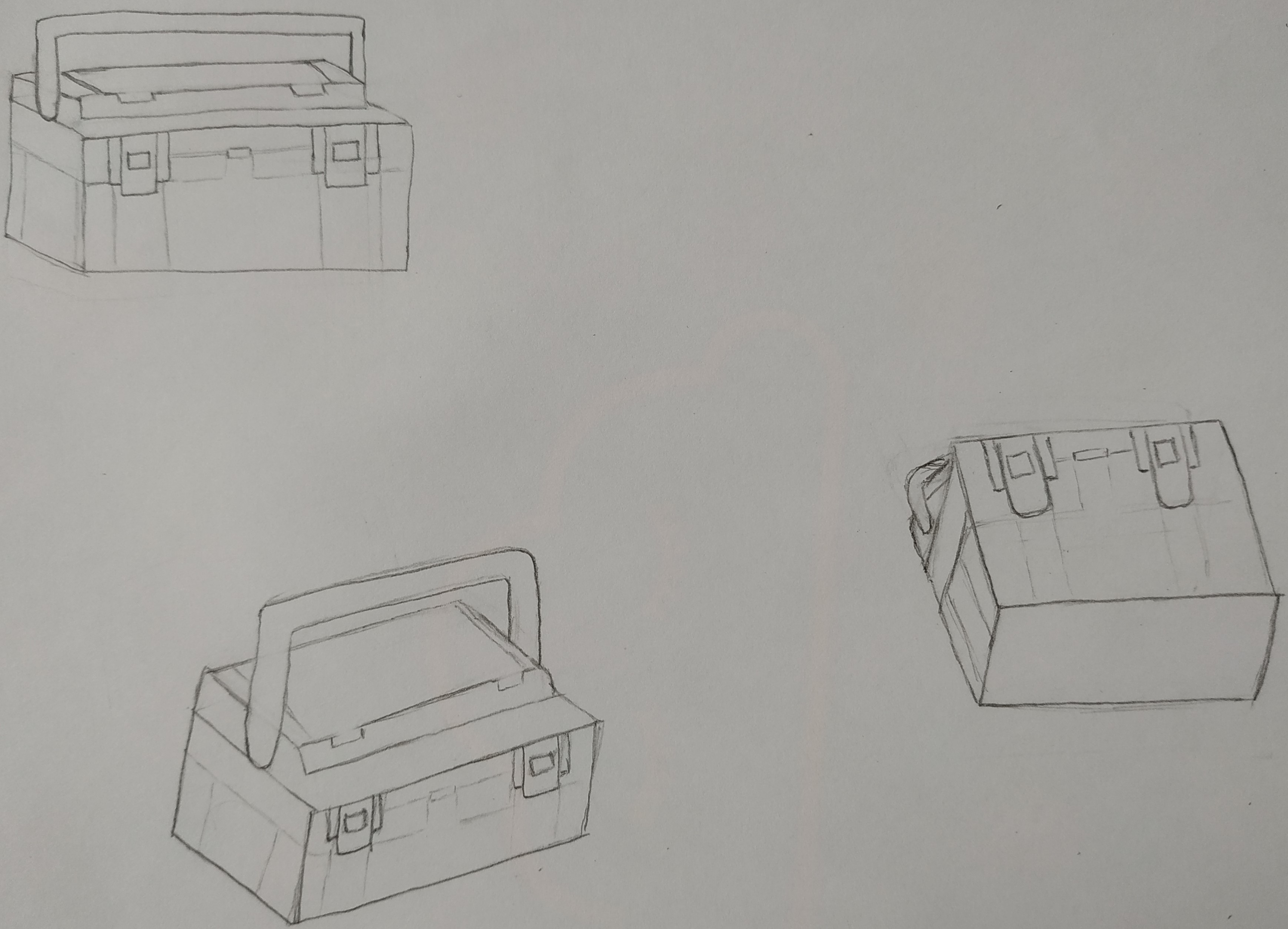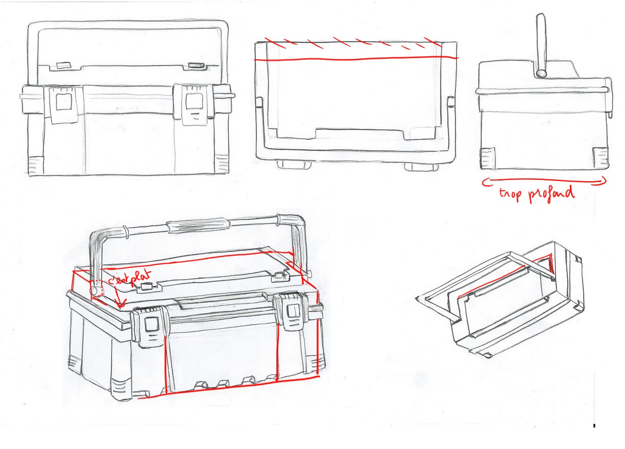 Voila pour ma caisse a outils. Honnetement j'ai bien galéré: j'arrive bien a découper le modèle en des formes très simples (je l'ai fait sur une autre feuille), je pense que le 2D j'ai bien compris. là ou jai du mal c'est pour accorder les formes en volume entre elles. J'ai toujours l'impression que mes formes en volume n'ont pas le meme angle de vue et j'ai du mal a toutes les organiser dans le meme sens...