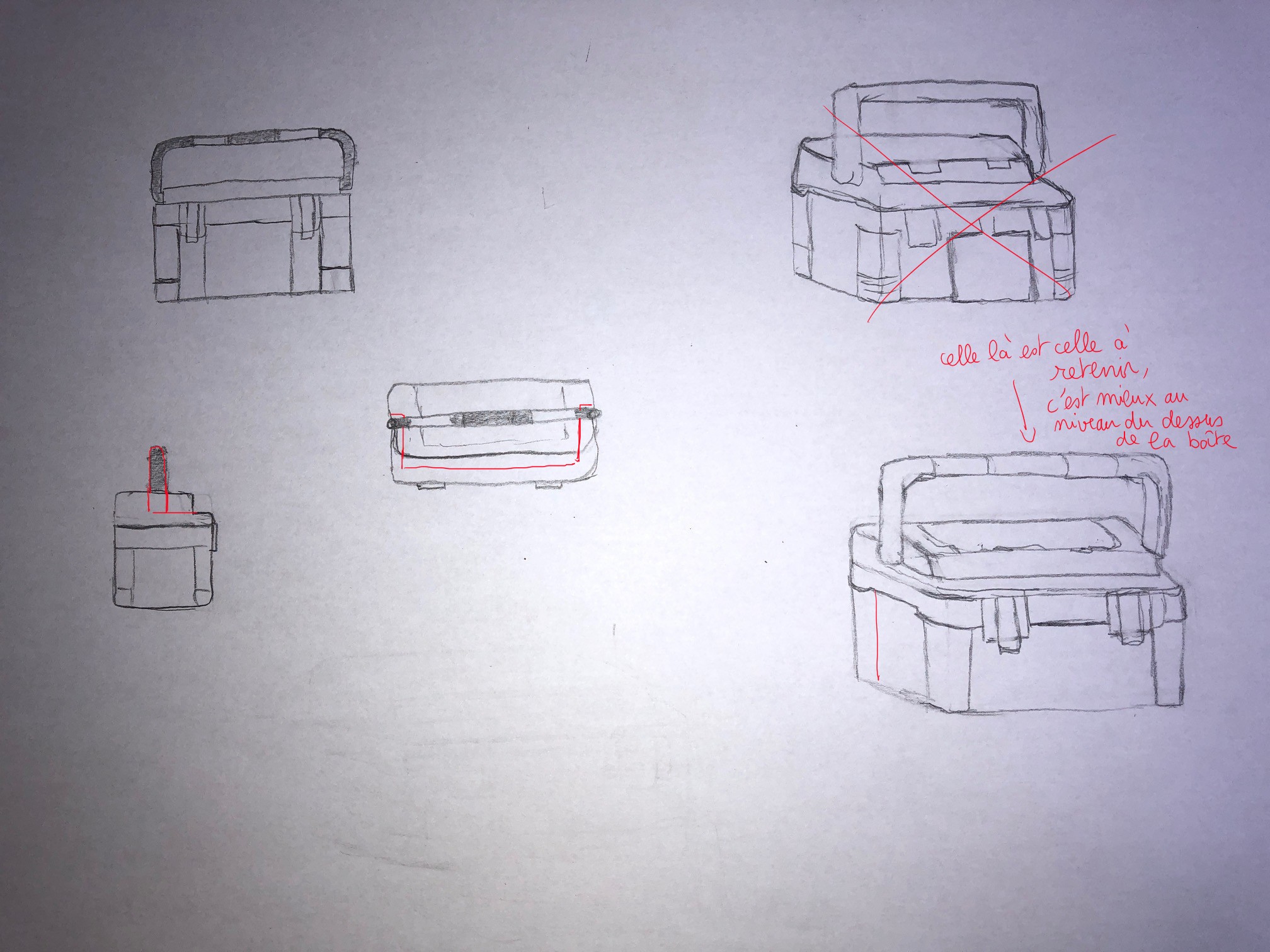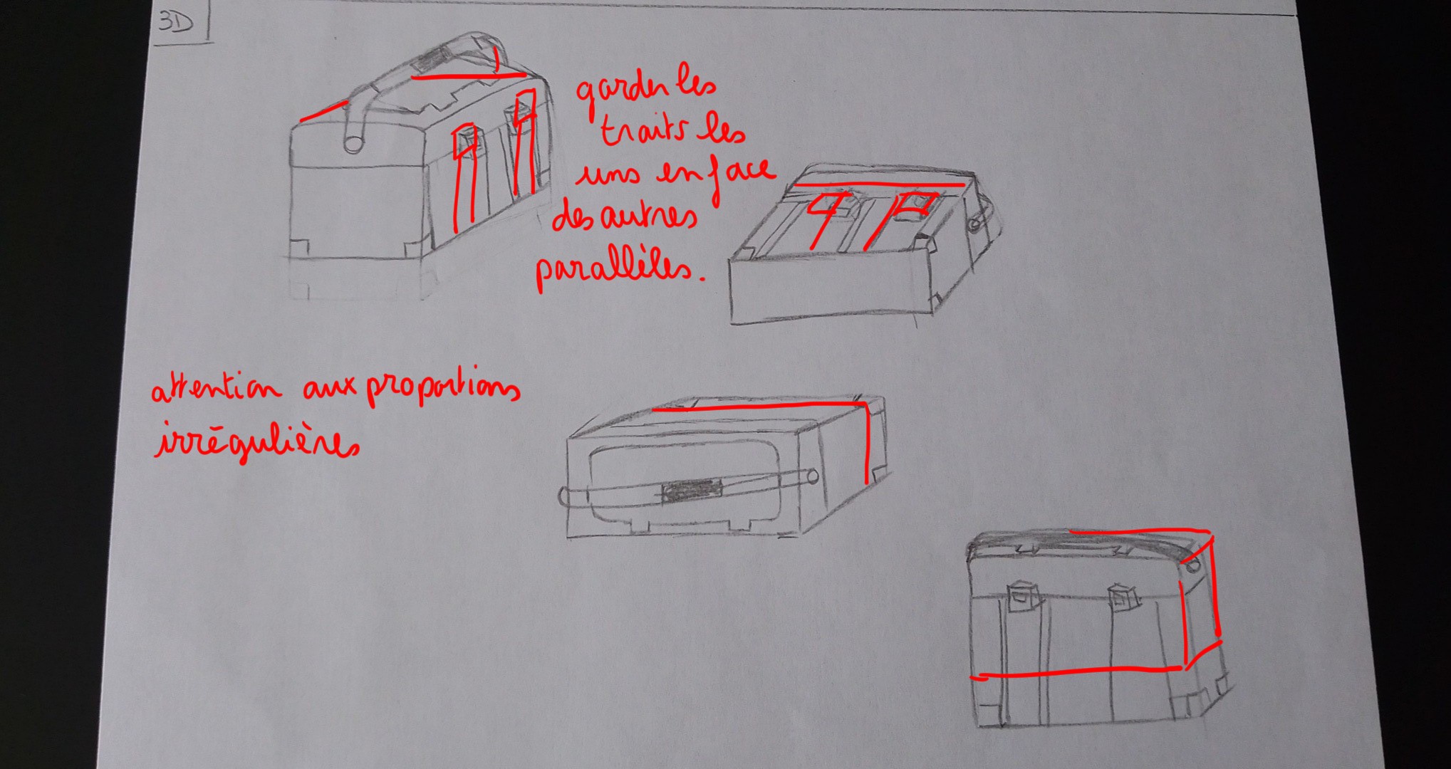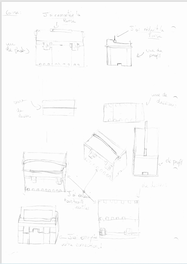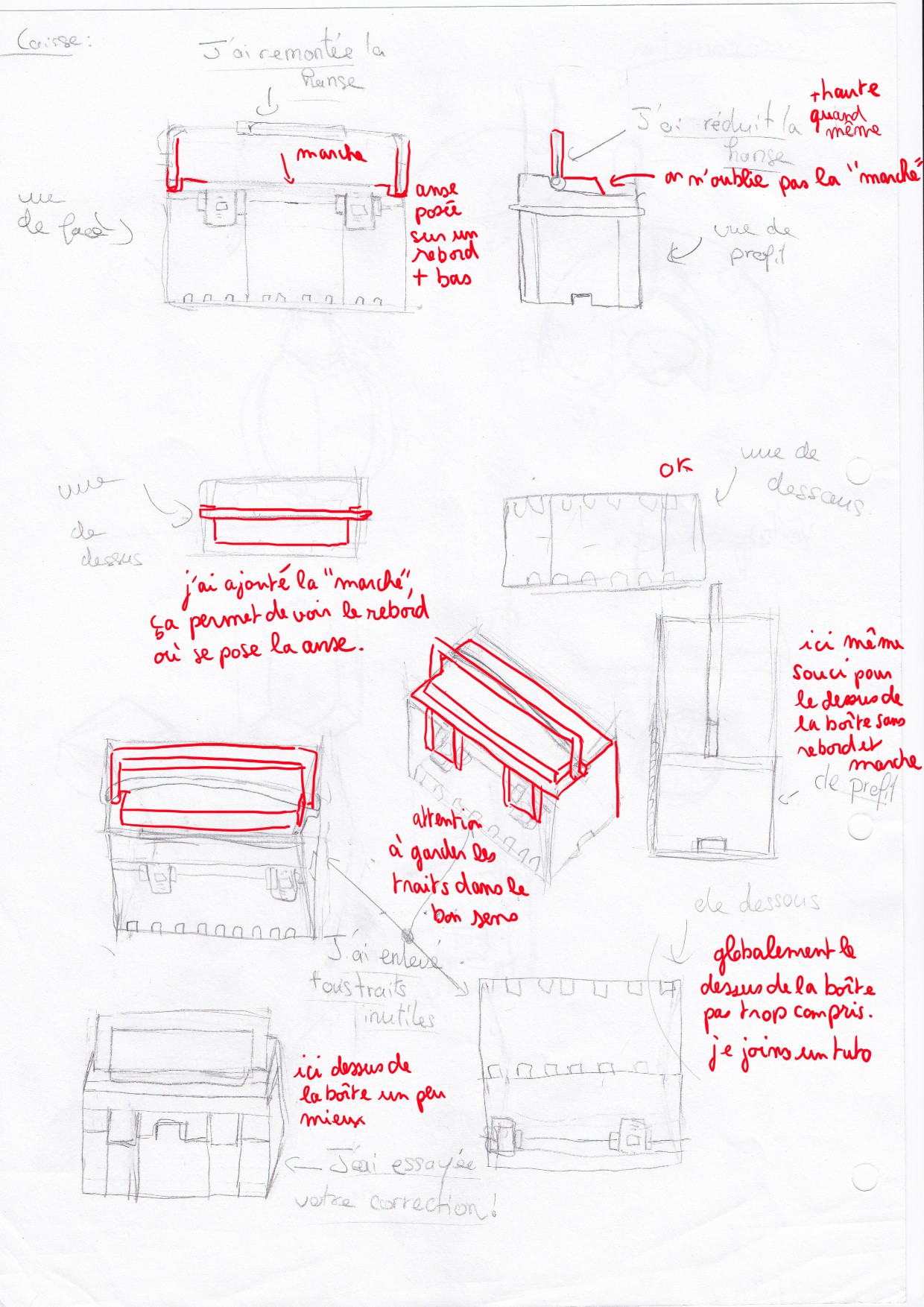 C'est du bon travail, les vues 2D sont pas mal, mais je vois que le dessus de la boîte est mal compris. Il y a un genre de marche qui va jusque serrière la anse, et à l'avant un rebord. Pour ce qui est des vues 3D attention, les proportions sont irrégulières, les différents éléments doivent garder les même dimensions entre chaque vue. Aussi, les traits les uns en face des autres doivent rester parallèles vu qu'ils pointent dans la même direction. On voit aussi une incompréhension du dessus de la boîte, que je n'ai pas corrigée directement sur les dessins, par contre je joins un croquis du dessus de la boîte pour que ça se visualise mieux. J'espère que ça sera plus compréhensible ^^