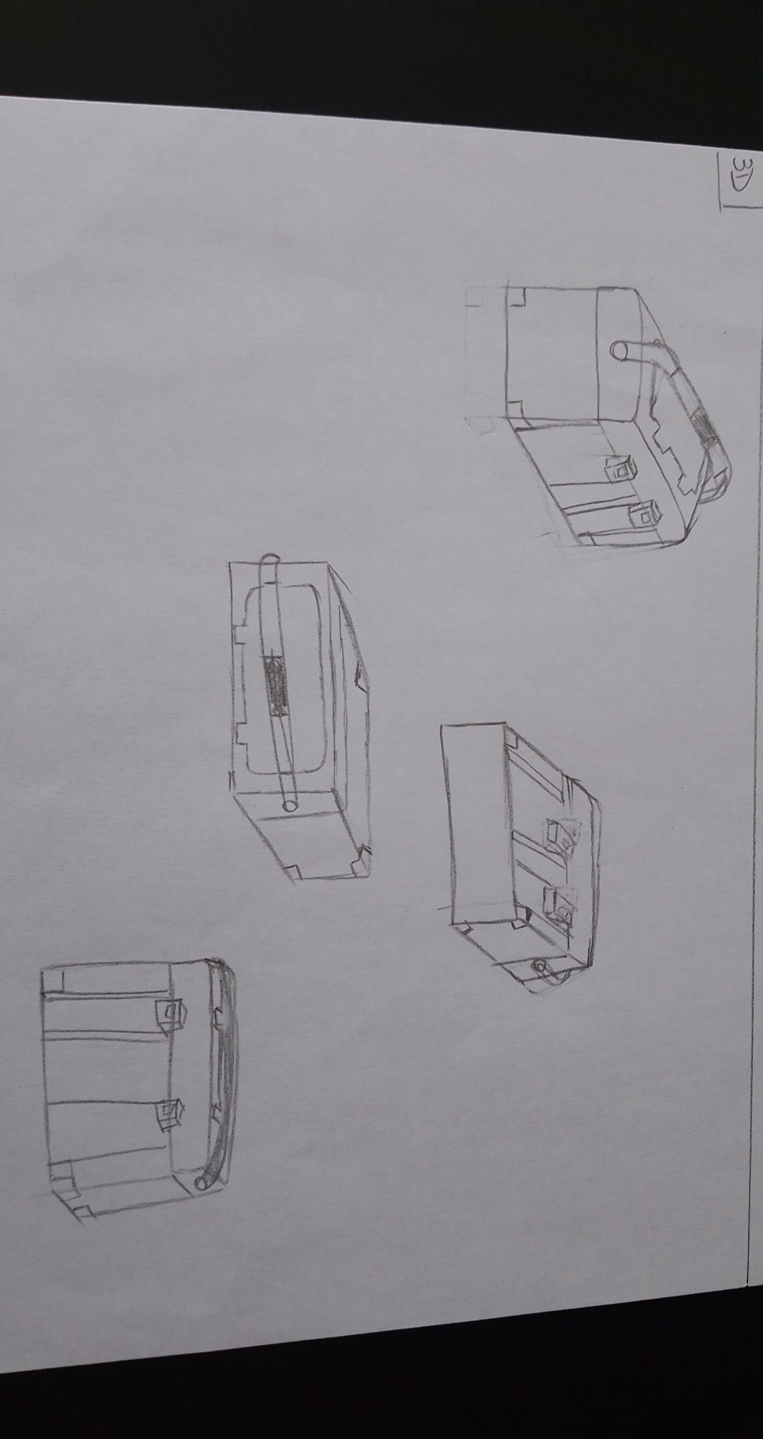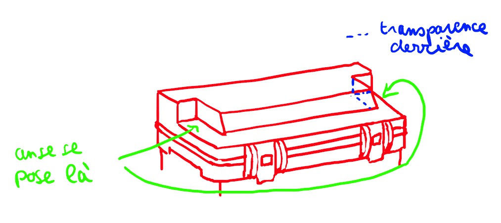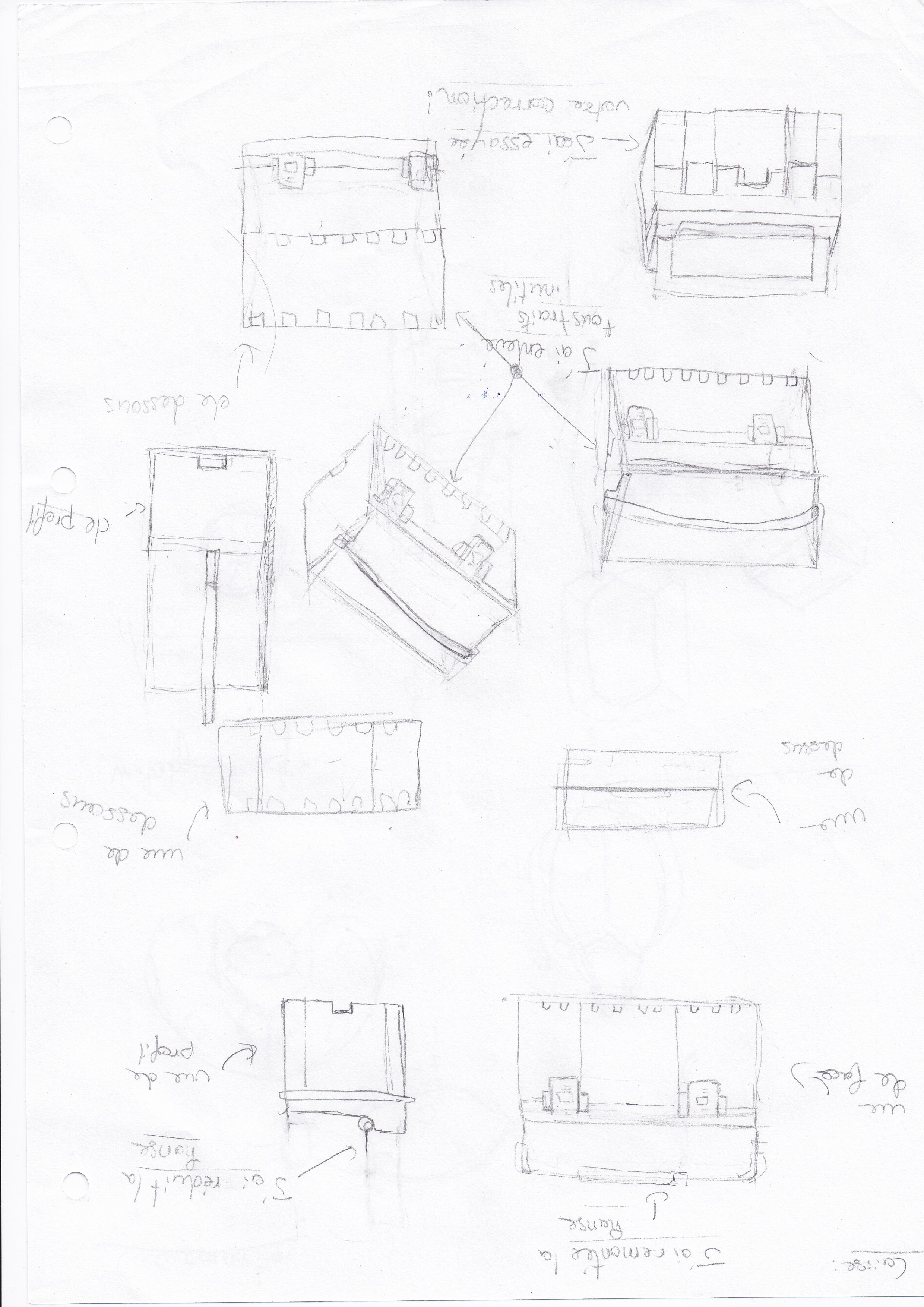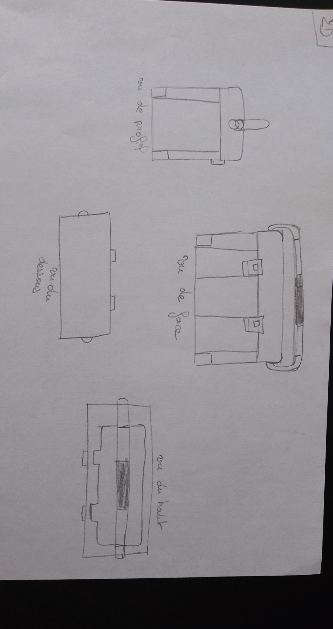 C'est du bon travail, les vues 2D sont pas mal, mais je vois que le dessus de la boîte est mal compris. Il y a un genre de marche qui va jusque serrière la anse, et à l'avant un rebord. Pour ce qui est des vues 3D attention, les proportions sont irrégulières, les différents éléments doivent garder les même dimensions entre chaque vue. Aussi, les traits les uns en face des autres doivent rester parallèles vu qu'ils pointent dans la même direction. On voit aussi une incompréhension du dessus de la boîte, que je n'ai pas corrigée directement sur les dessins, par contre je joins un croquis du dessus de la boîte pour que ça se visualise mieux. J'espère que ça sera plus compréhensible ^^
