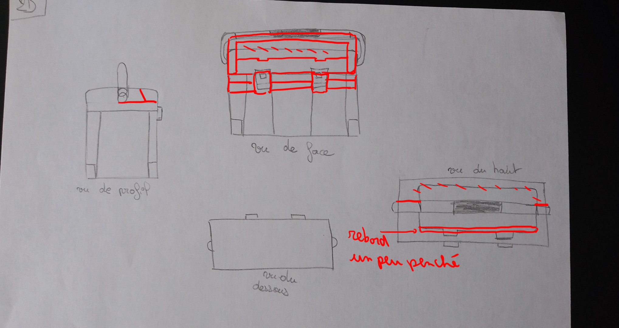 Je constate de l'amélioration suite aux remarques de Hadh :) Il reste quelques défauts, notamment au niveau du dessus de la boîte. En fait il y a une sorte de marche sur le dessus de la boîte qui forme un rebord sur tout le tour un peu plus bas, où se trouve la anse. Je joins une correction visuelle, et aussi un dessin du dessus de la boîte pour t'aider à comprendre :) Travail bien complet en tous cas :)