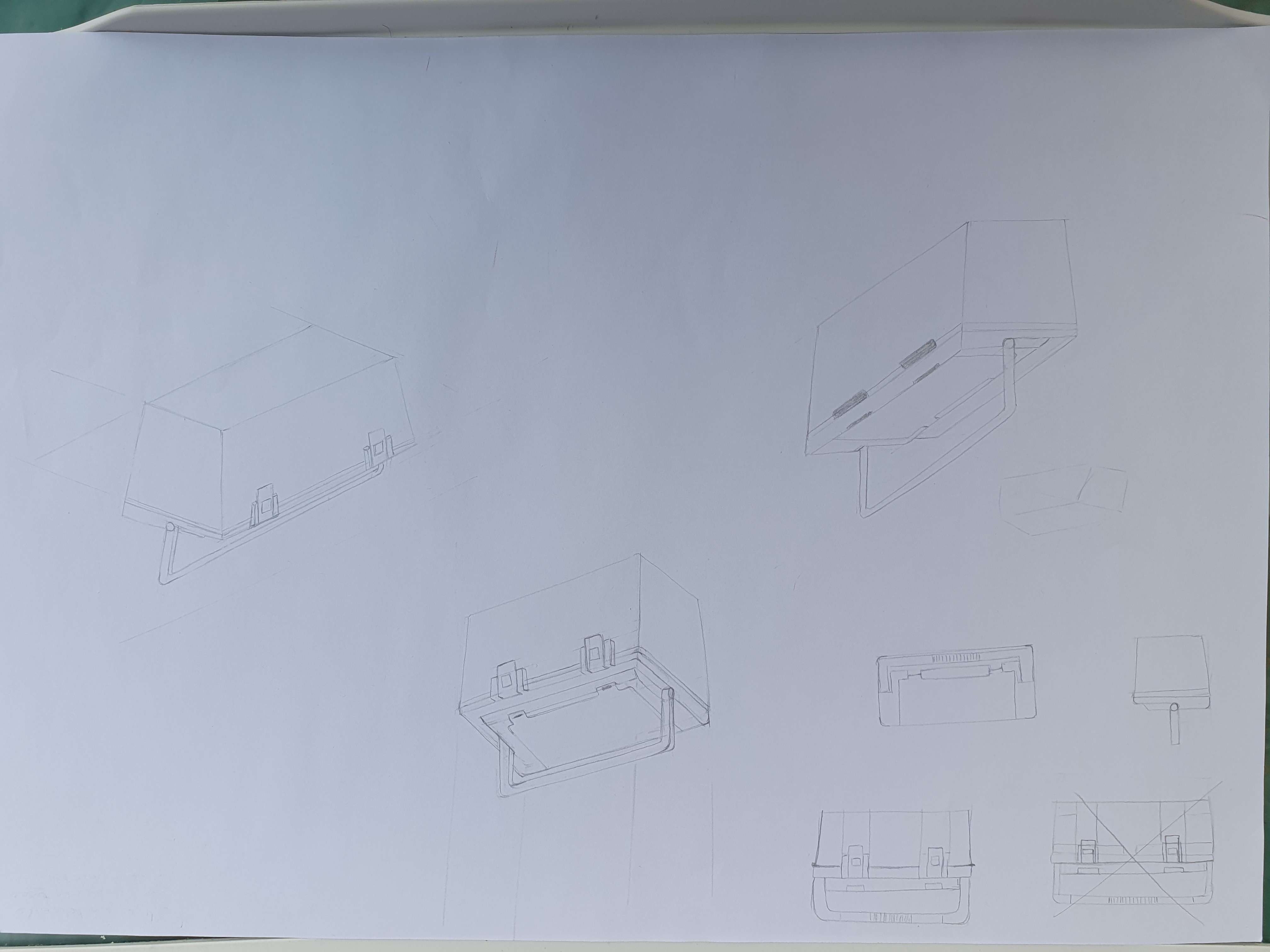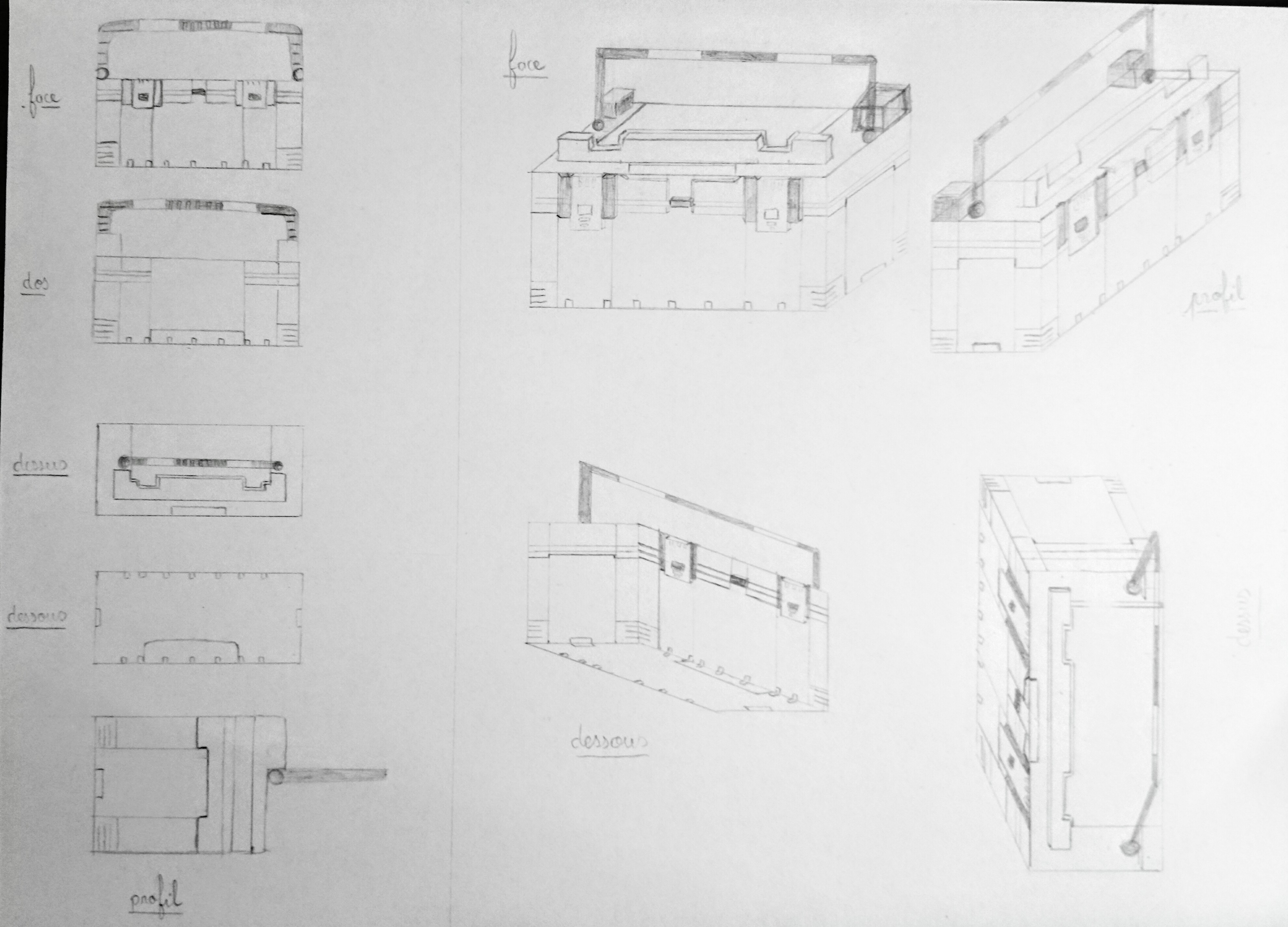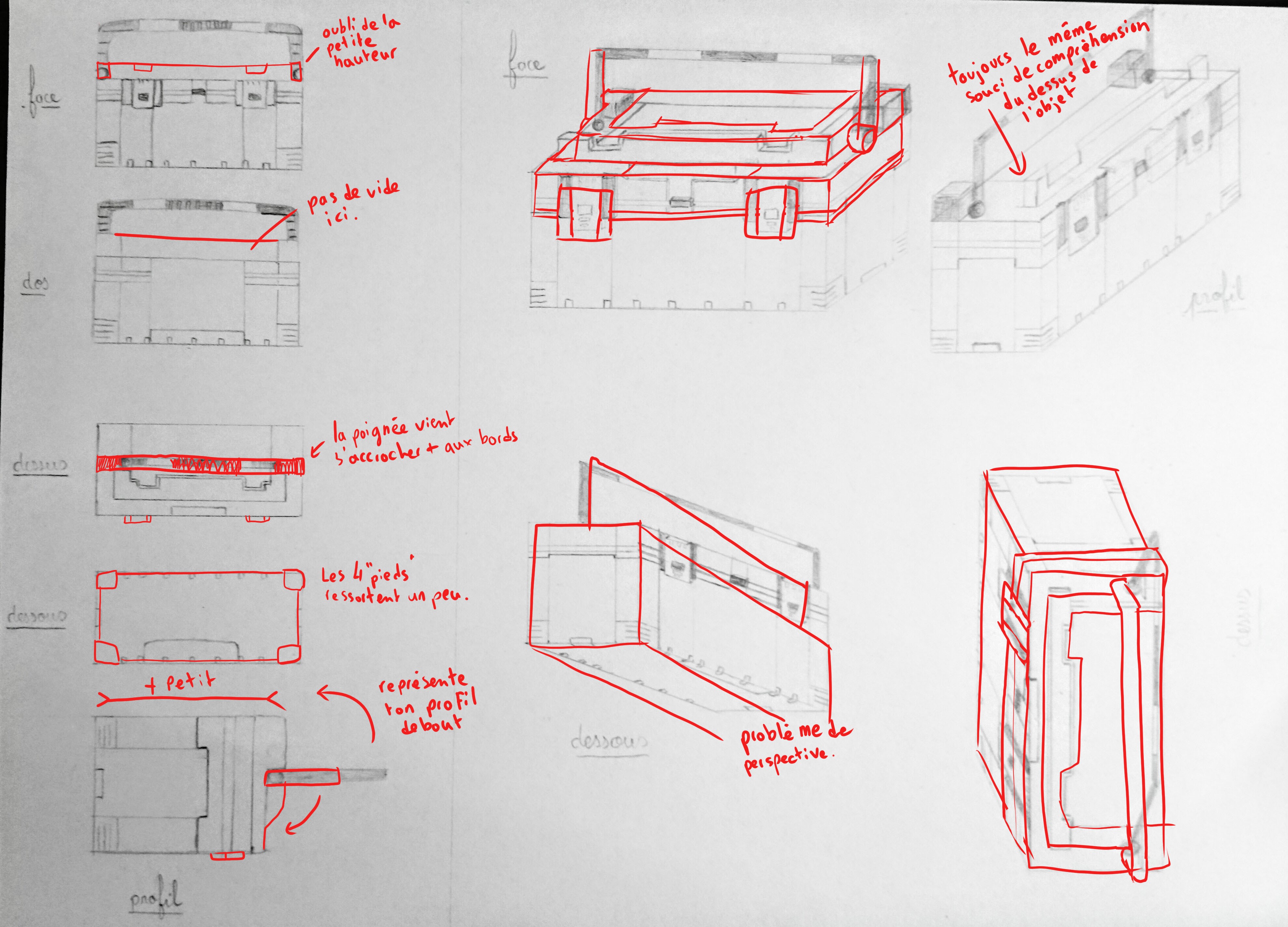 Attention à garder les traits qui vont dans la même directions sur l'objet parallèles les uns aux autres ^^ Sinon joli travail mais avec le même souci concernant le dessus de la boîte par rapport à la feuille précédente. En tous cas bravo pour avoir fait autant de vues :)