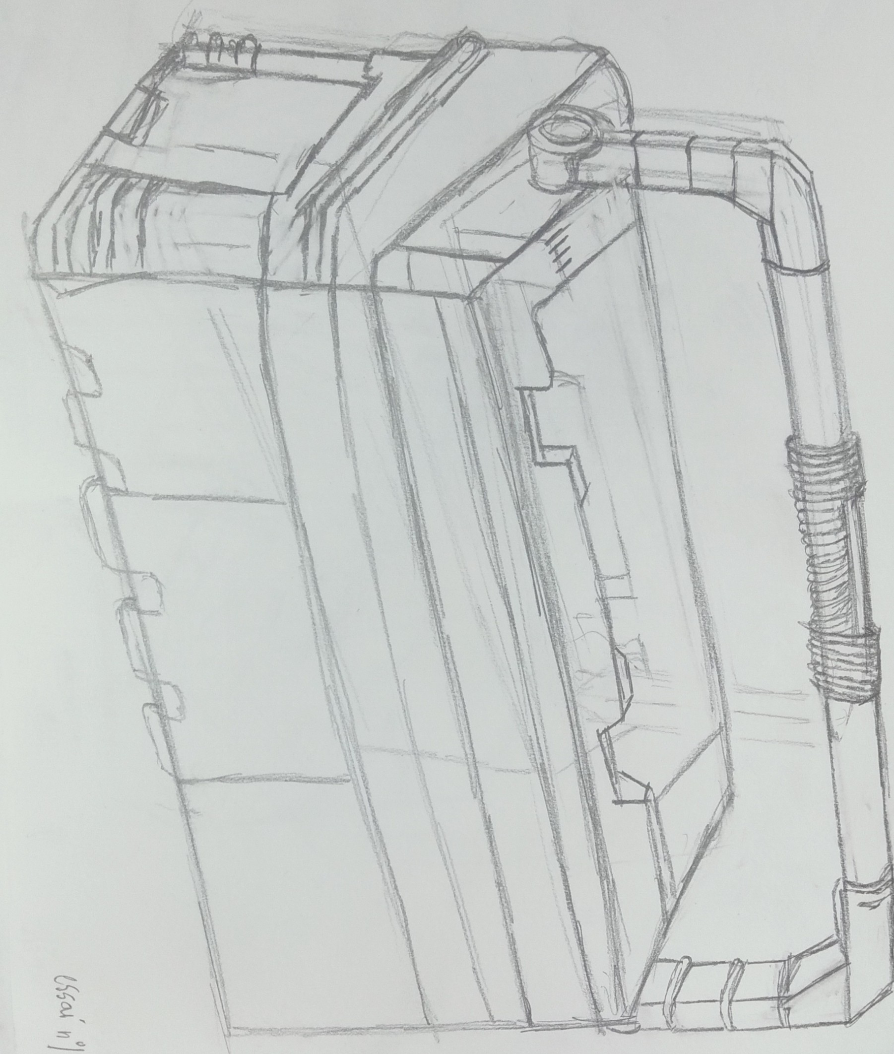C'est un bon début, tu aurais pu ajouter plus de détails, réfléchir à comment s'imbriquaient les différents volumes qui composent la mallette, comment est implantée la poignée etc.