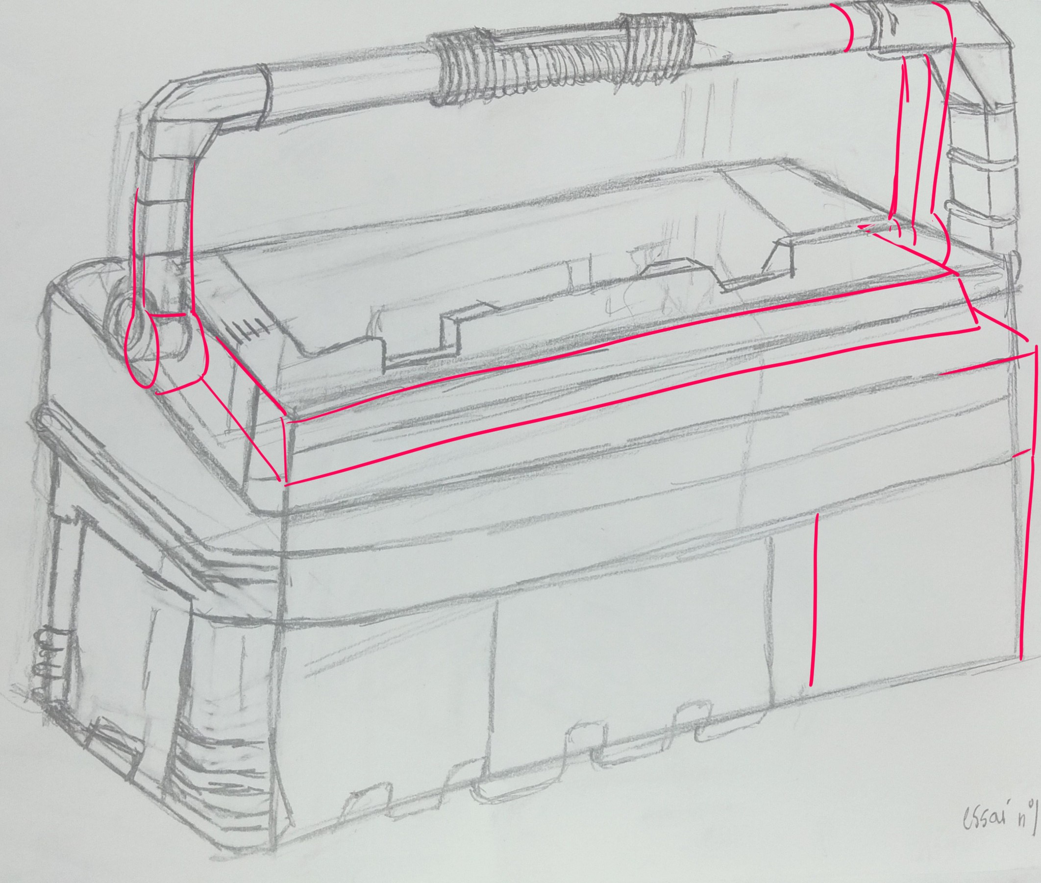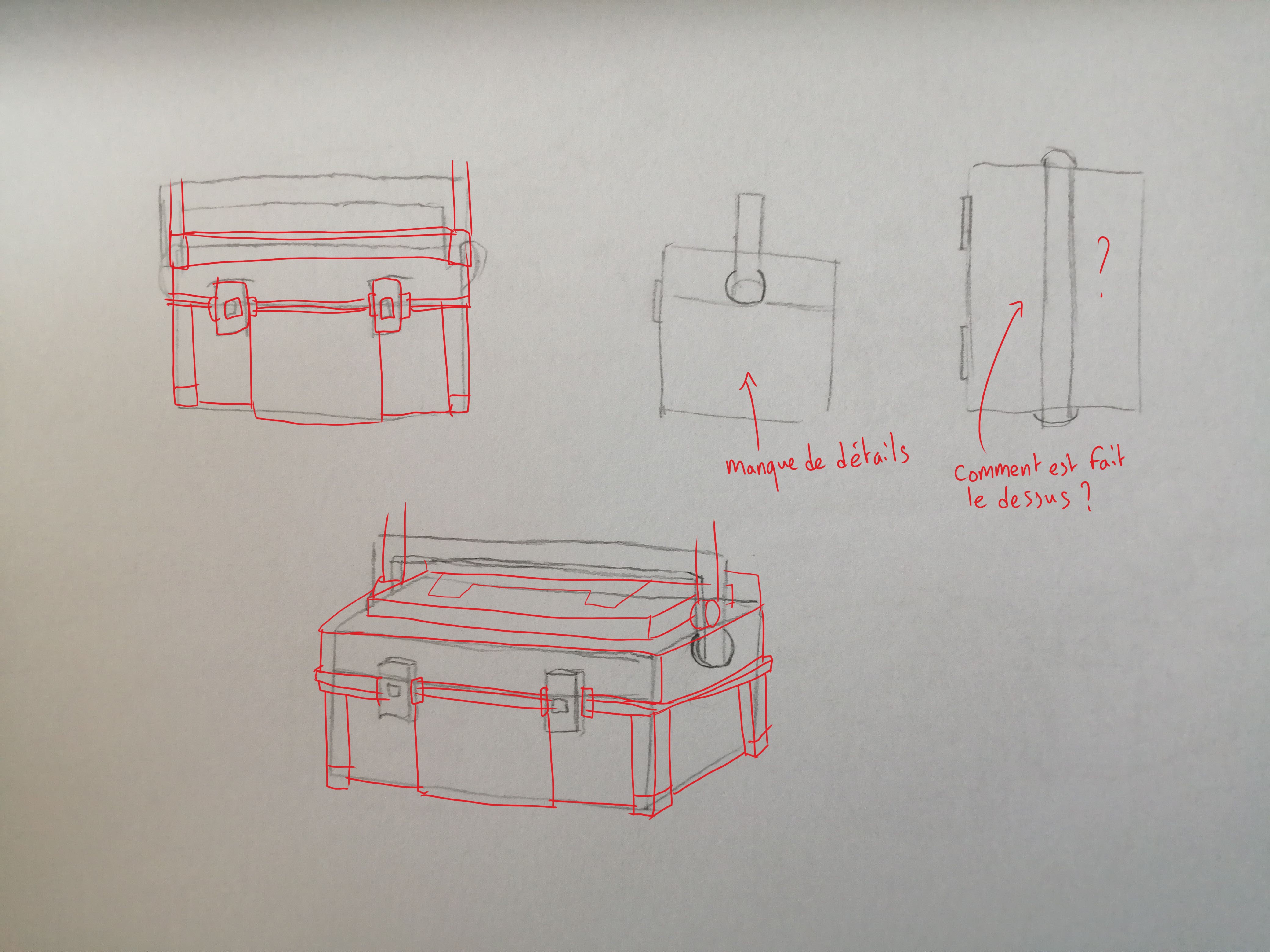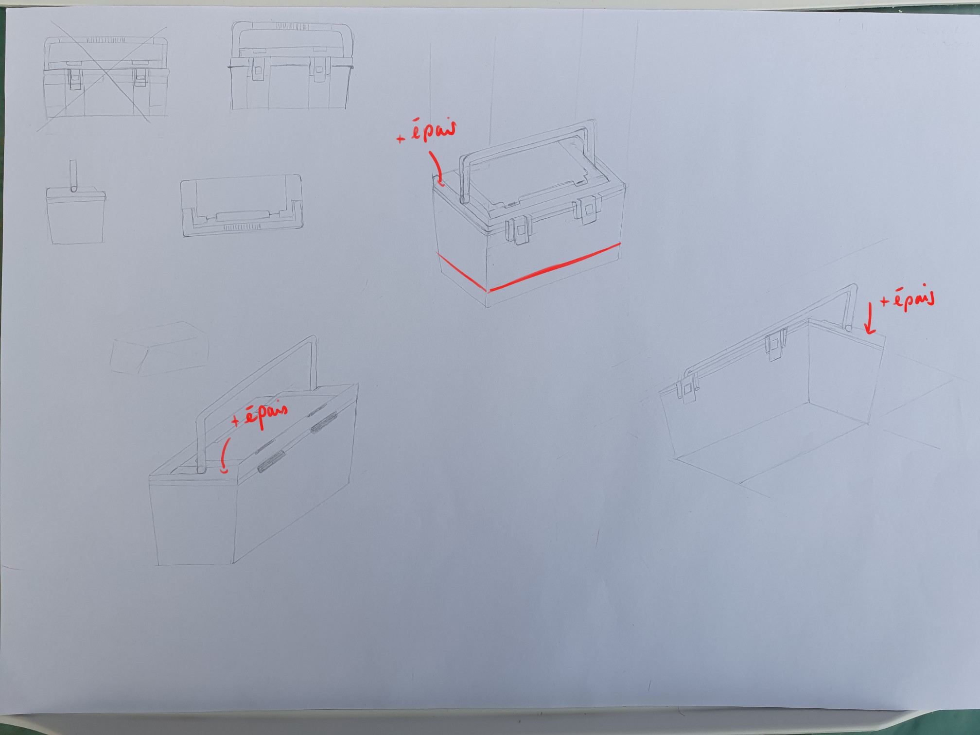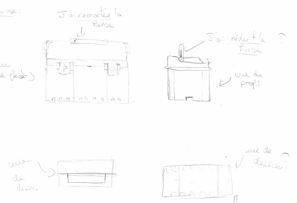 Bonjour, j'ai retouché une dernière fois la caisse à outils avec les corrections que vous m'aviez apporté ! J'ai donc suivi le tuto du dessus de la boîte pour la "marche" ce qui m'a permis de mieux comprendre et j'ai passé au crayon plus foncé les corrections que vous aviez faîtes et que j'ai reproduis, donc toutes les annotations (avec flèches) sont fausses car c'était suite à la 2ème correction que je les avais écrite. Elle ne marche donc plus pour ce dessin !!!