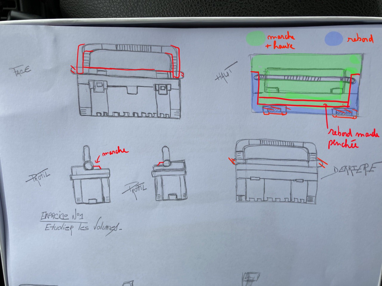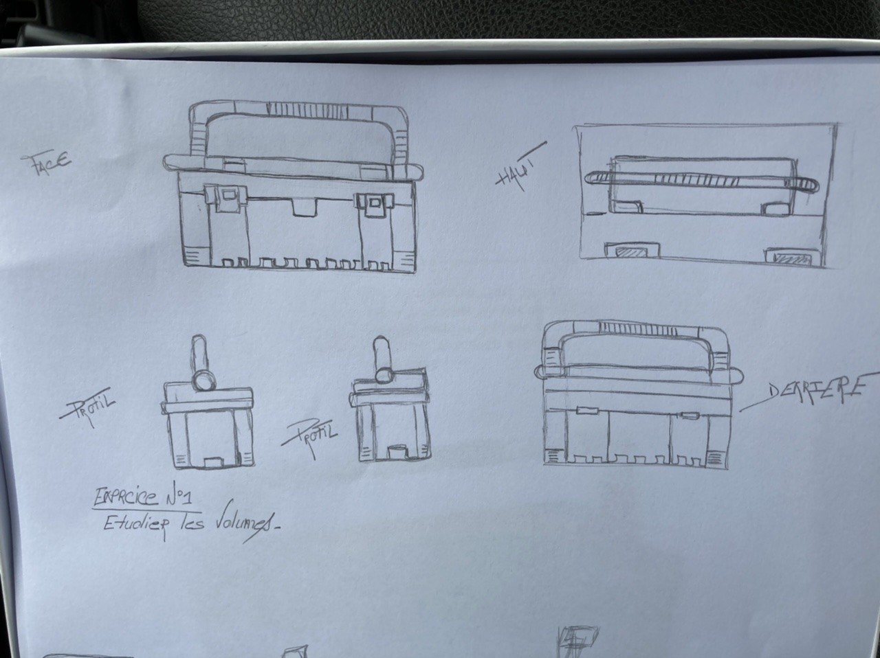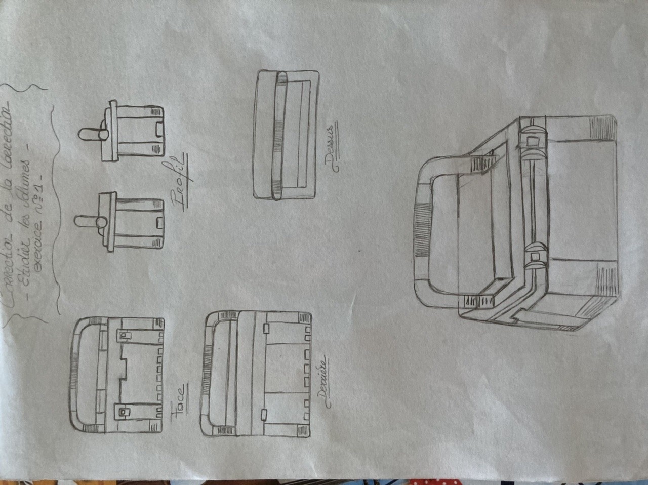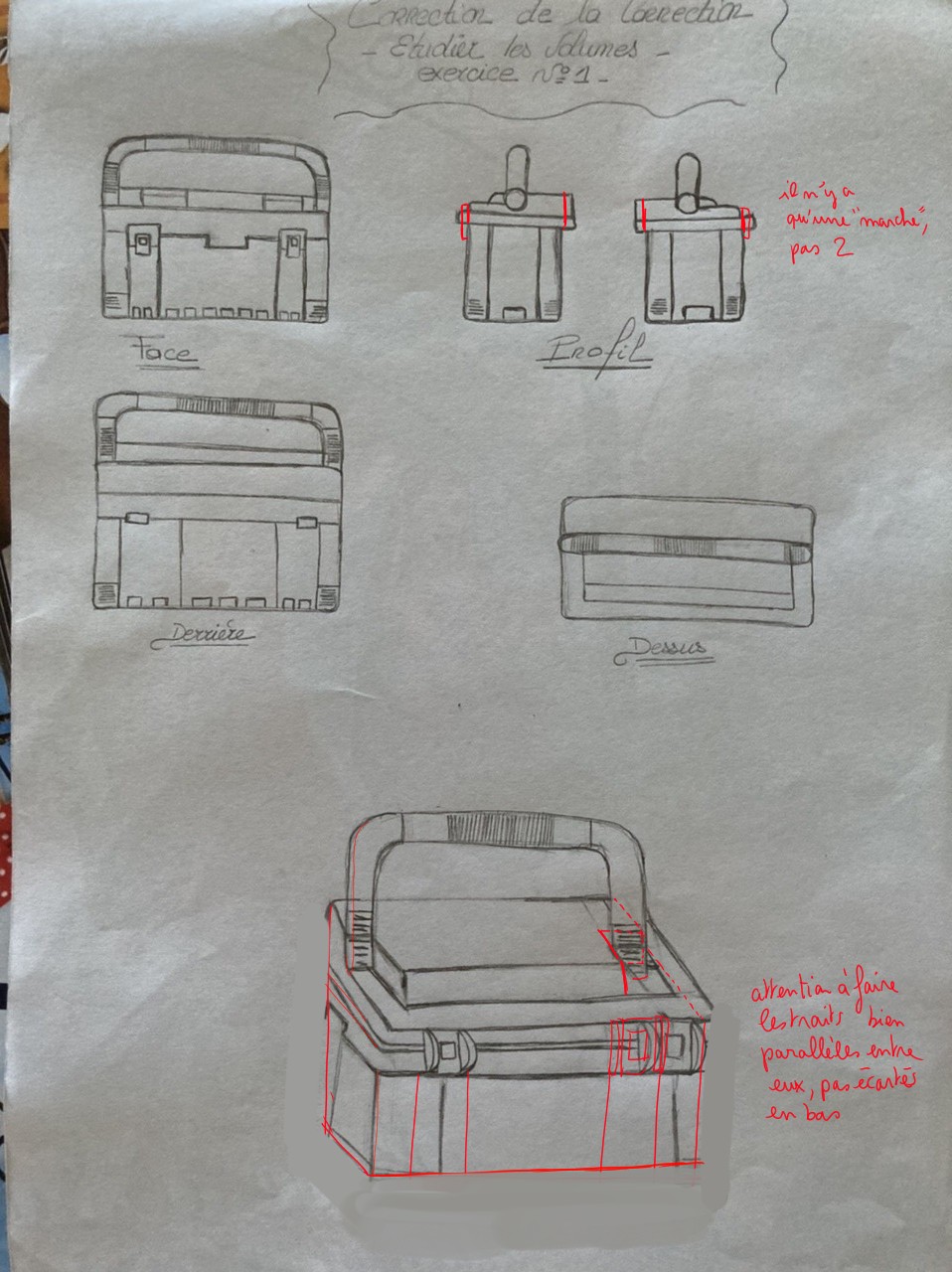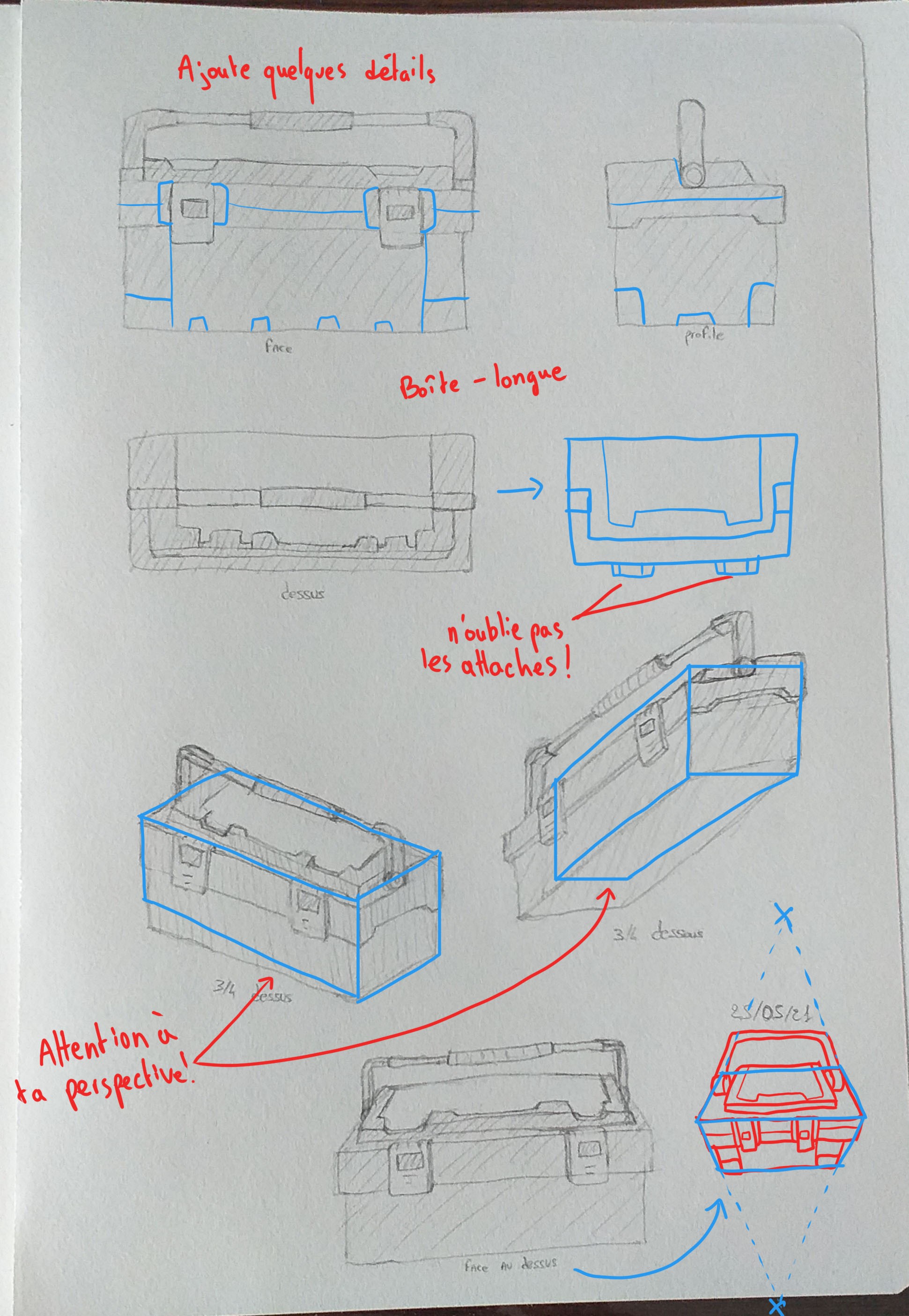Fais attention cependant au départ à dessiner en plus léger ton volume (en dessinant de simples cubes) par tu as tendance à faire la mallette trop haute et pas assez dans la longueur par rapport au modèle.