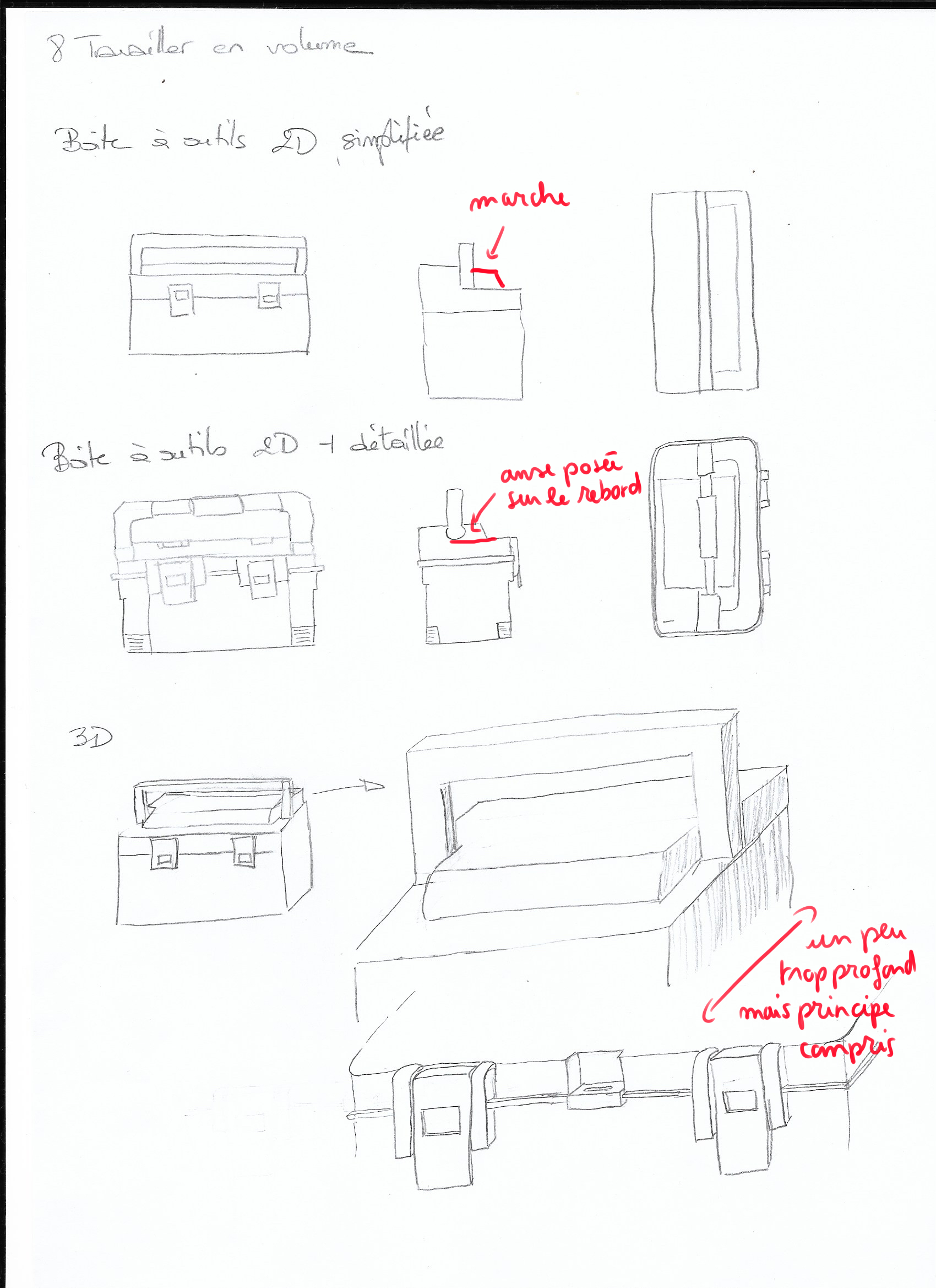 Super si les cours plaisent :) Pour la boîte c'est plutôt bien, mais attention le dessus de la boîte est mal compris. Il y a normalement une marche avec un bout qui dépasse derrière la anse. Je vais joindre un schéma explicatif du dessus de la boîte. Sinon attention à garder les mêmes proportions entre les vues, et garder les lignes les unes en face des autres parallèles. Beau travail sinon :)