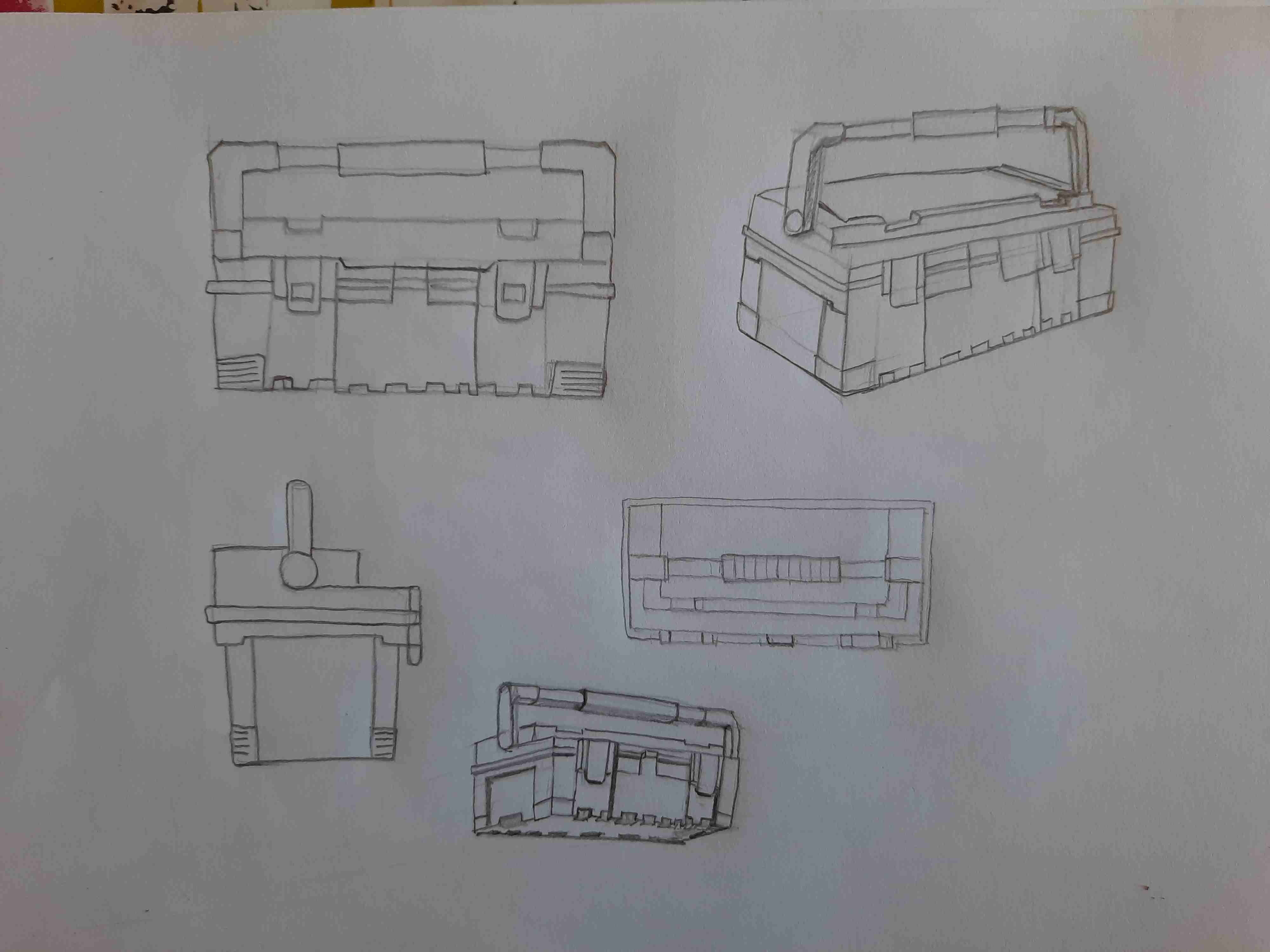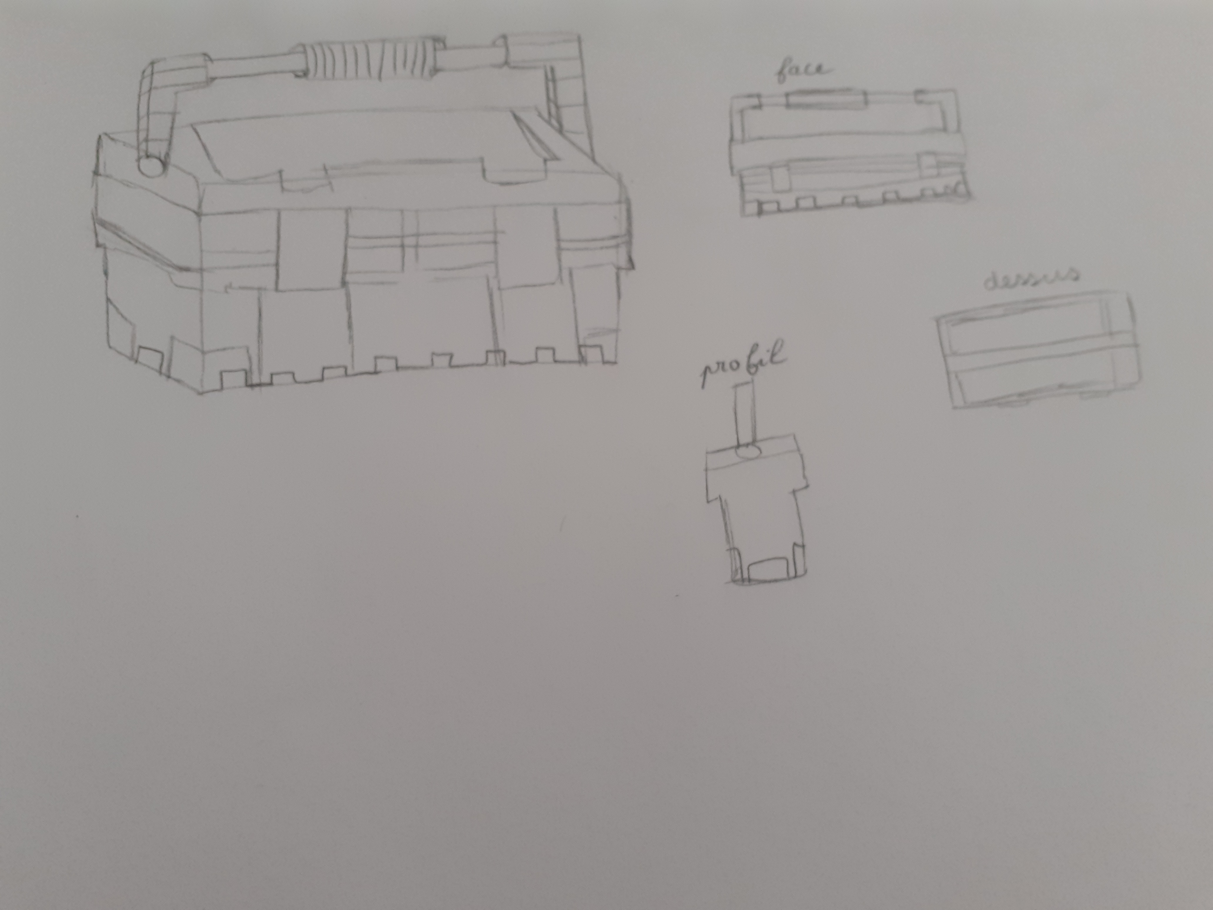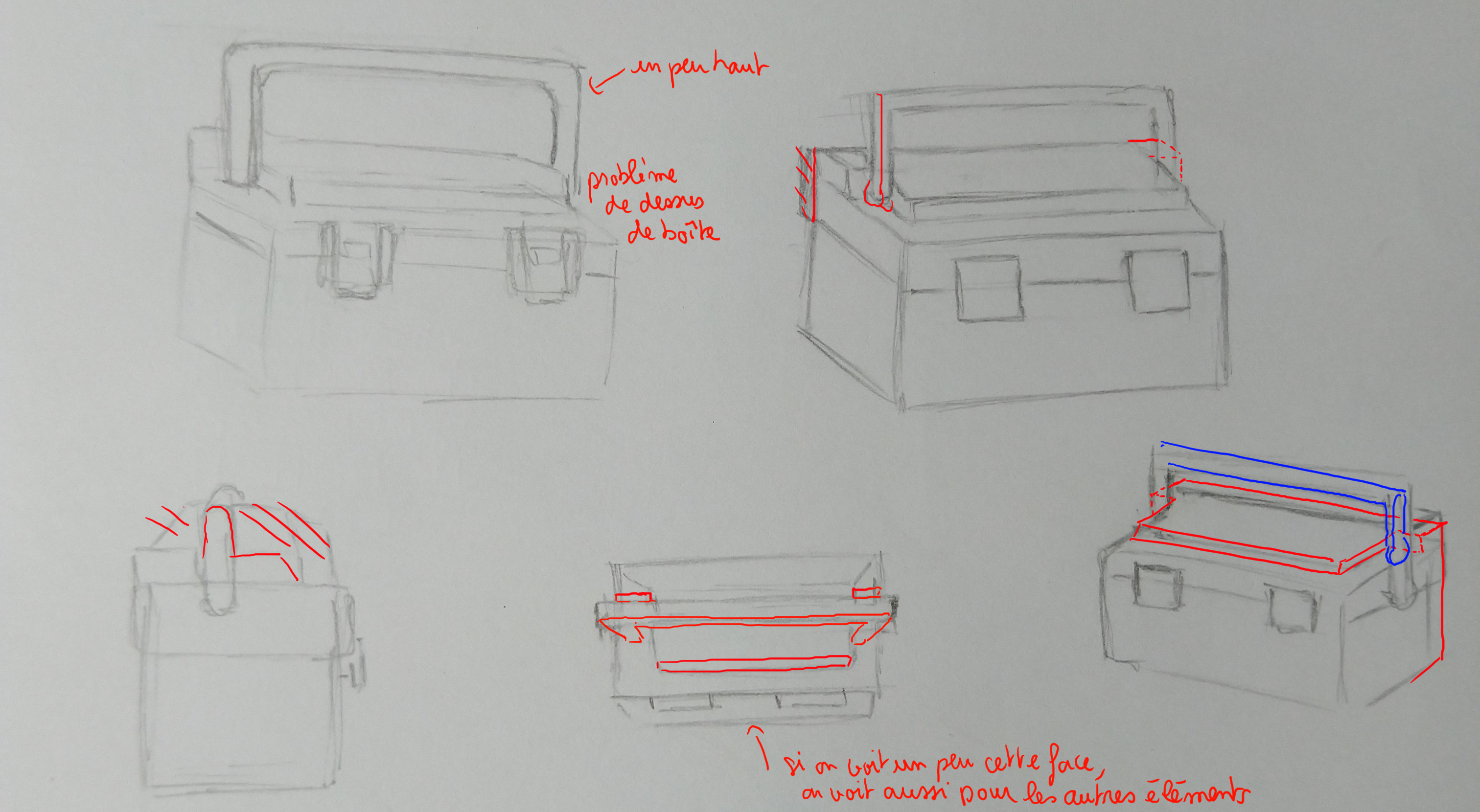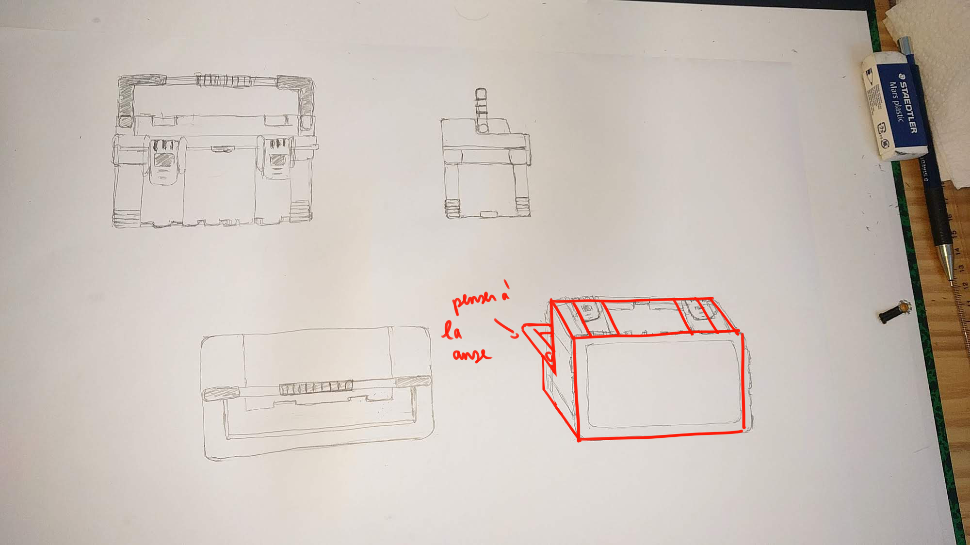 Bonjour Graffiti ! Pas de souci ne t'en fais pas, nous aussi on galère un peu parfois haha ! Tes vues sont très jolies, tu as un beau coup de crayon j'aime bien ! Attention sur ta vue de profil à bien centrer la poignée. Sur ta vue de dessus, la caisse est un peu fine, je la vois bien plus large que ça. Les loquets ressortent également de la forme en avant. Dans l'ensemble tu as bien compris l'objet :)