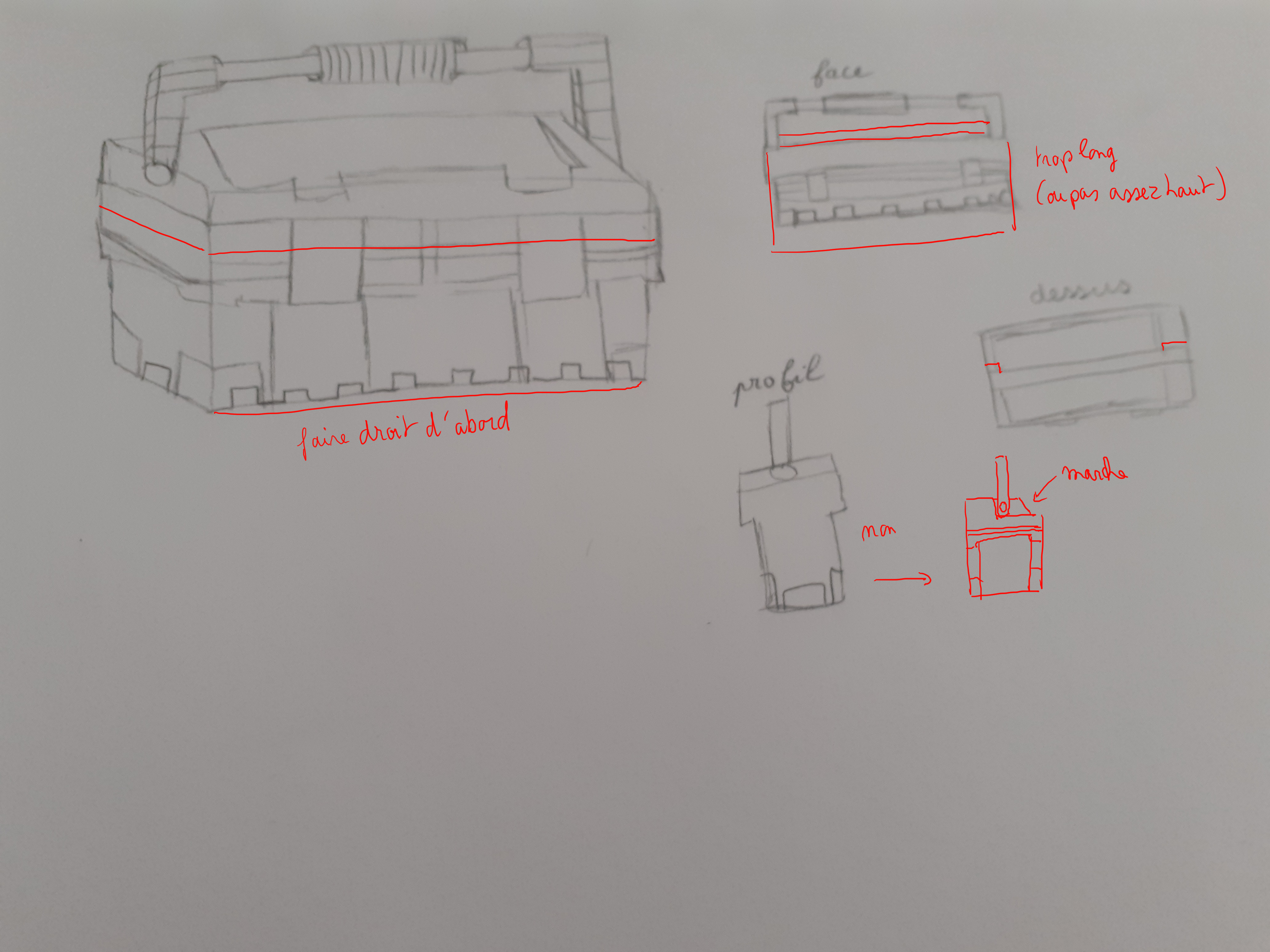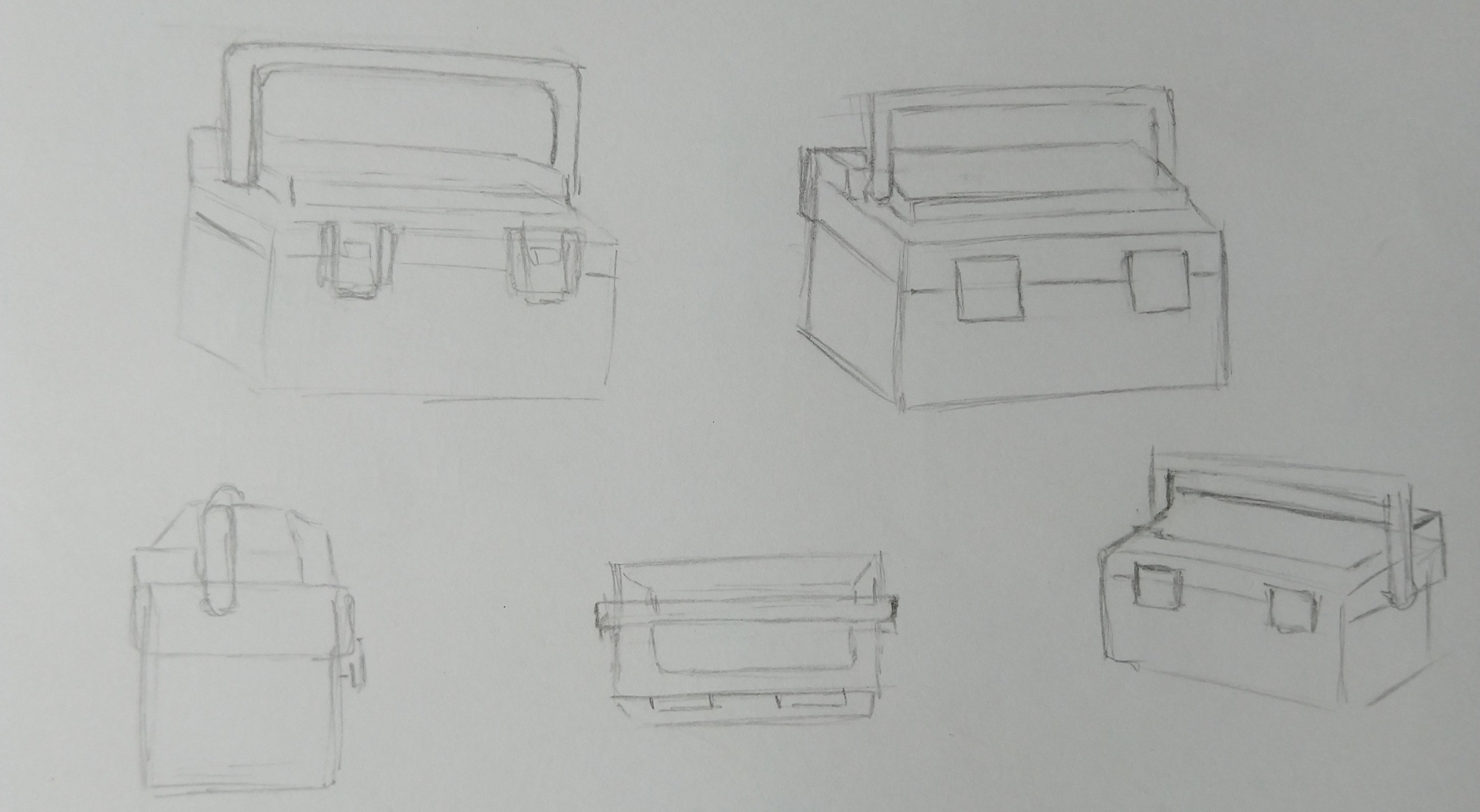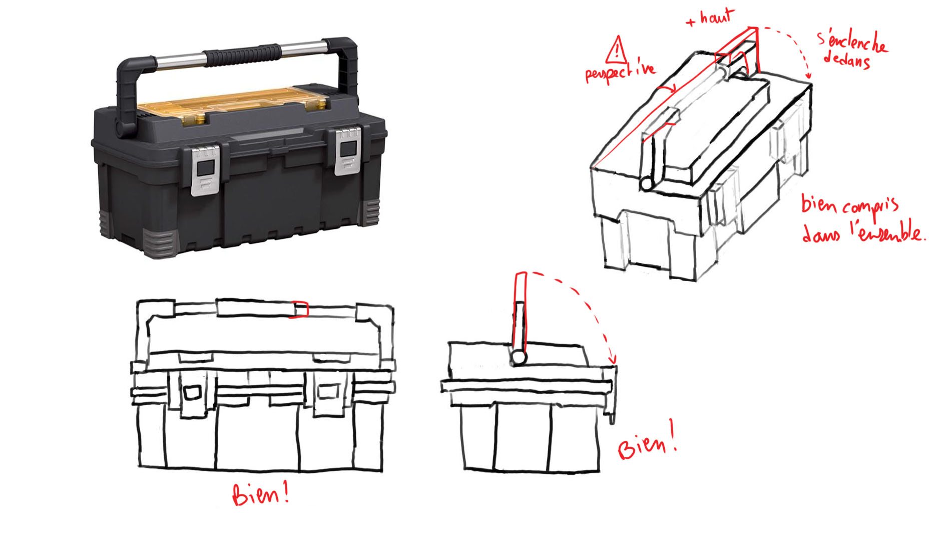 Bonjour Graffiti ! Pas de souci ne t'en fais pas, nous aussi on galère un peu parfois haha ! Tes vues sont très jolies, tu as un beau coup de crayon j'aime bien ! Attention sur ta vue de profil à bien centrer la poignée. Sur ta vue de dessus, la caisse est un peu fine, je la vois bien plus large que ça. Les loquets ressortent également de la forme en avant. Dans l'ensemble tu as bien compris l'objet :)
