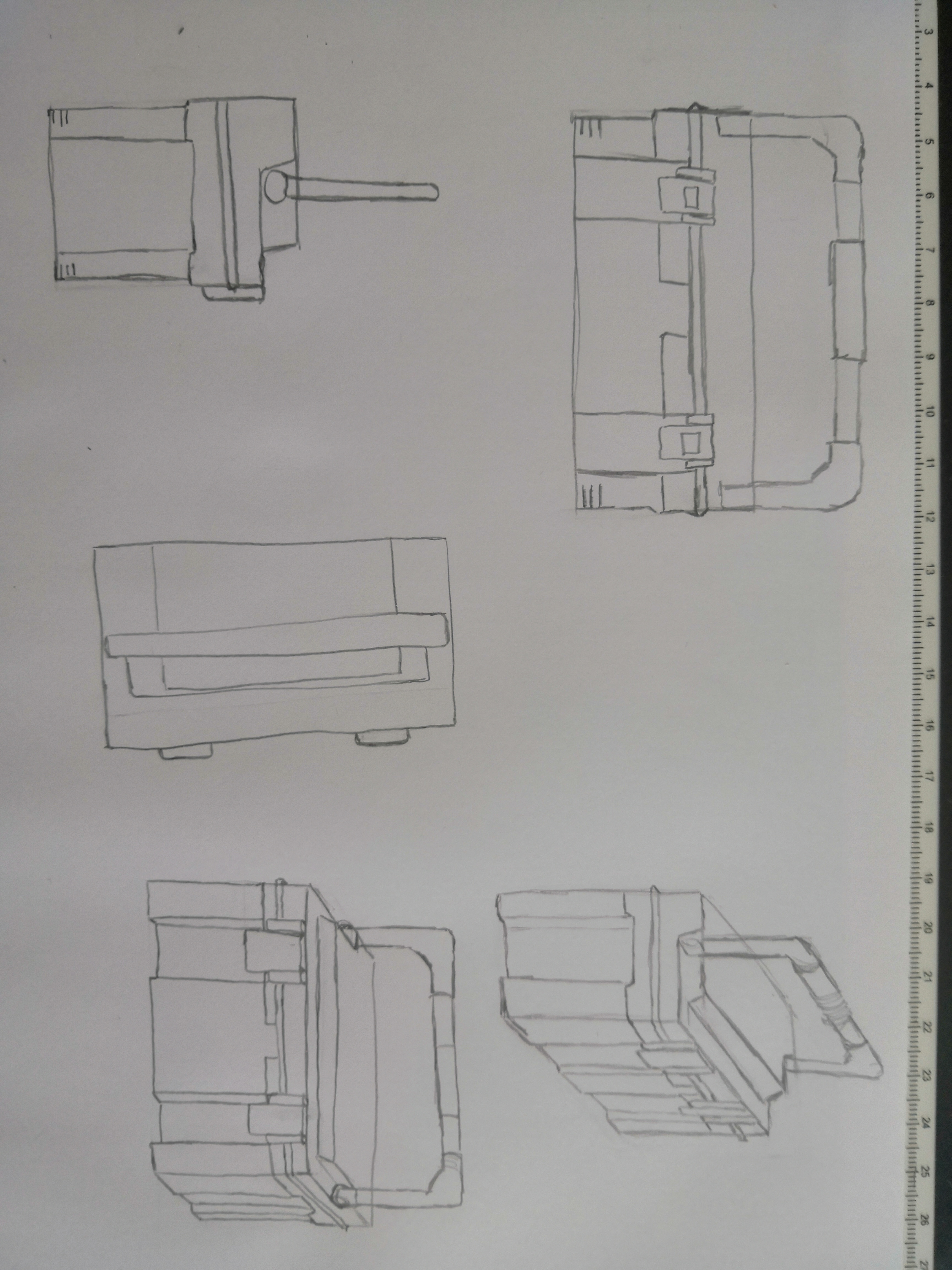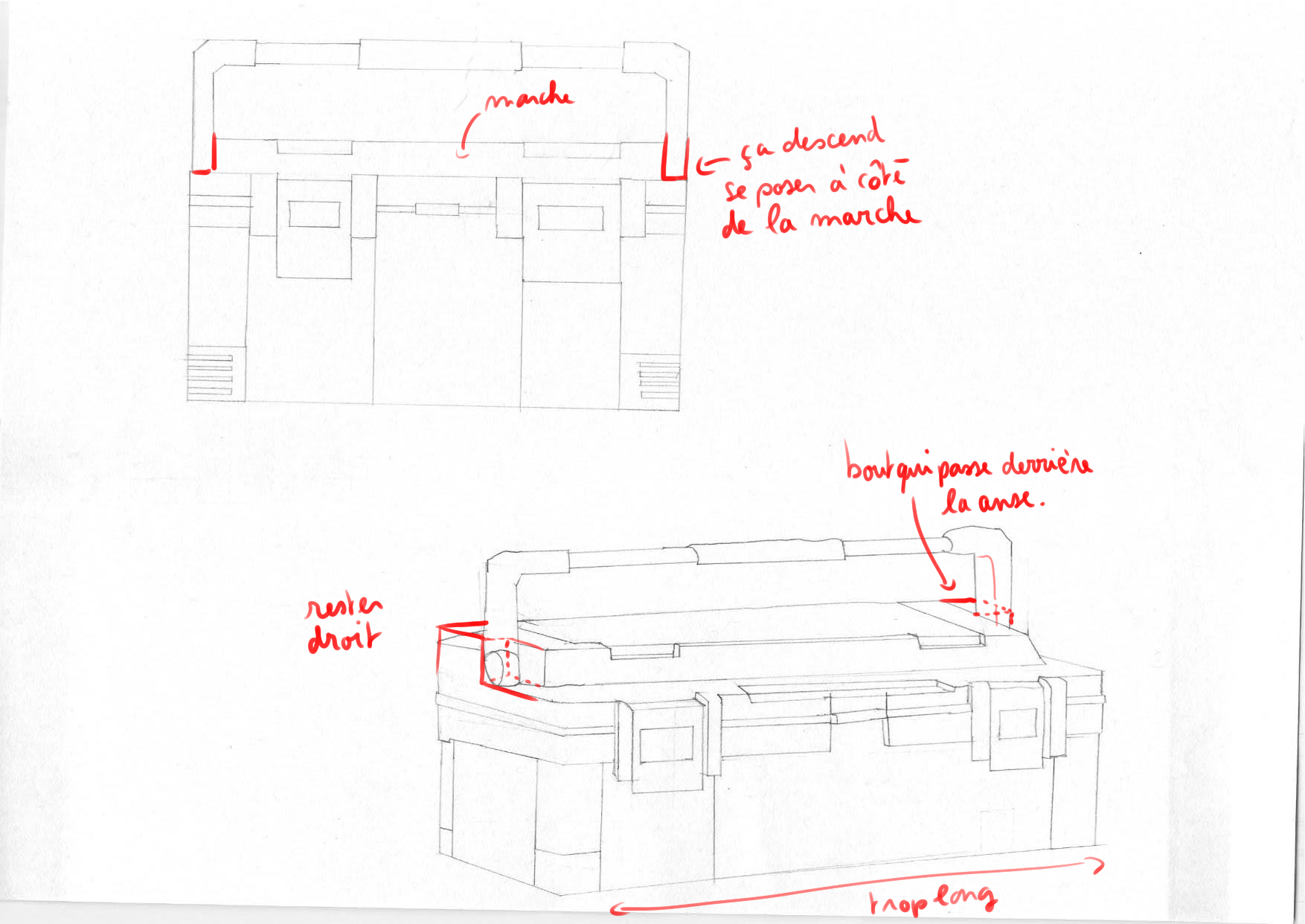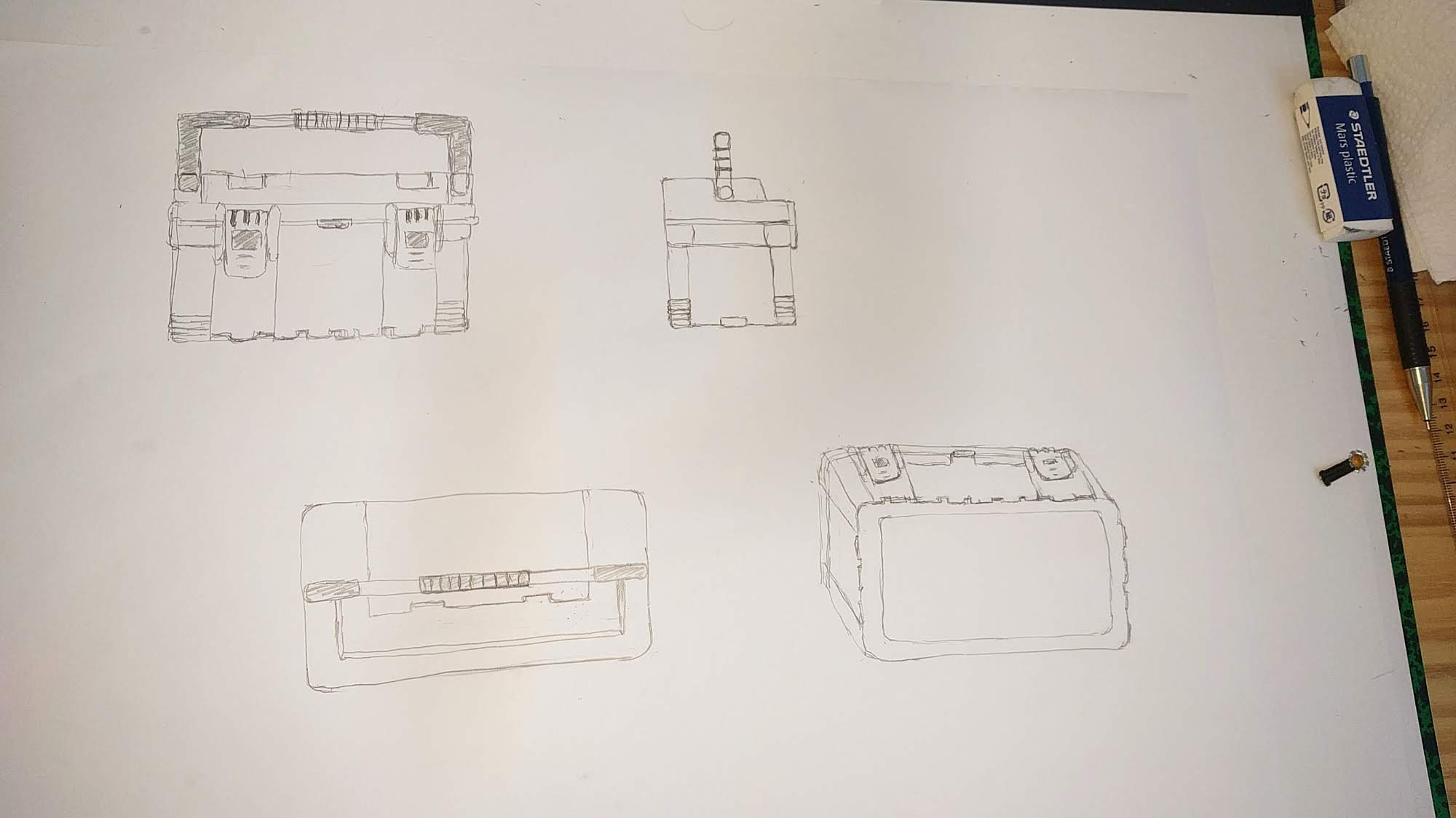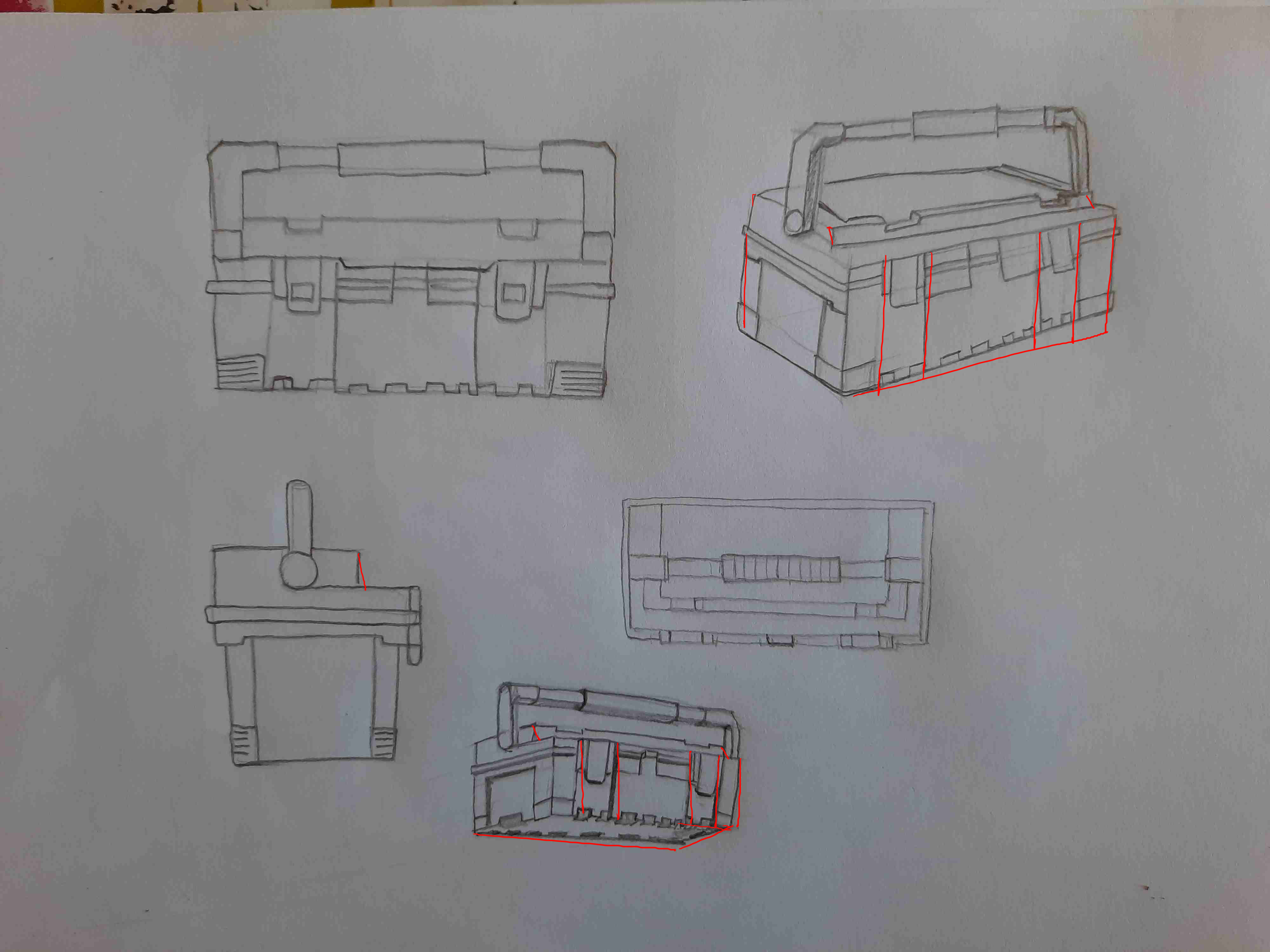Bonjour Graffiti ! Pas de souci ne t'en fais pas, nous aussi on galère un peu parfois haha ! Tes vues sont très jolies, tu as un beau coup de crayon j'aime bien ! Attention sur ta vue de profil à bien centrer la poignée. Sur ta vue de dessus, la caisse est un peu fine, je la vois bien plus large que ça. Les loquets ressortent également de la forme en avant. Dans l'ensemble tu as bien compris l'objet :)