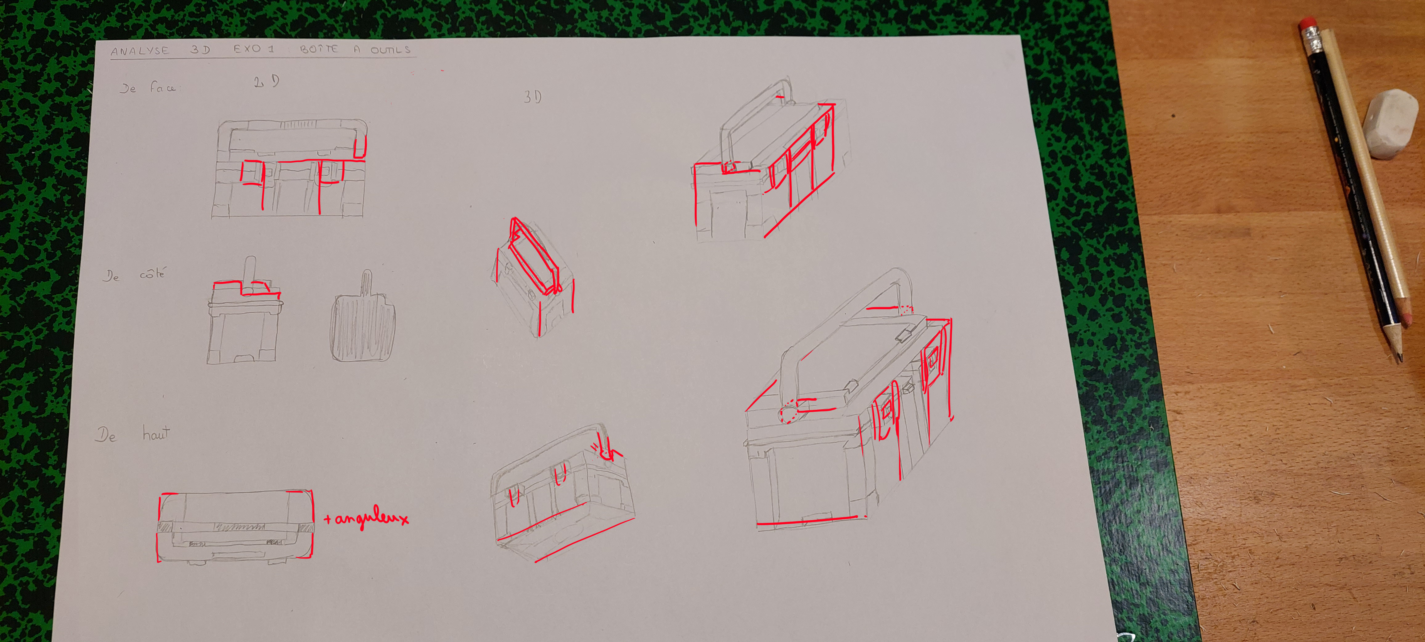 Voici ma correction sur quelques petits points à revoir, attention notamment à la perspective de l'objet dans sa vue de 3/4.