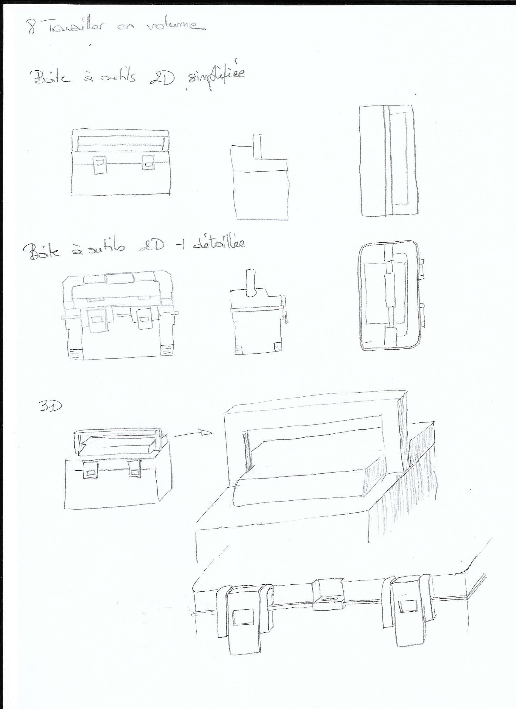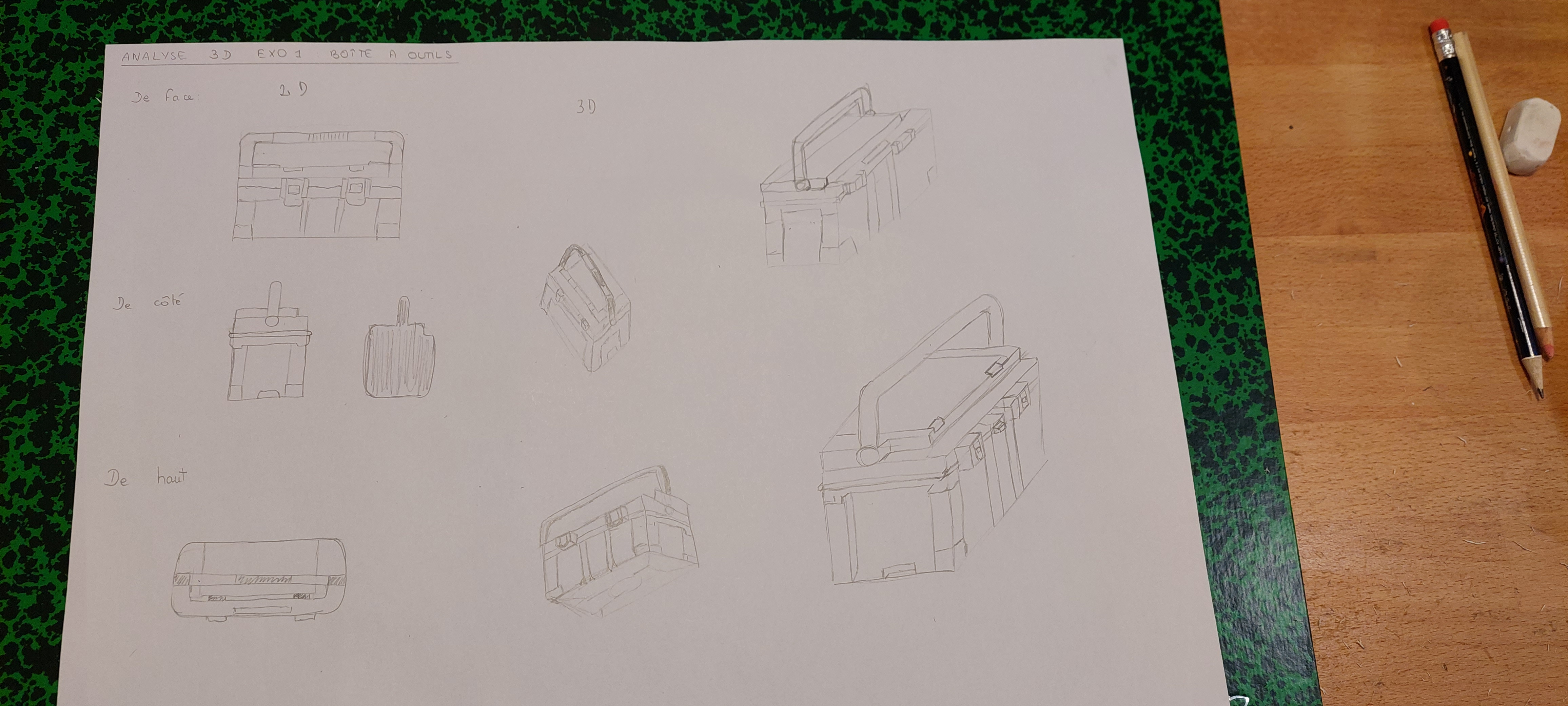 La malette est très bien comprise, bravo :) Les vues 2D comme 3D sont réussies. Attention juste à garder des proportions similaires entre les vues. Par exemple on remarque que la vue de face est plus longue et fine que la vue en bas à droite de la feuille. Beau travail en tous cas :)