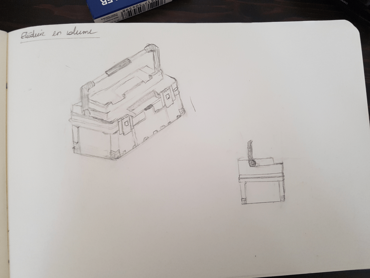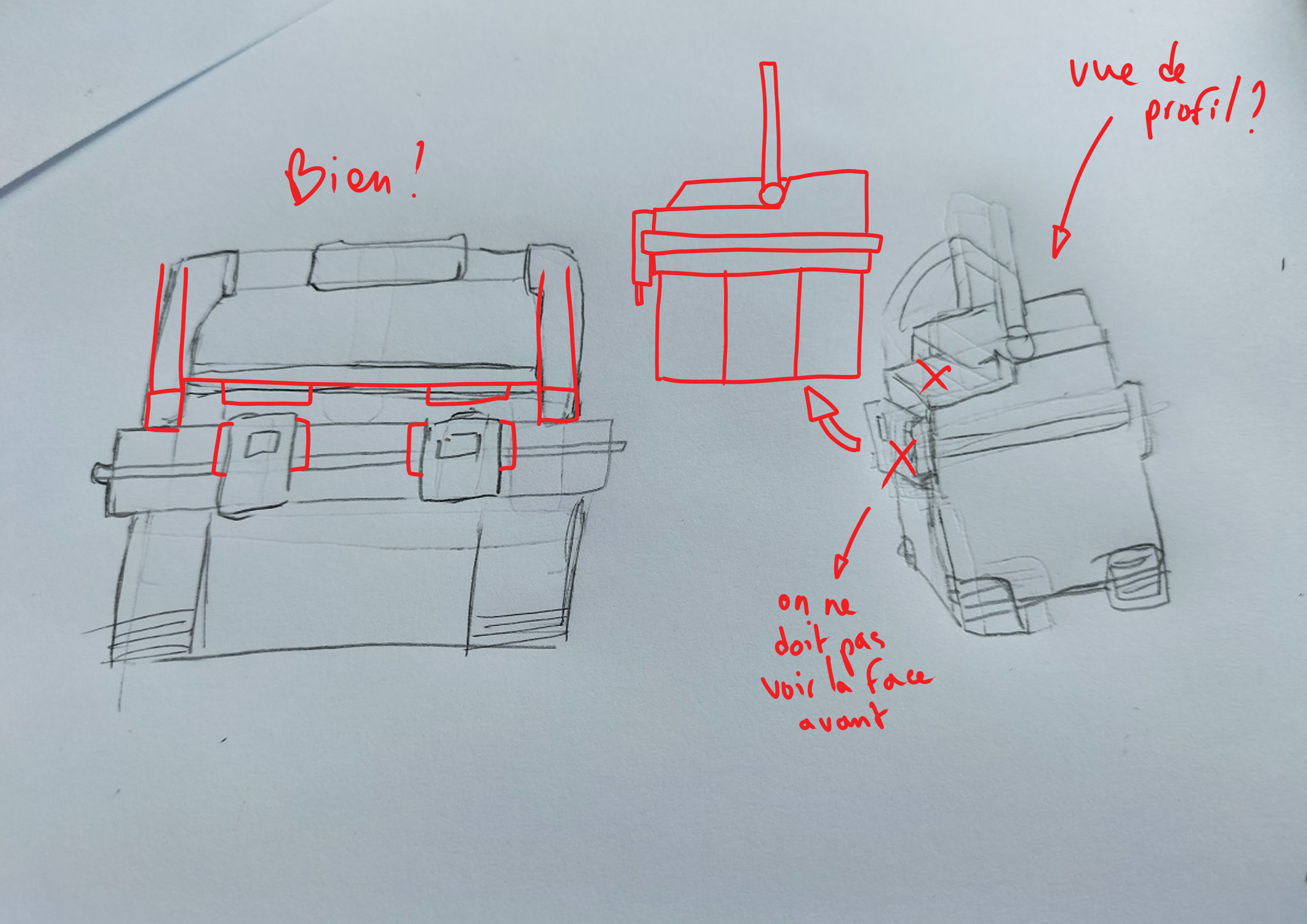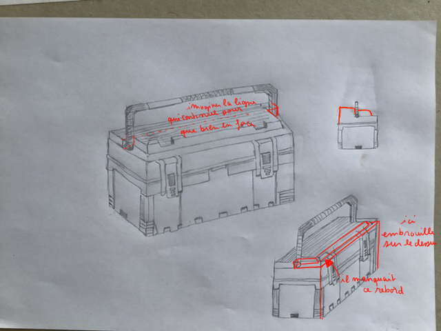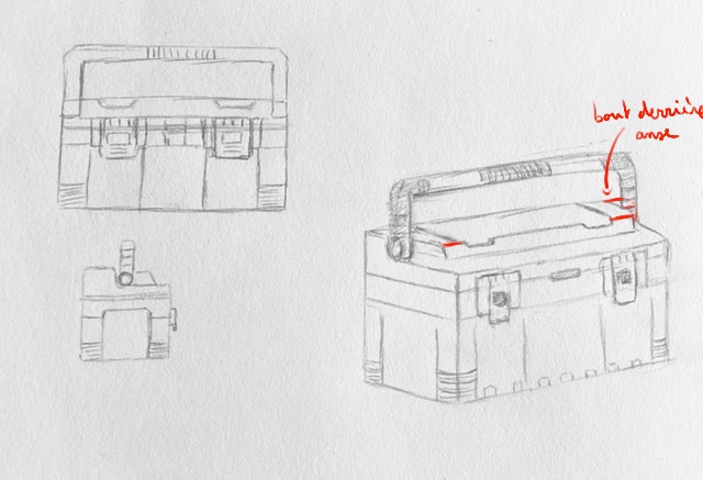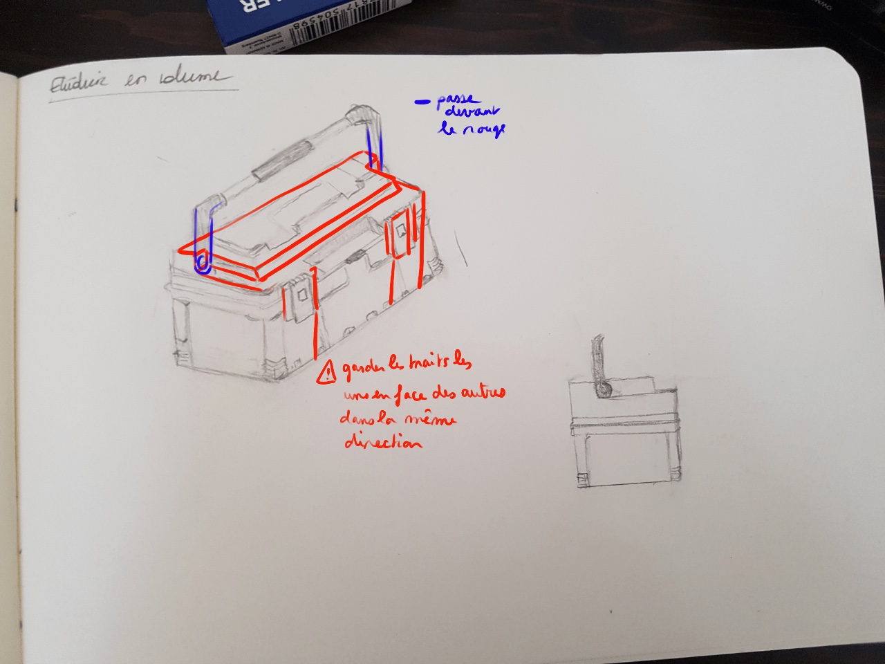 C'est plutôt compris, attention à garder les bons rapports de longueur entre les dessins ^^ C'est le dessus de la boîte où il y a des difficultés. La marche sur le dessus laisse juste un rebord où se pose la anse, et passe derrière celle ci. Je joins un croquis du dessus de la boîte pour mieux comprendre ! Bon travail en tous cas !
