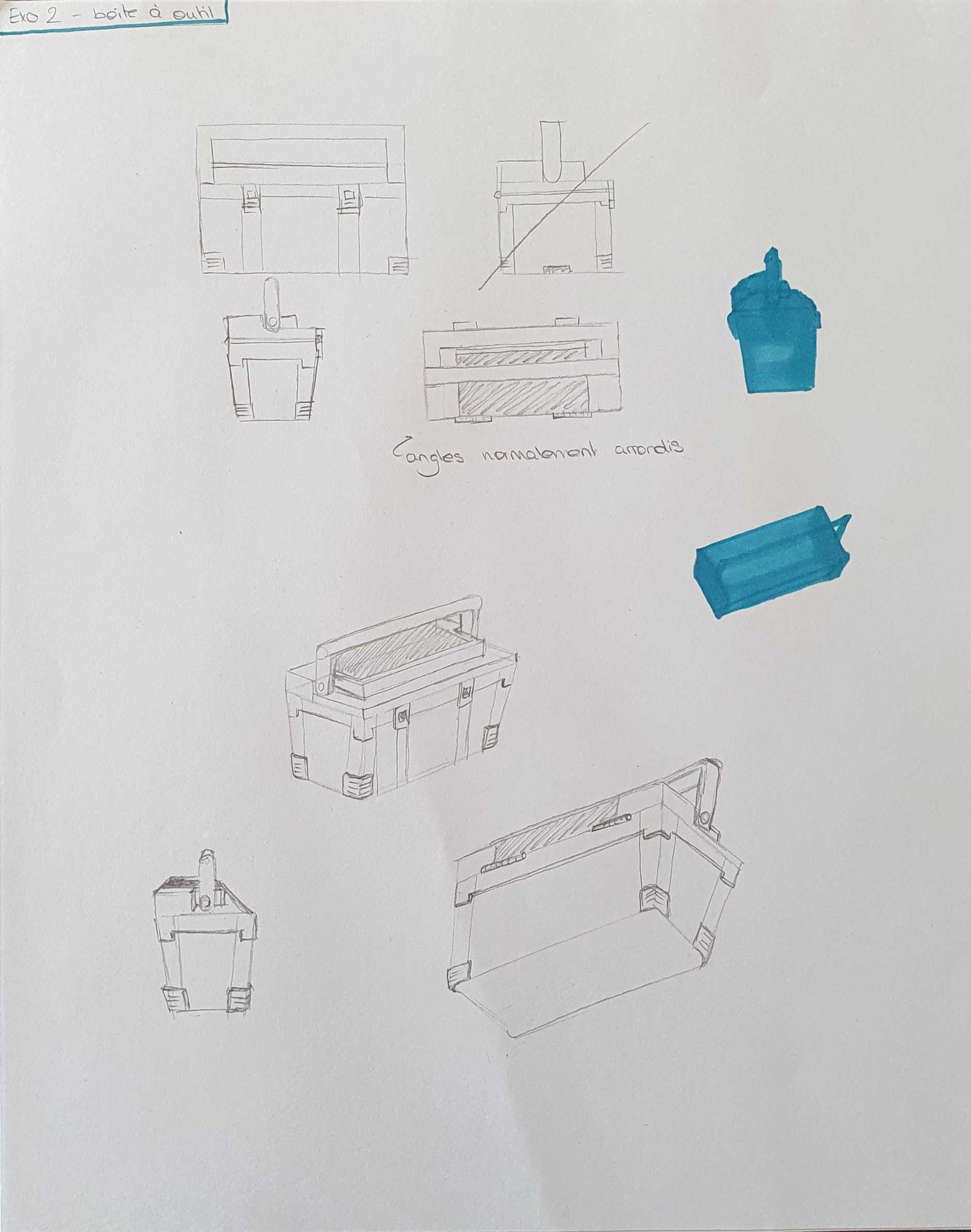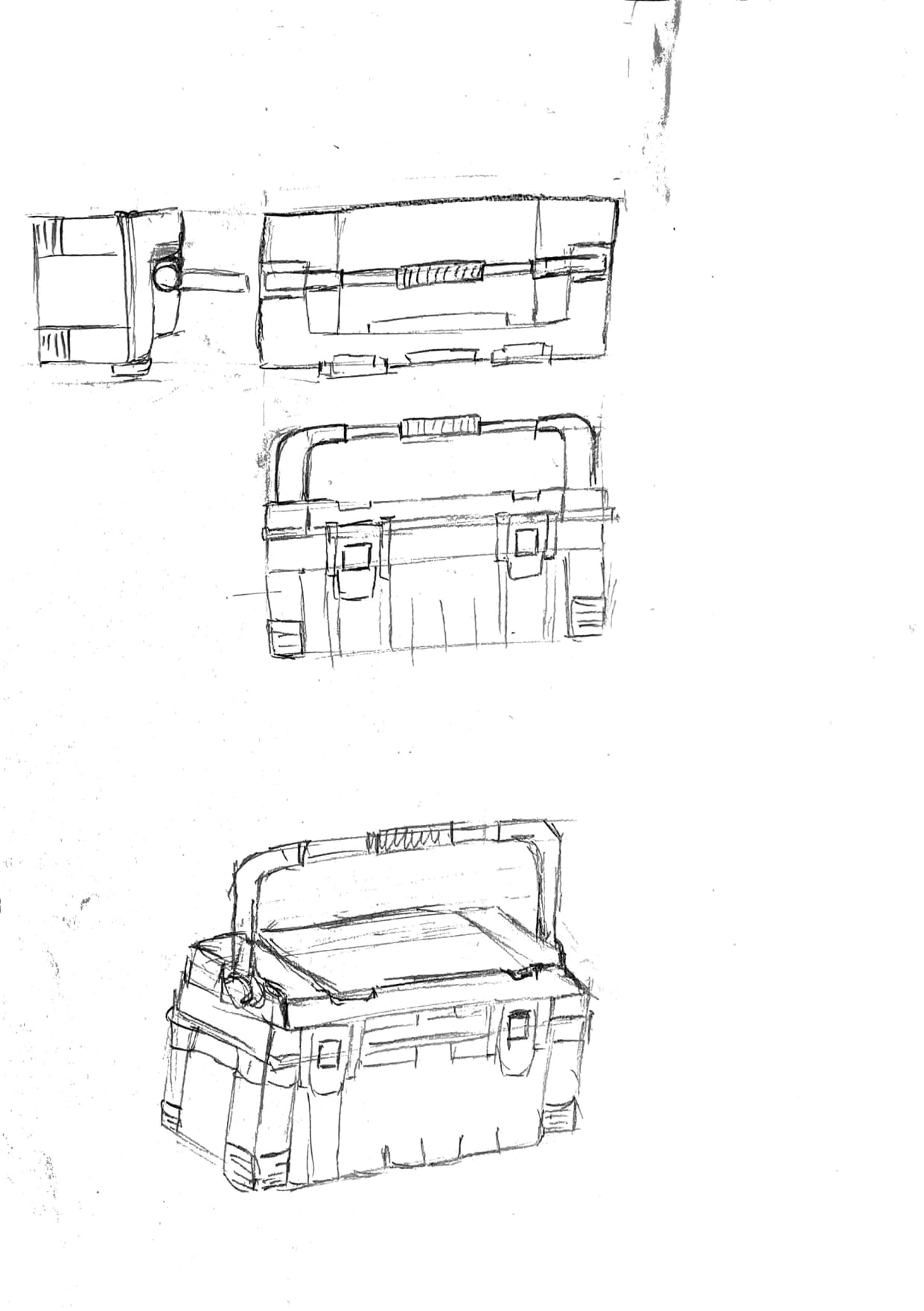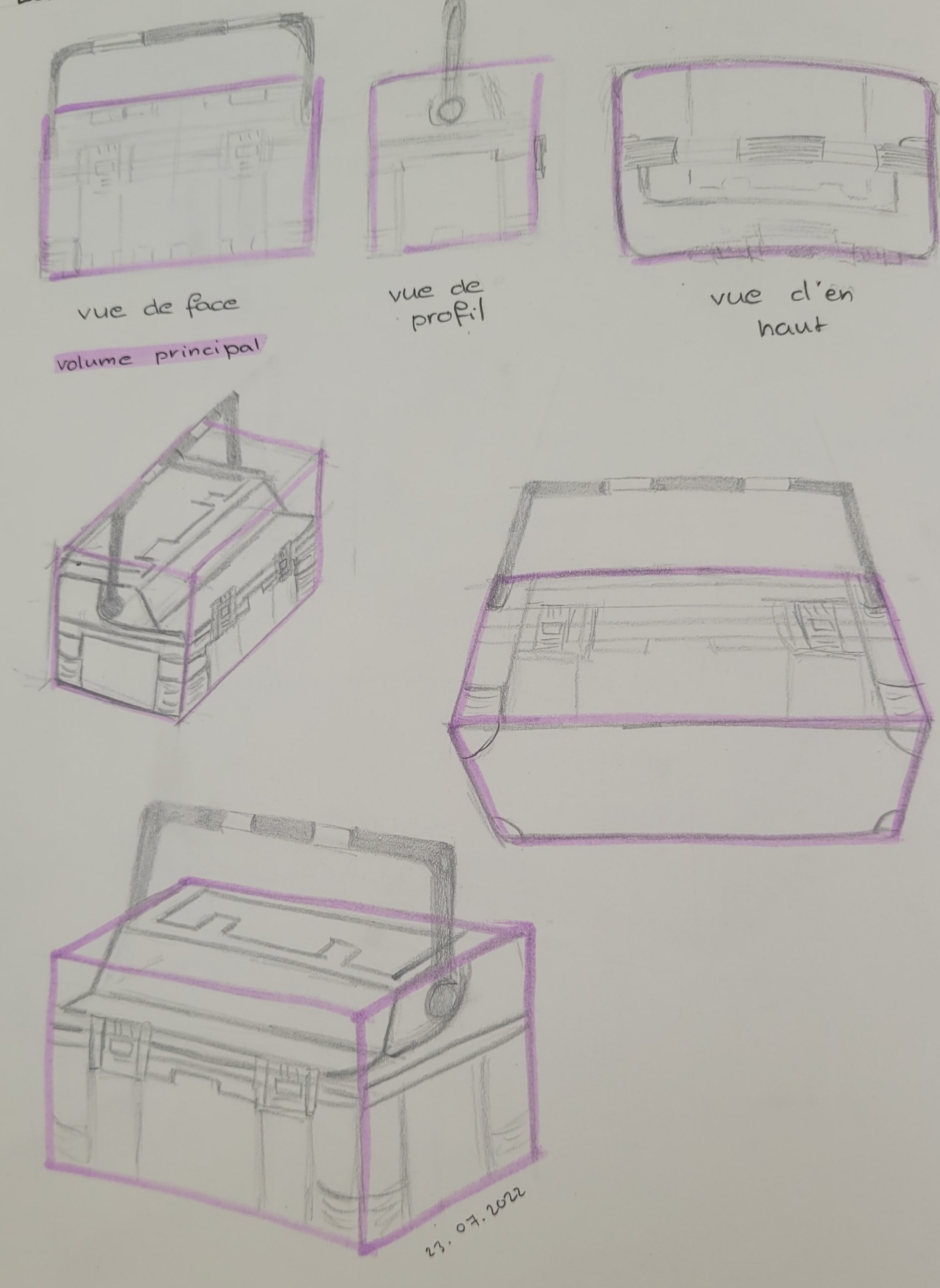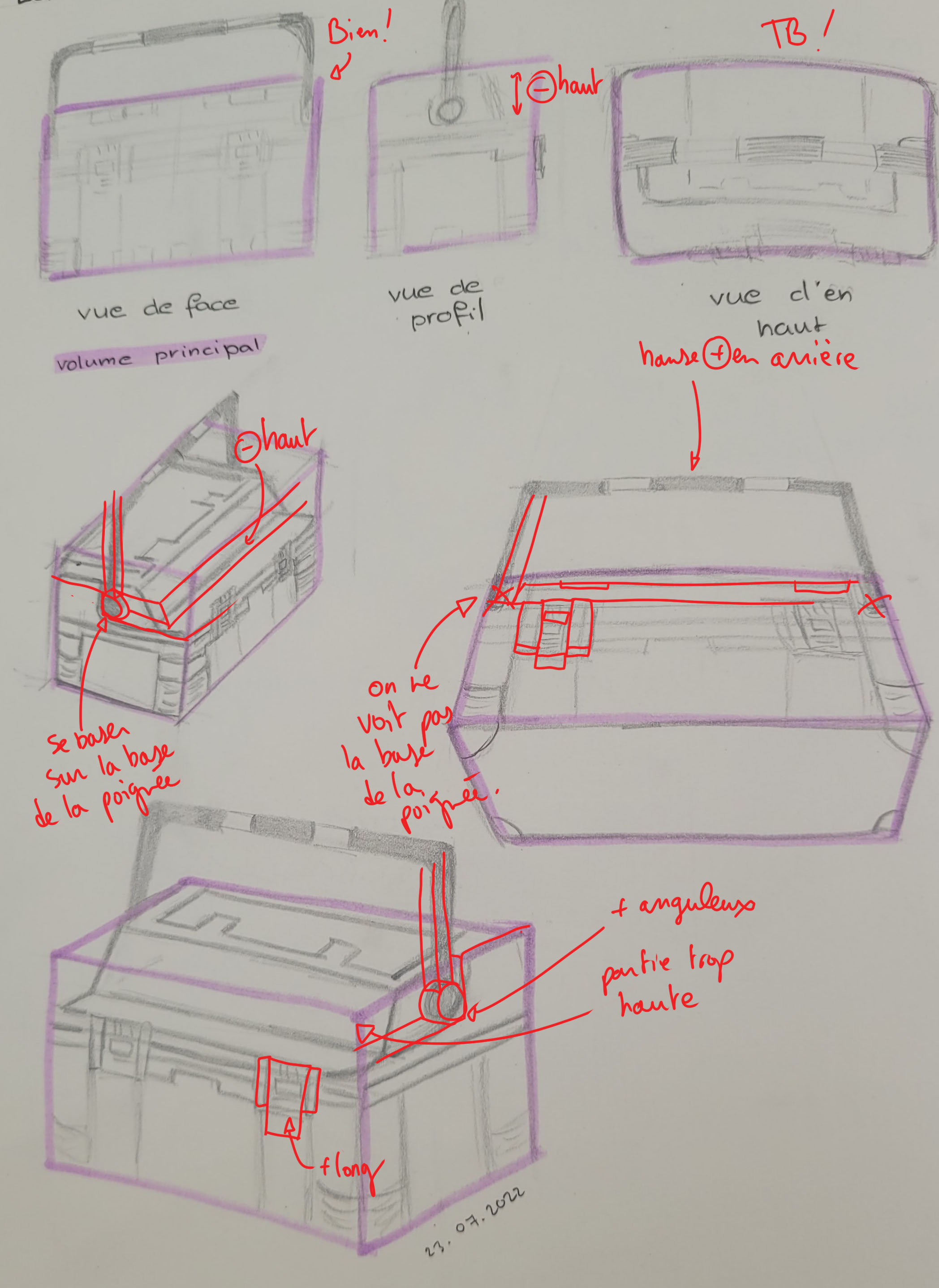 Tes autres vues t'ont aidé à comprendre l'objet c'est cool, mais attention aux proportions (ta vue de profil manque de détails ssur le dessus de la boîte notamment, et la poignée est trop petite en hauteur)