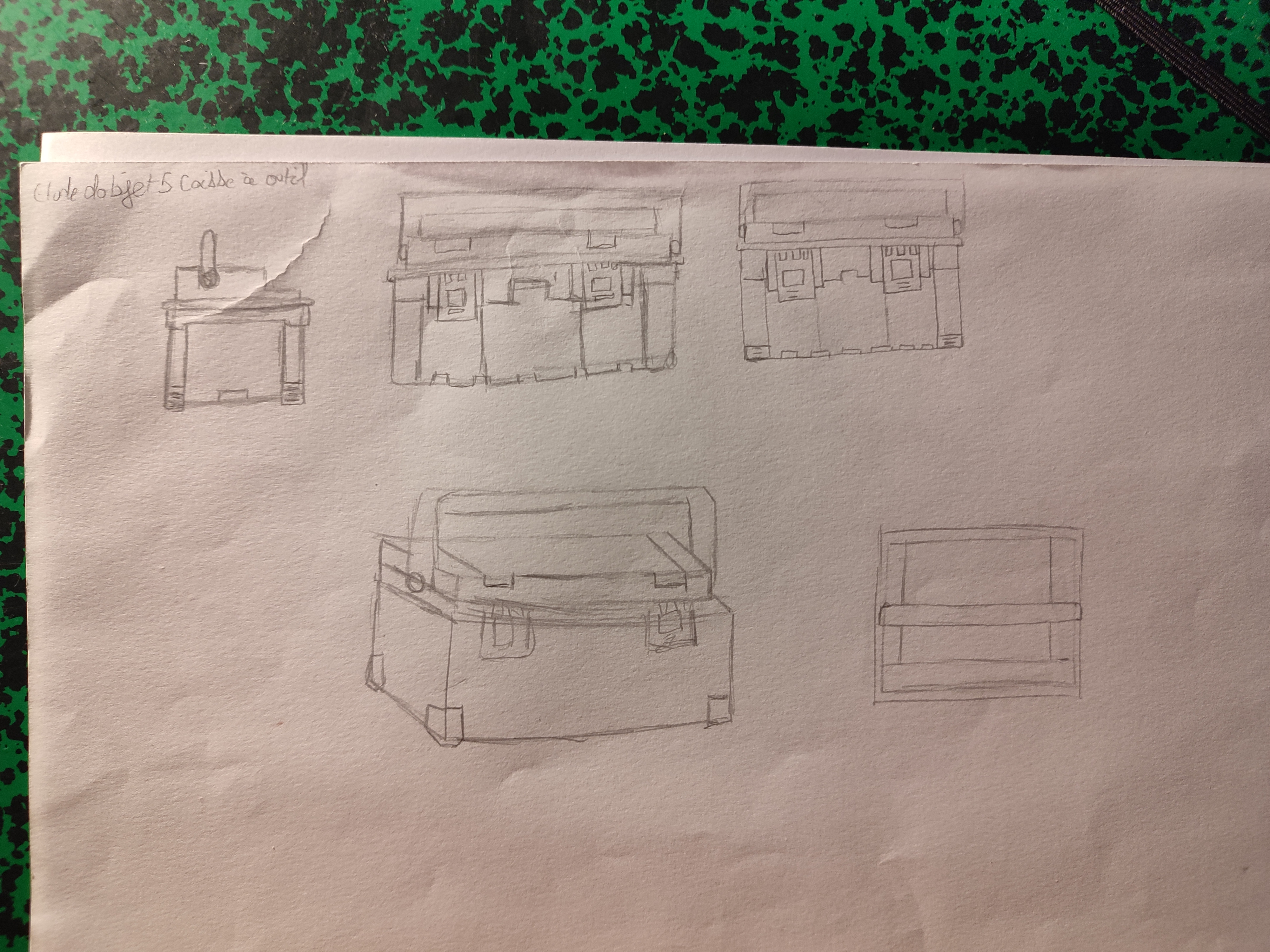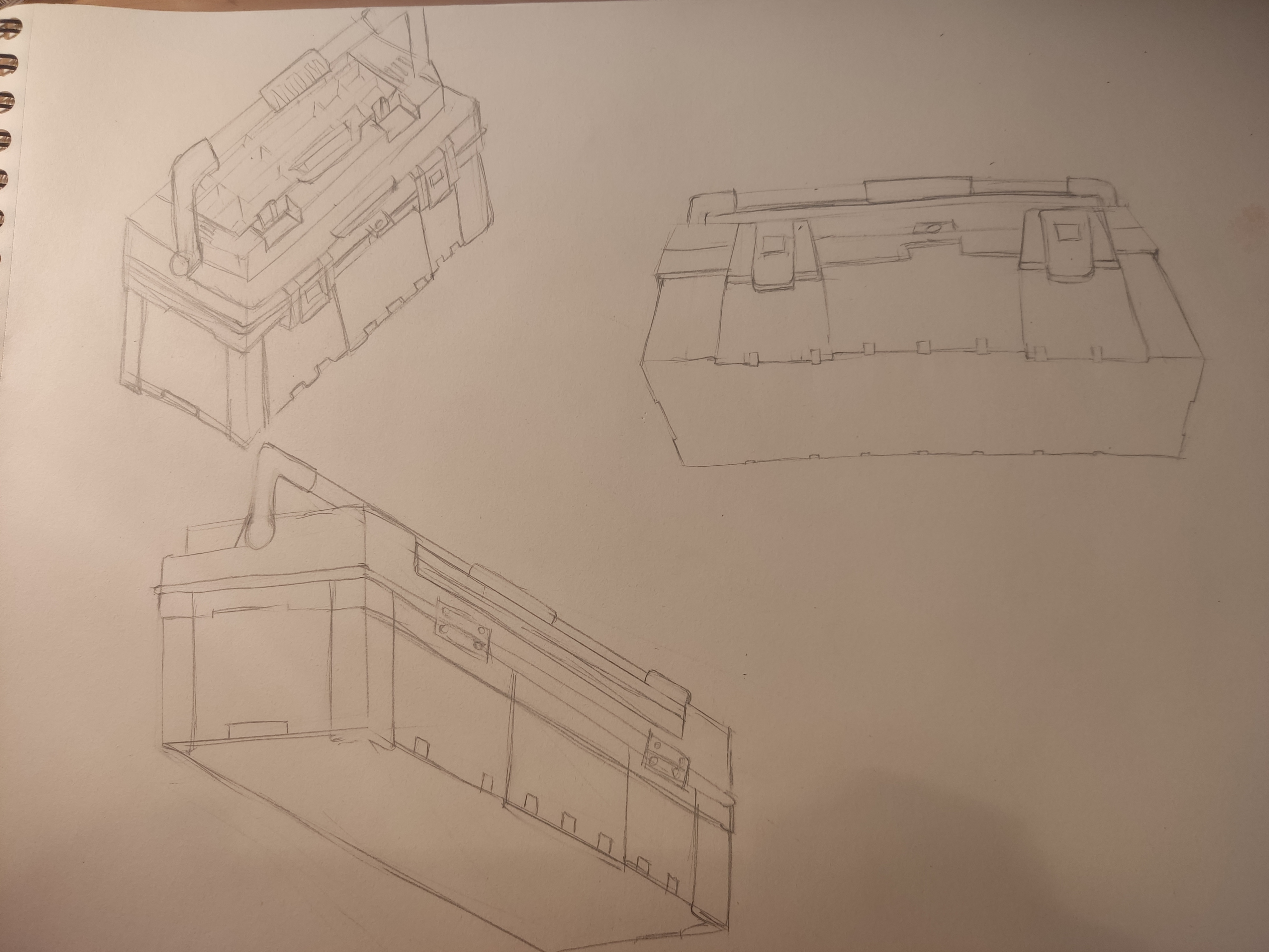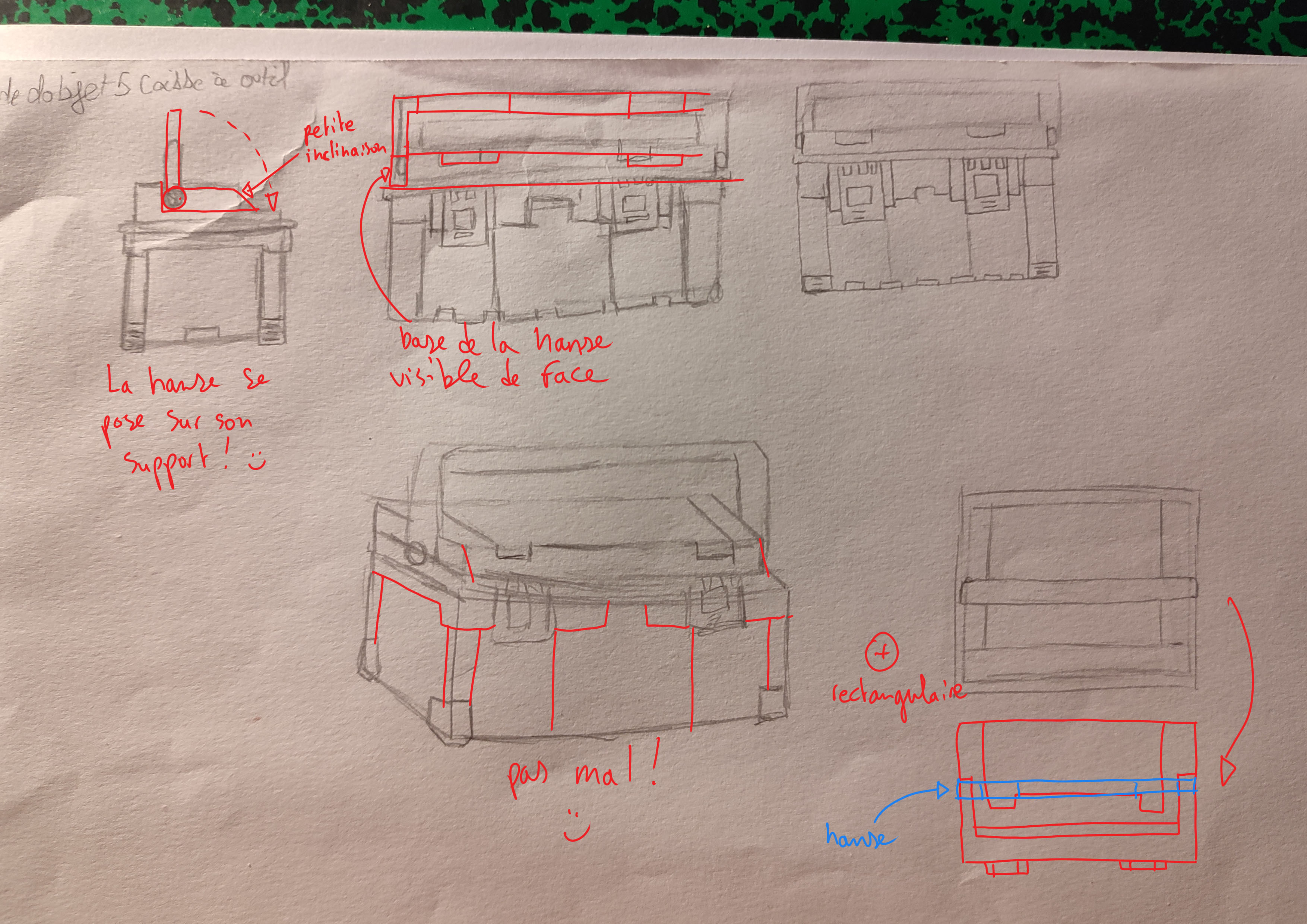 Tes autres vues t'ont aidé à comprendre l'objet c'est cool, mais attention aux proportions (ta vue de profil manque de détails ssur le dessus de la boîte notamment, et la poignée est trop petite en hauteur)