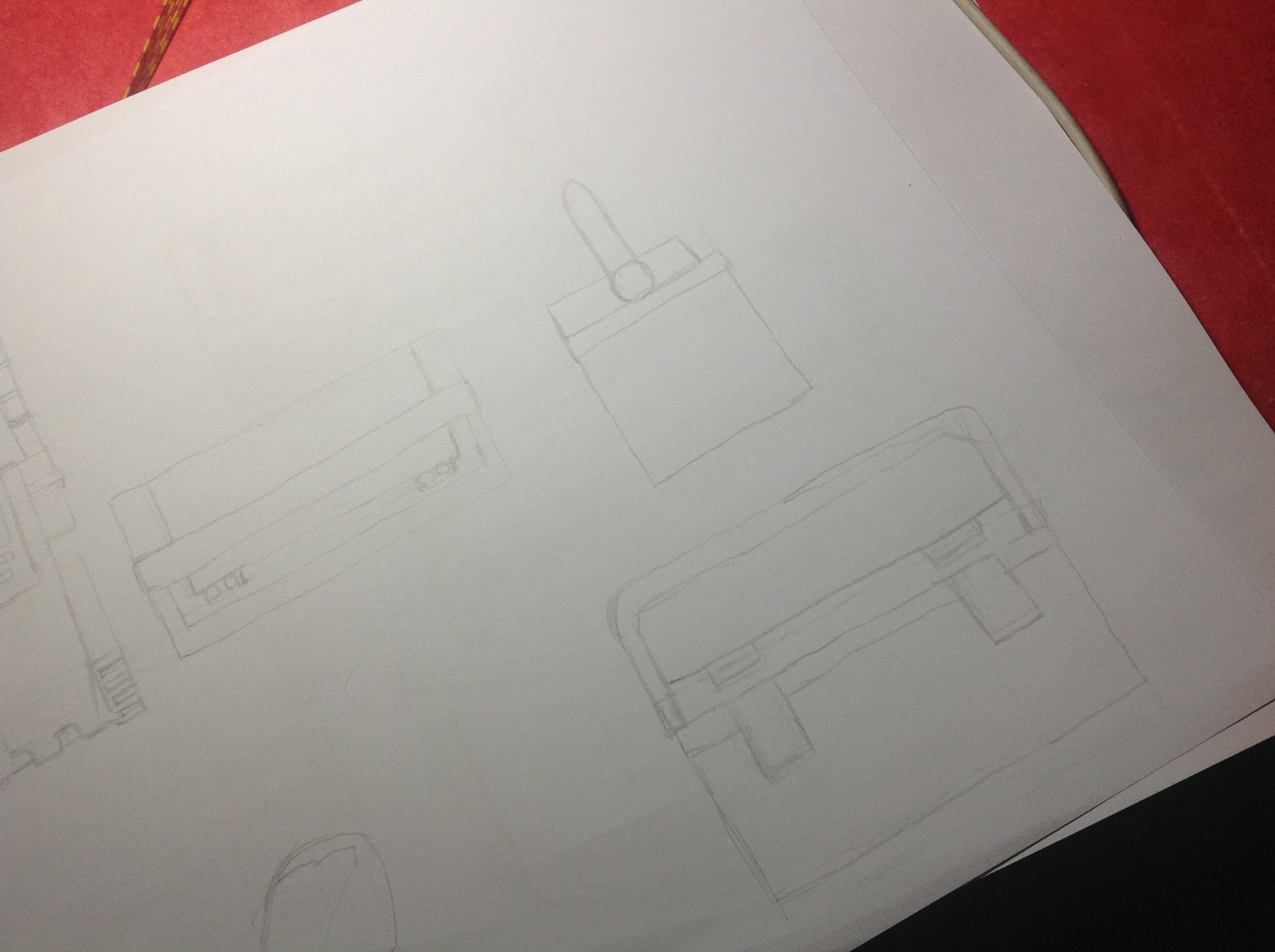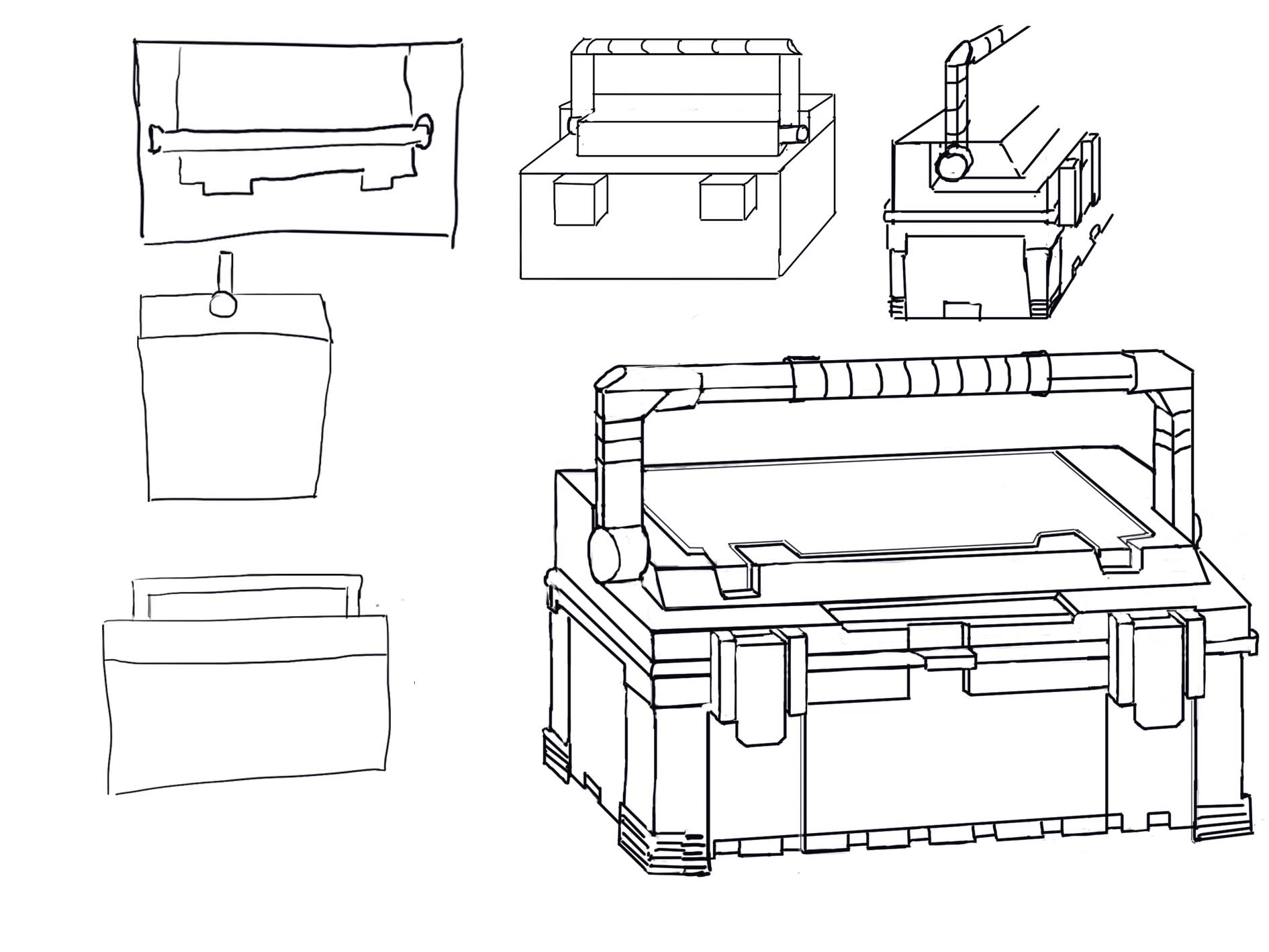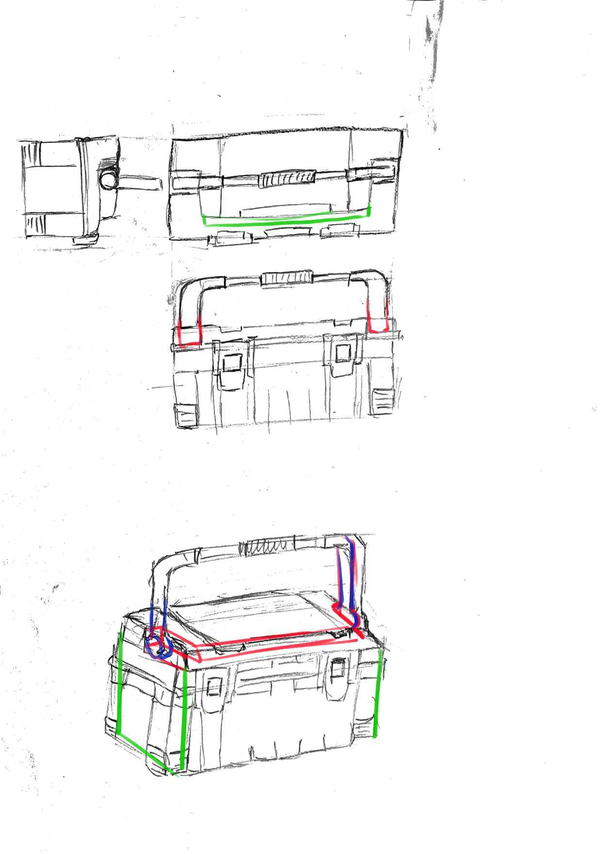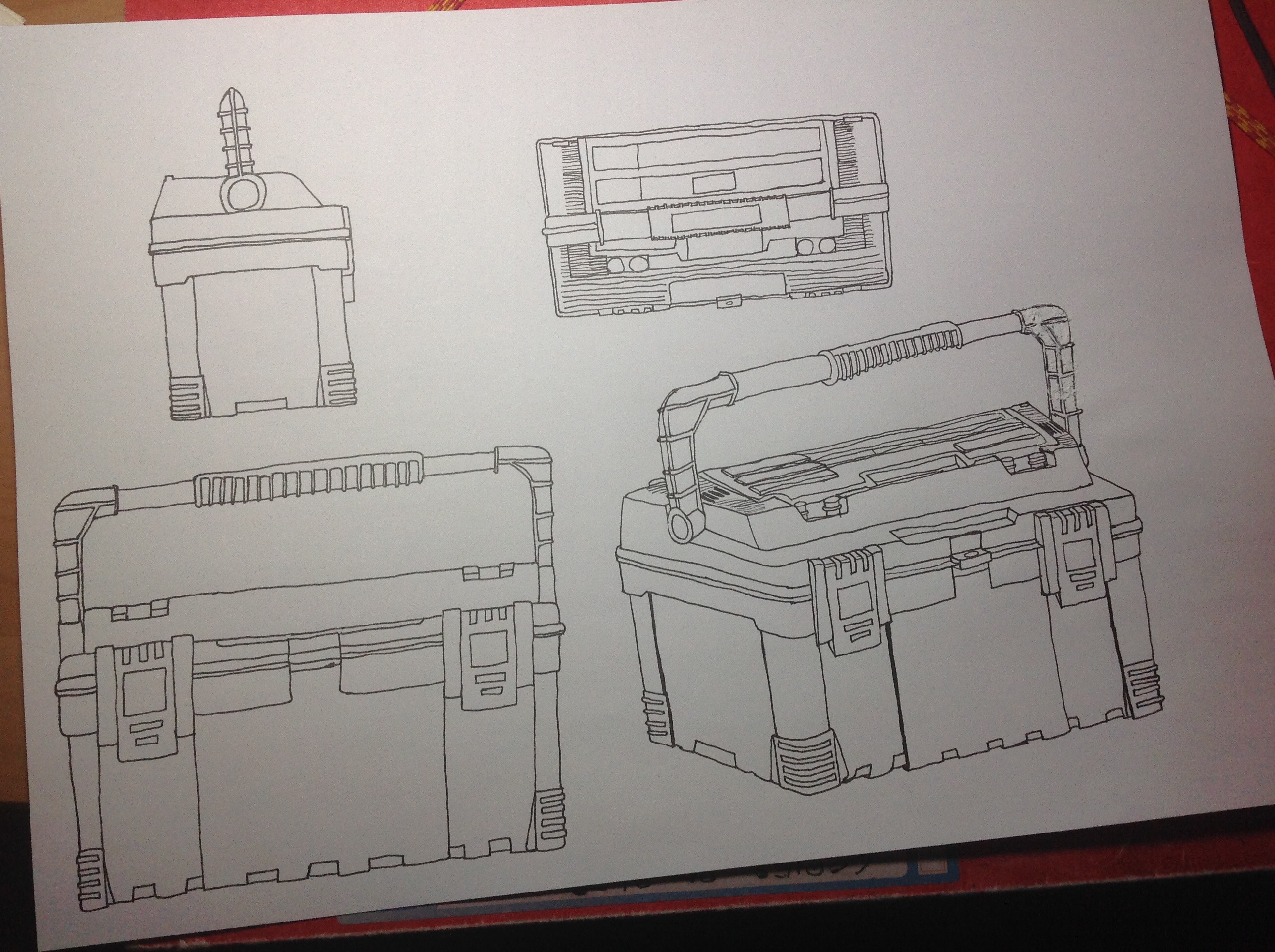 Tes autres vues t'ont aidé à comprendre l'objet c'est cool, mais attention aux proportions (ta vue de profil manque de détails ssur le dessus de la boîte notamment, et la poignée est trop petite en hauteur)