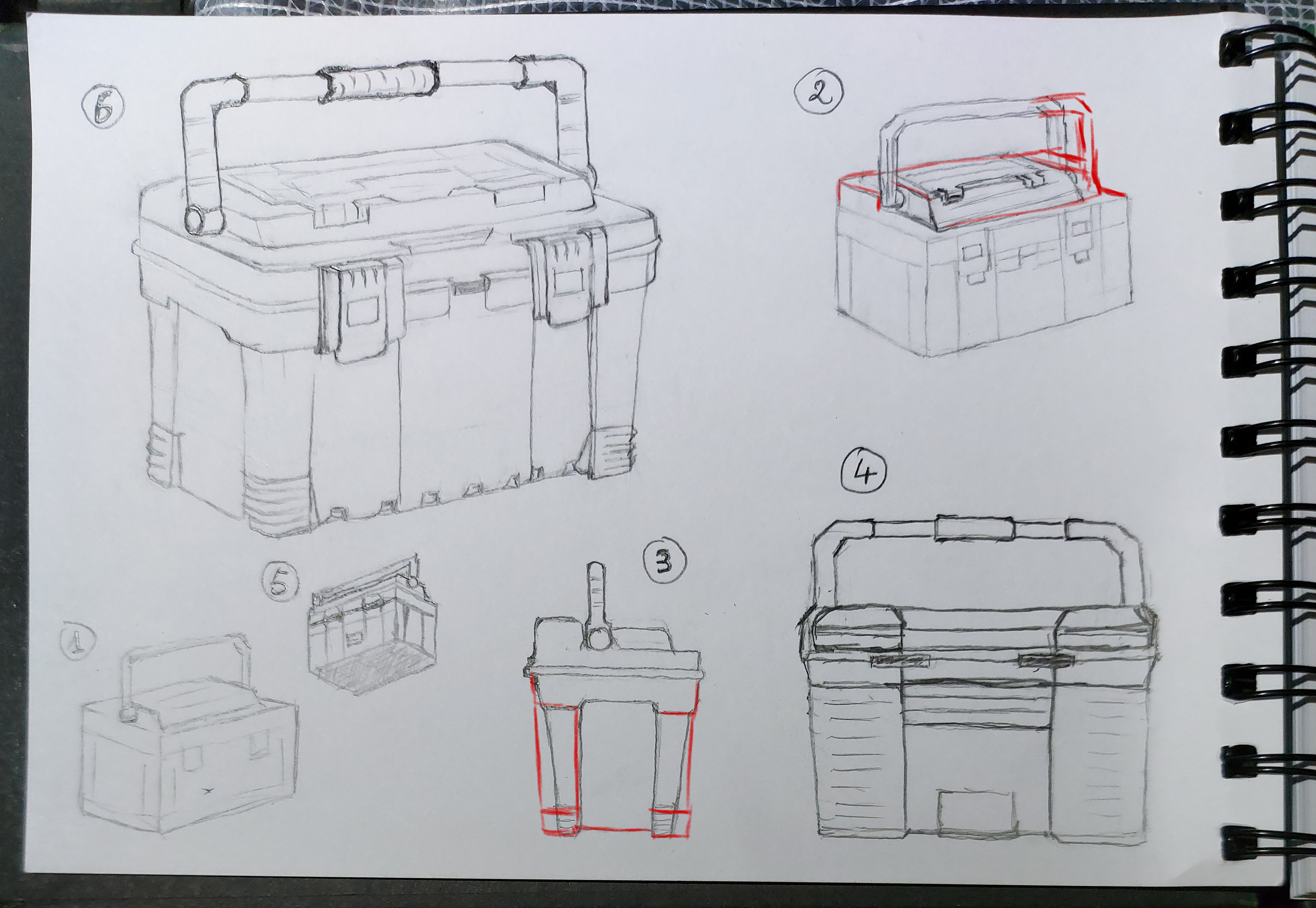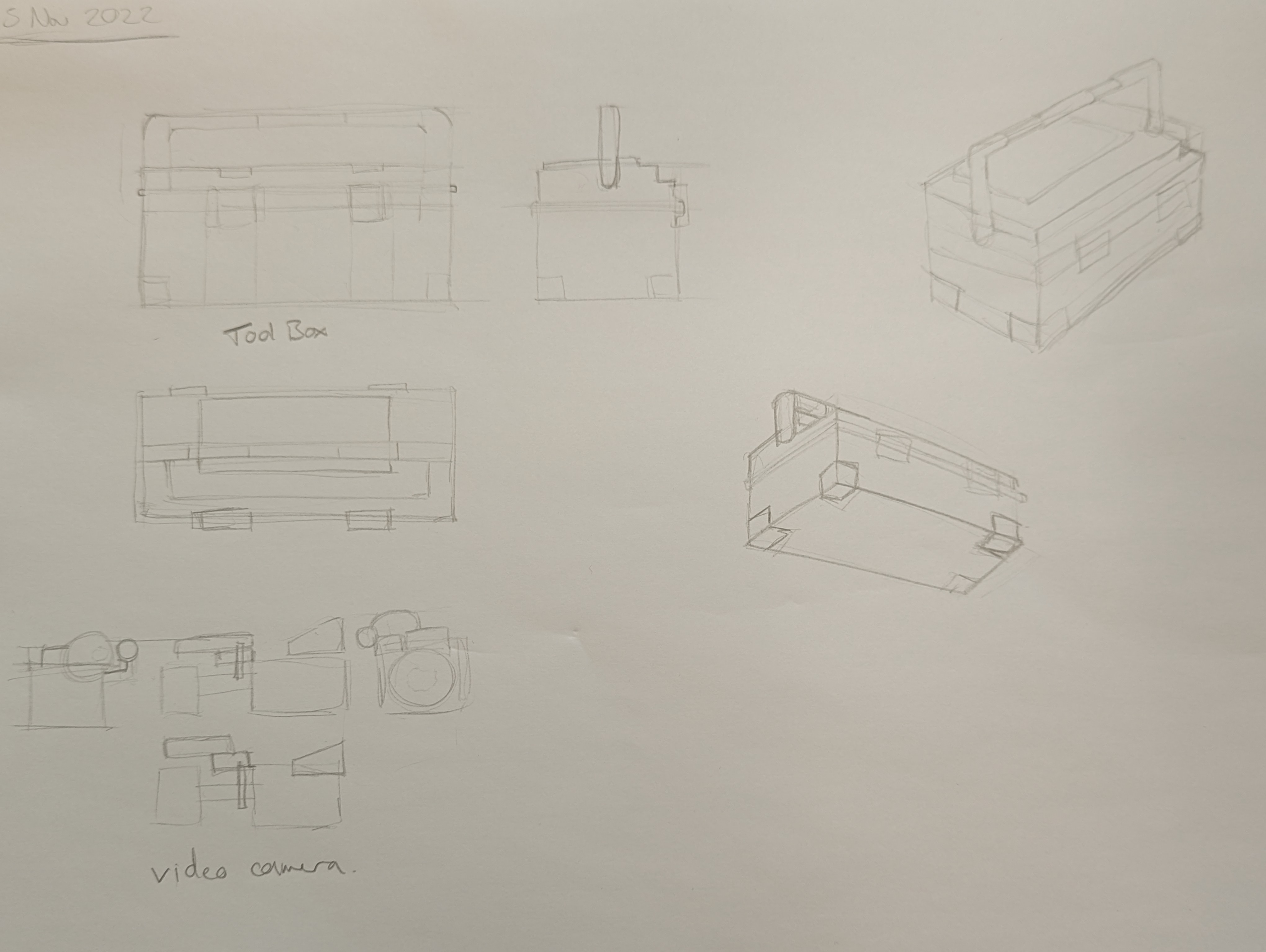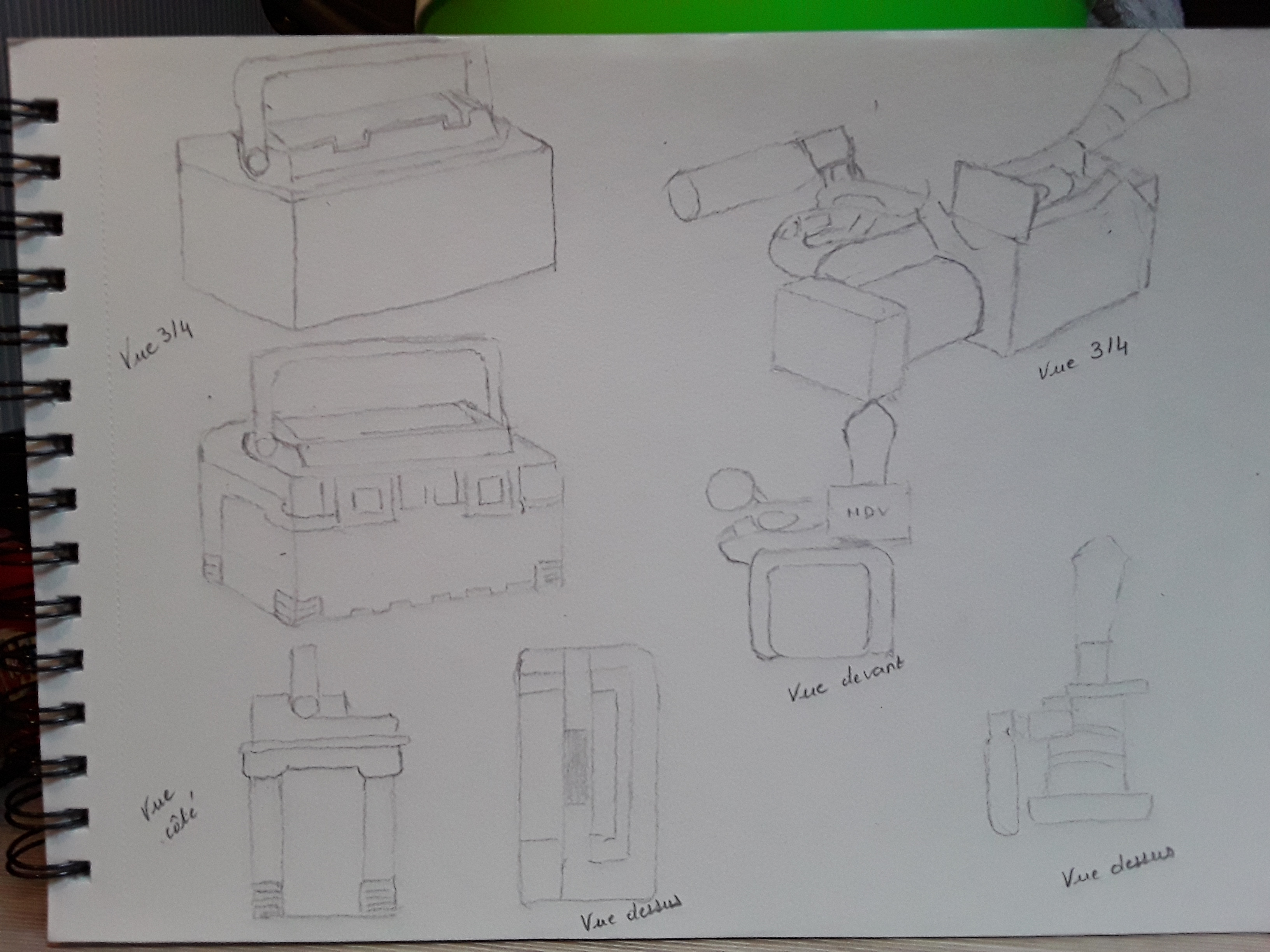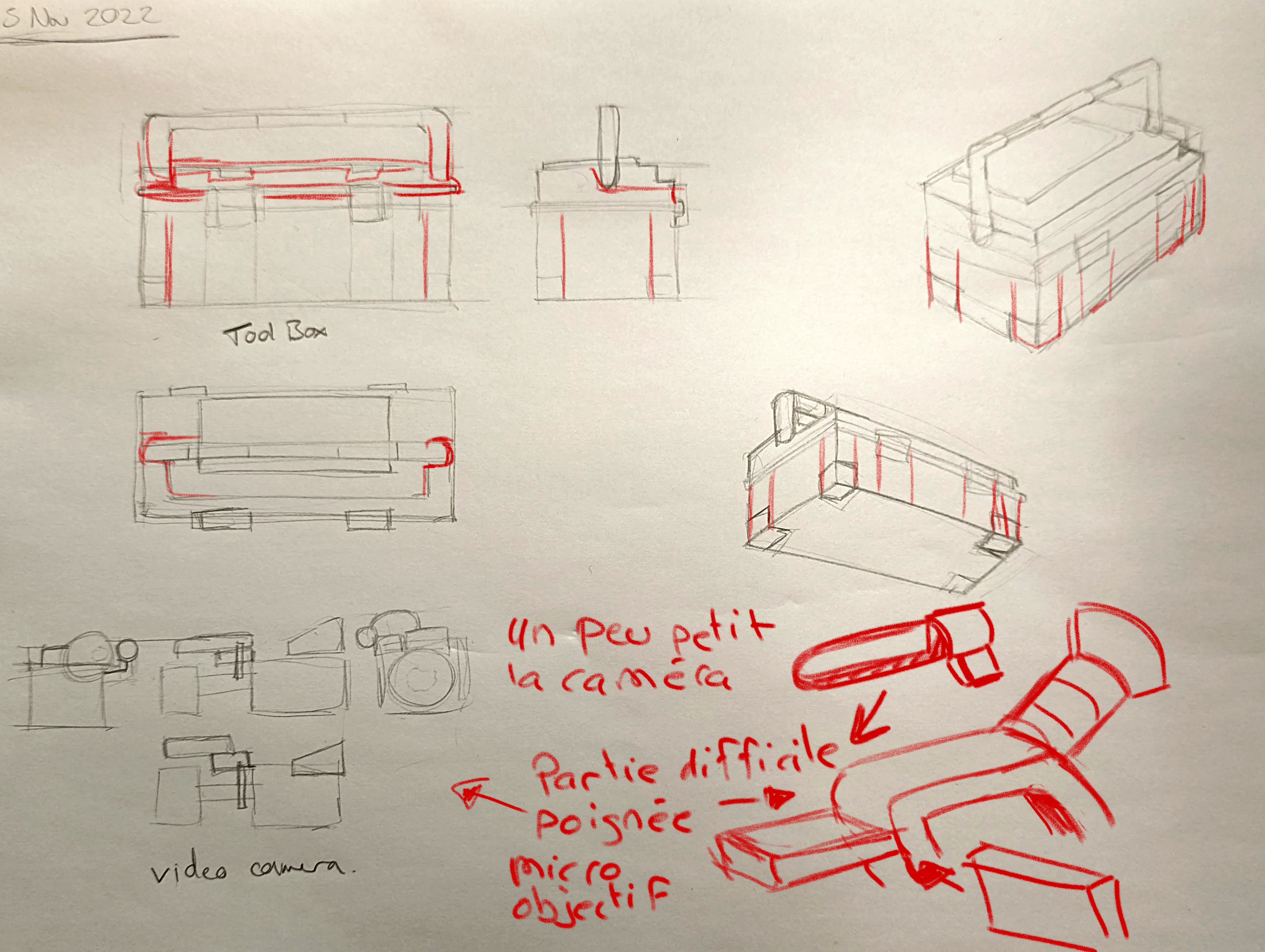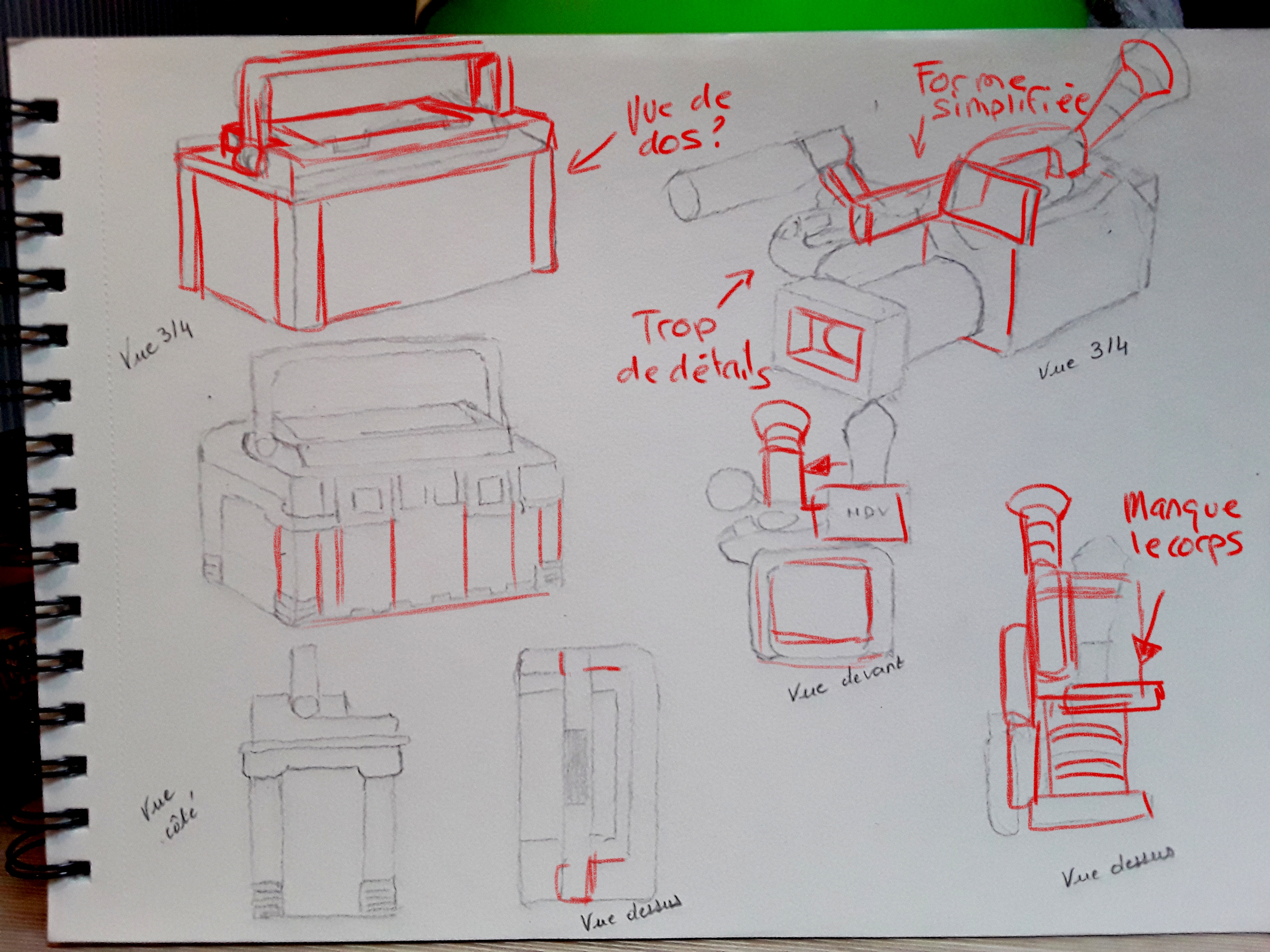 Bonjour Helen, beau boulot! Sur la caisse à outil, il y a juste des petits détails à affiner, je te laisse regarder mon correctif pour en juger. Sur la caméra, tes dessins sont malheureusement un peu trop petit et ça manque de détails. Je pense que la partie que tu as eu du mal à appréhender, c'est l'assemblage poignée/micro/objectif/écran (mais il faut dire que c'est assez caché sur le modèle). Tu dois essayer de comprendre ce que tu vois et ensuite le retranscrire en formes simples, même si ça ne te semble pas 100% fidèle dans un premier temps. Tu pourras toujours affiner ton étude par la suite.