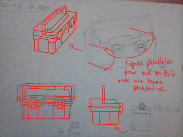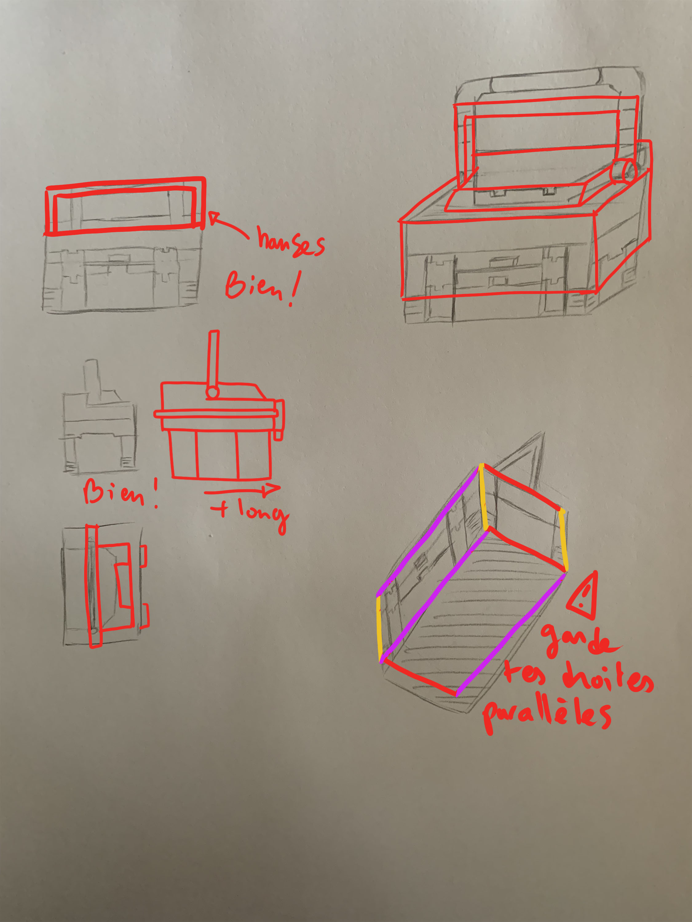 En vrai c'est plutôt réussi même au niveau perspective ! Attention juste à ce que les traits les uns en face des autres soient bien parallèles. Cette boîte est pluôt comprise mais attention juste au dessus de la boîte, on voit mal que la anse se pose sur un rebord. Je joins un schéma du dessus de la boîte pour mieux comprendre :)
