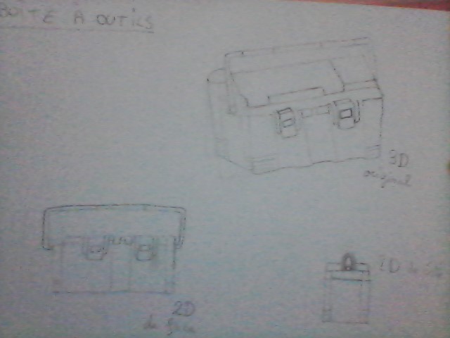 Joli travail ! Ne t'inquiètes pas on a juste besoin de la construction, pas des détails ^^ Les vues 2D sont bien ! Pour ce qui est de la 3D la perspective est plutôt réussie mais le dessus de la boîte n'est pas totalement compris. On a la anse qui doit se poser sur un rebord, avec un ptit bout qui part derrière de chaque côté. Pour mieux comprendre je vais joindre un tuto montrant bien le dessus de la boîte, mais ça viendra plus tard car je ne sais pas pourquoi mon image ne veut pas s'envoyer ^^'