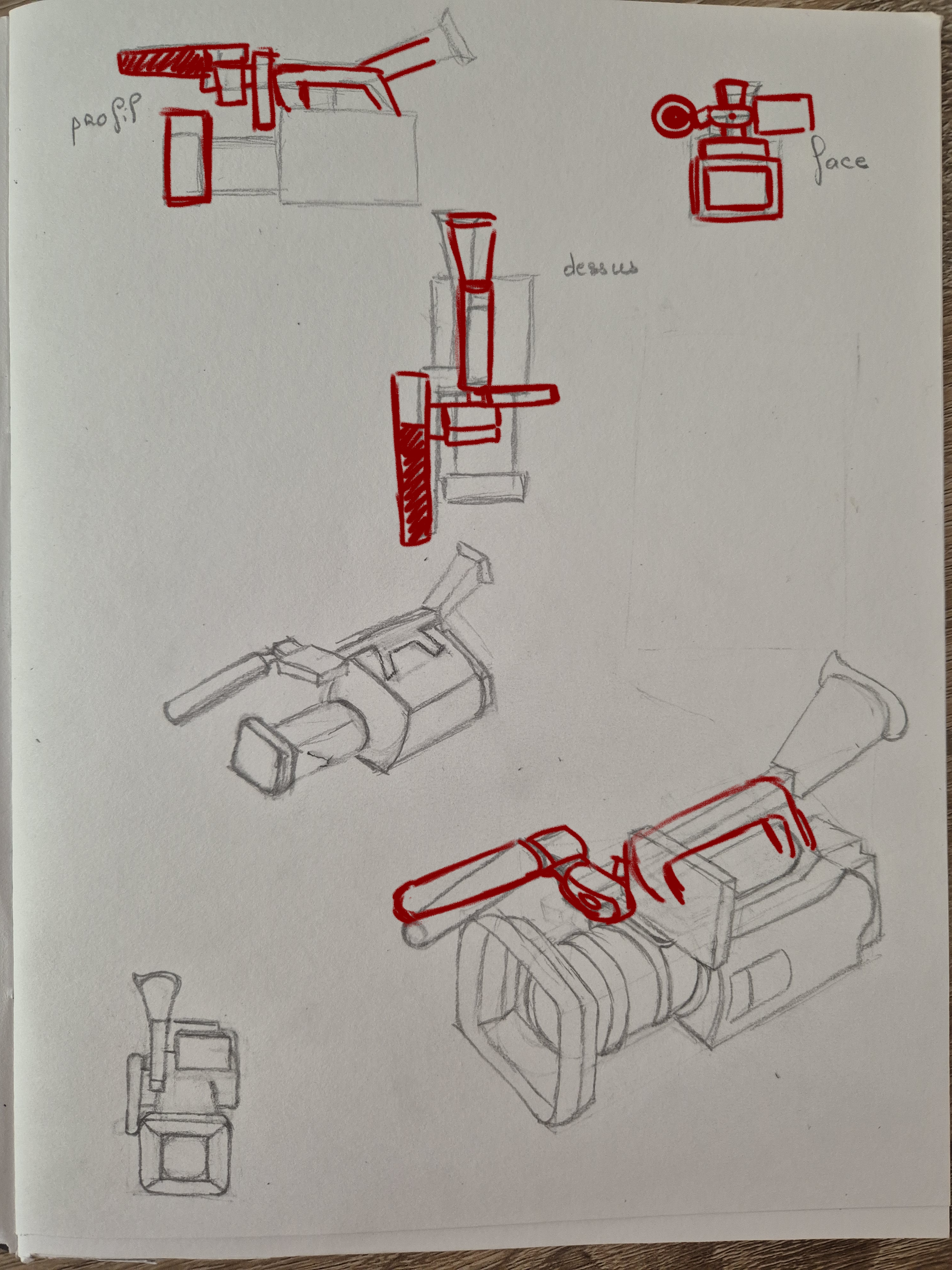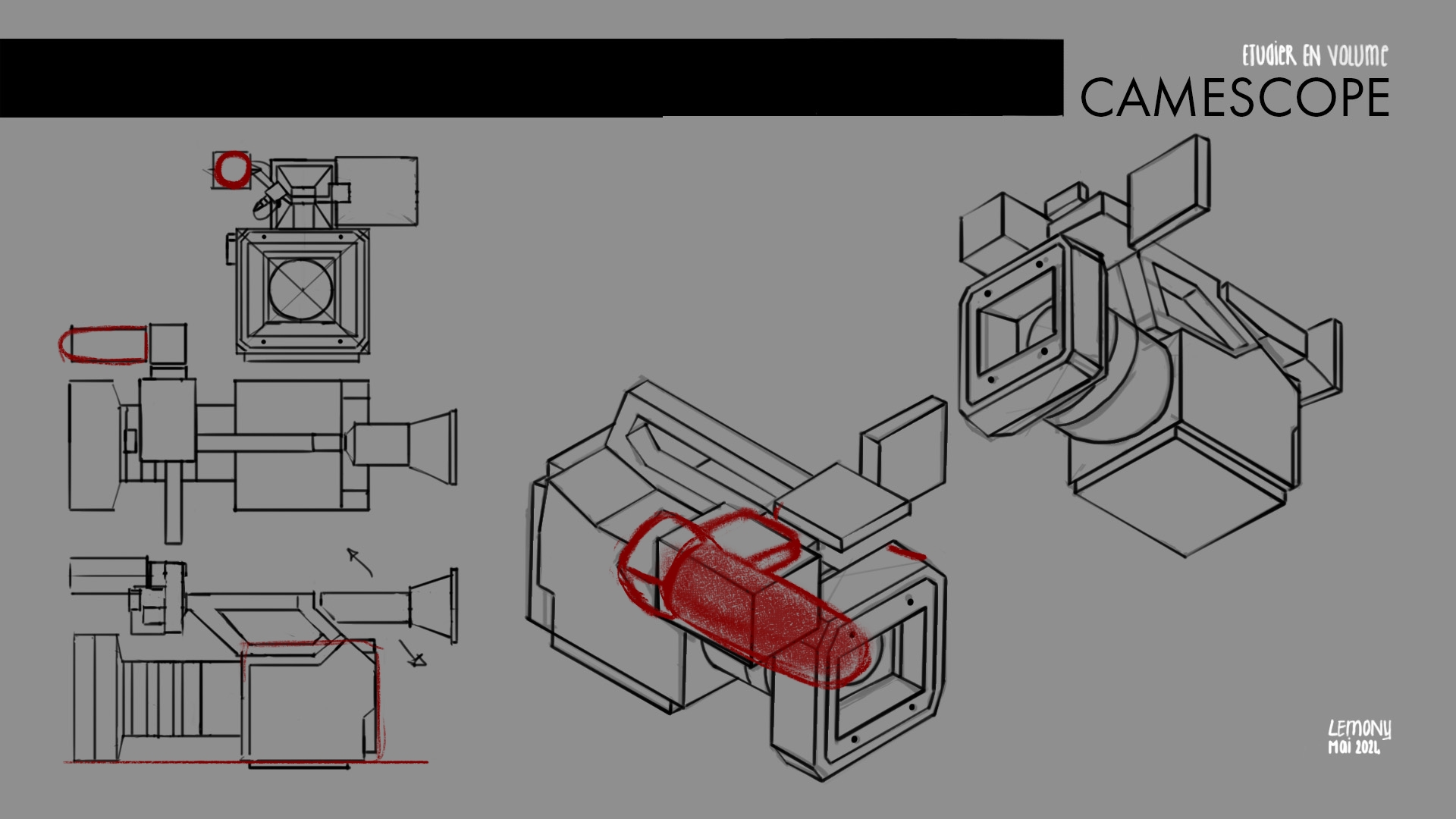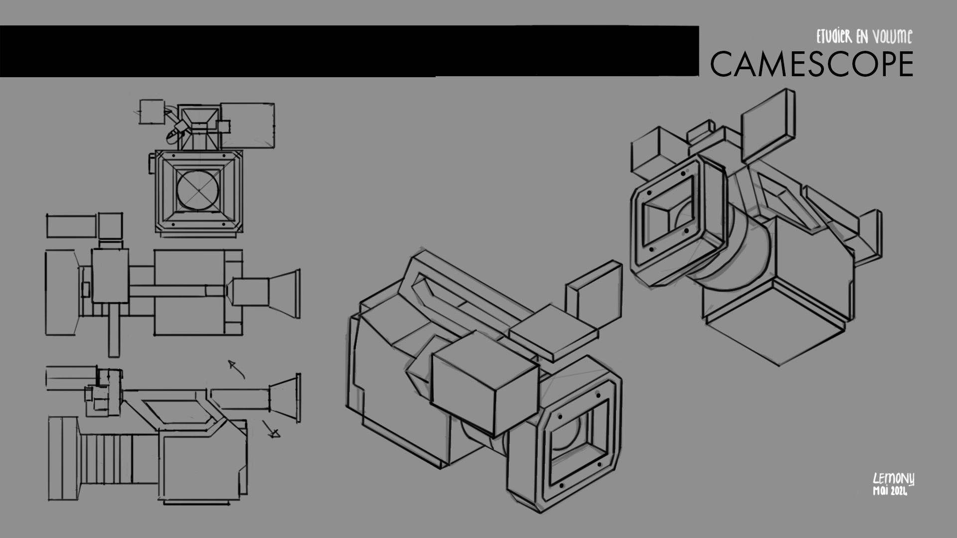 Bonjour Nouswel, c'est vrai que la caméra est un poil plus complexe. Tu t'en es bien tiré, tu as bien identifié les différents éléments qui compose le sujet, il y a juste quelques incohérences de proportion, notamment la taille du petit écran qui change d'une vue à l'autre, et se trouve souvent trop petite. Attention aussi à la longueur de l'objectif. Sur la première vue (de profil) l'objectif devrait reposer au même niveau que le corps de la caméra. Sinon, à part ces quelques ajustement, c'est du bon travail! ^^