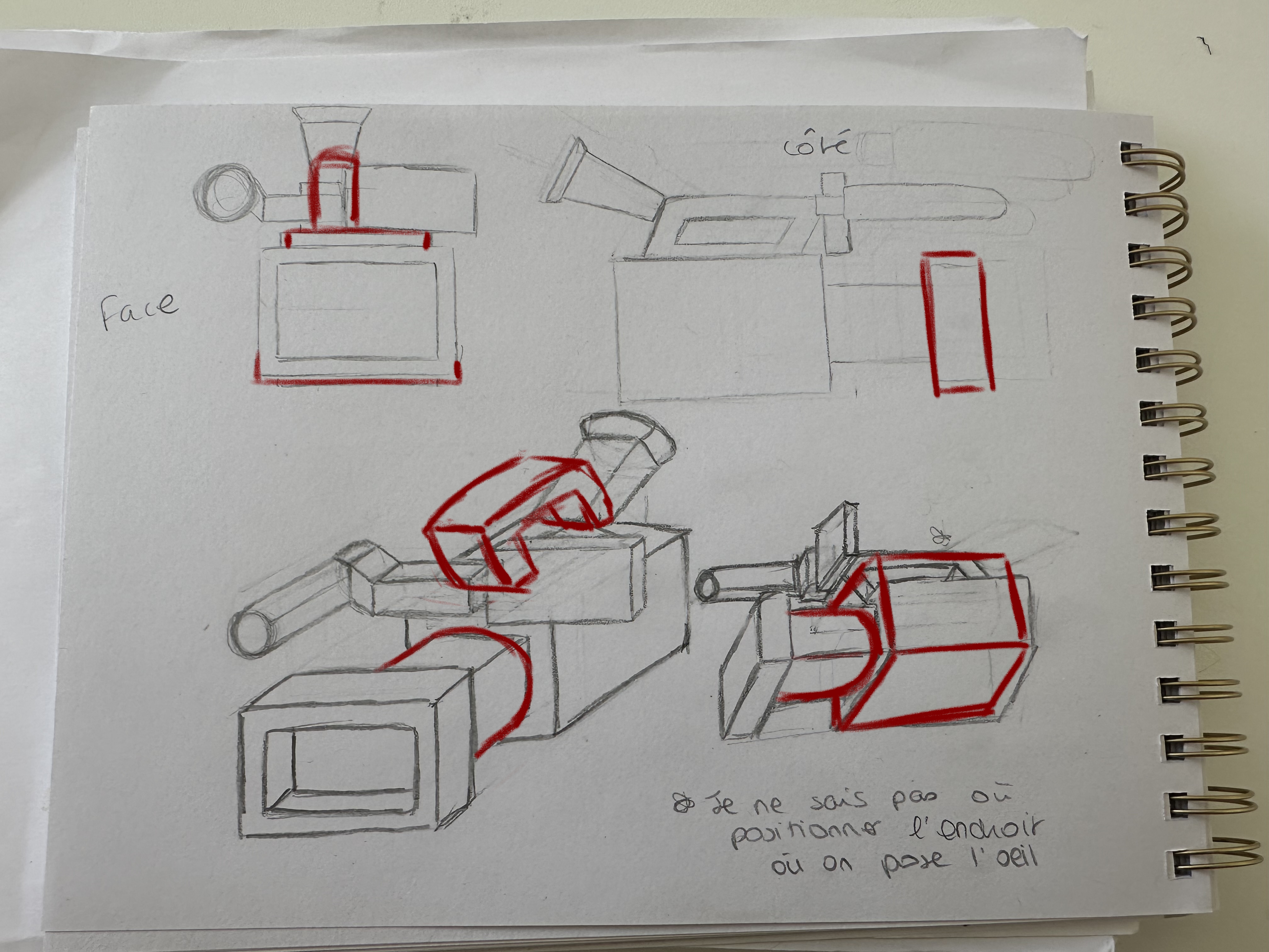Bonsoir Ginie, voici finalement mon correctif ! C'est très bien ce que tu as réalisé. Fais attention au placement de l'écran et du micro, privilégie d'abord le placement de la poignée puisque ces éléments viennent s'y fixer. Sur les vues en perspective ton objectif est un poil trop long, mais ce n'est pas trop gênant 😊