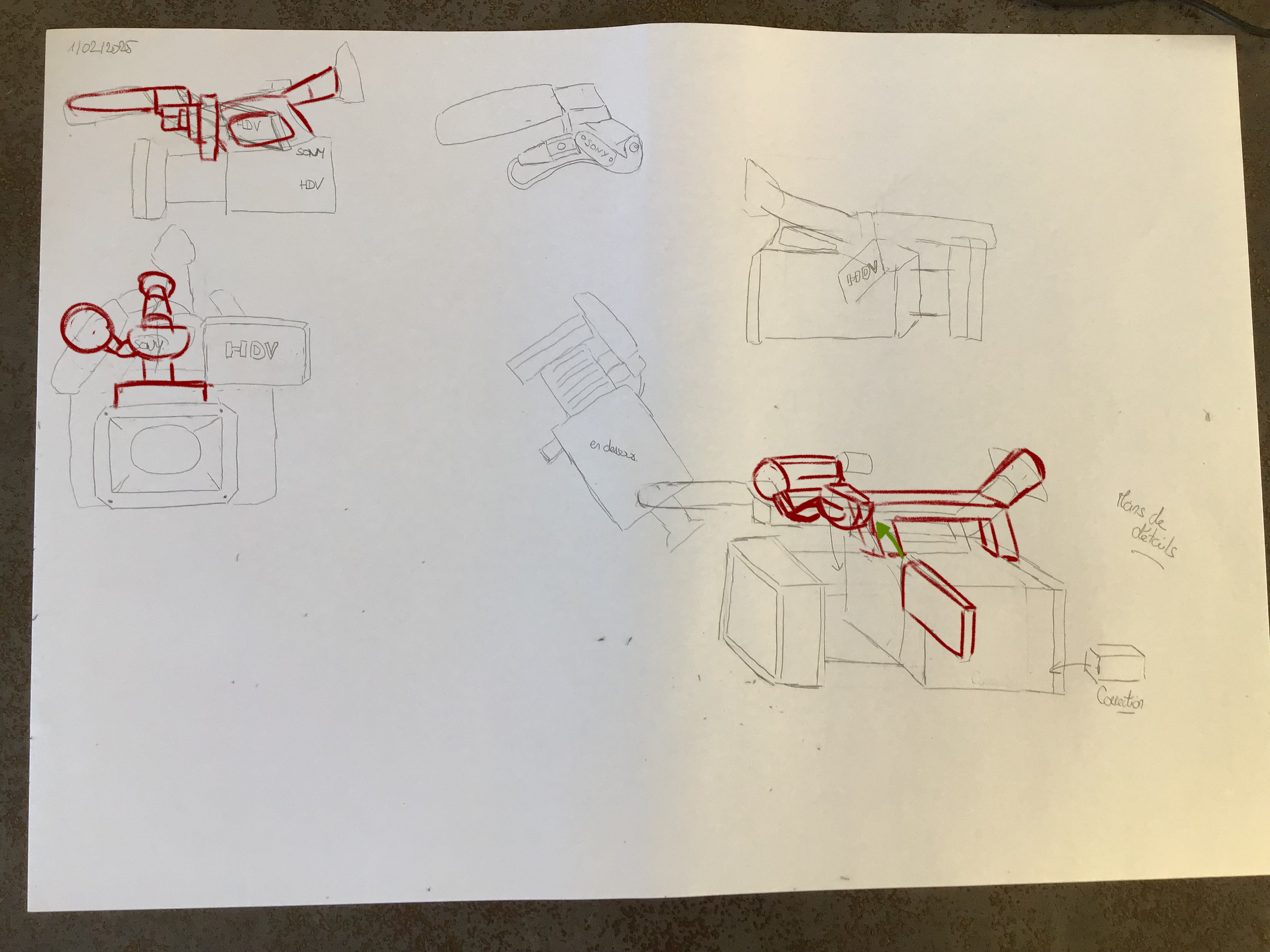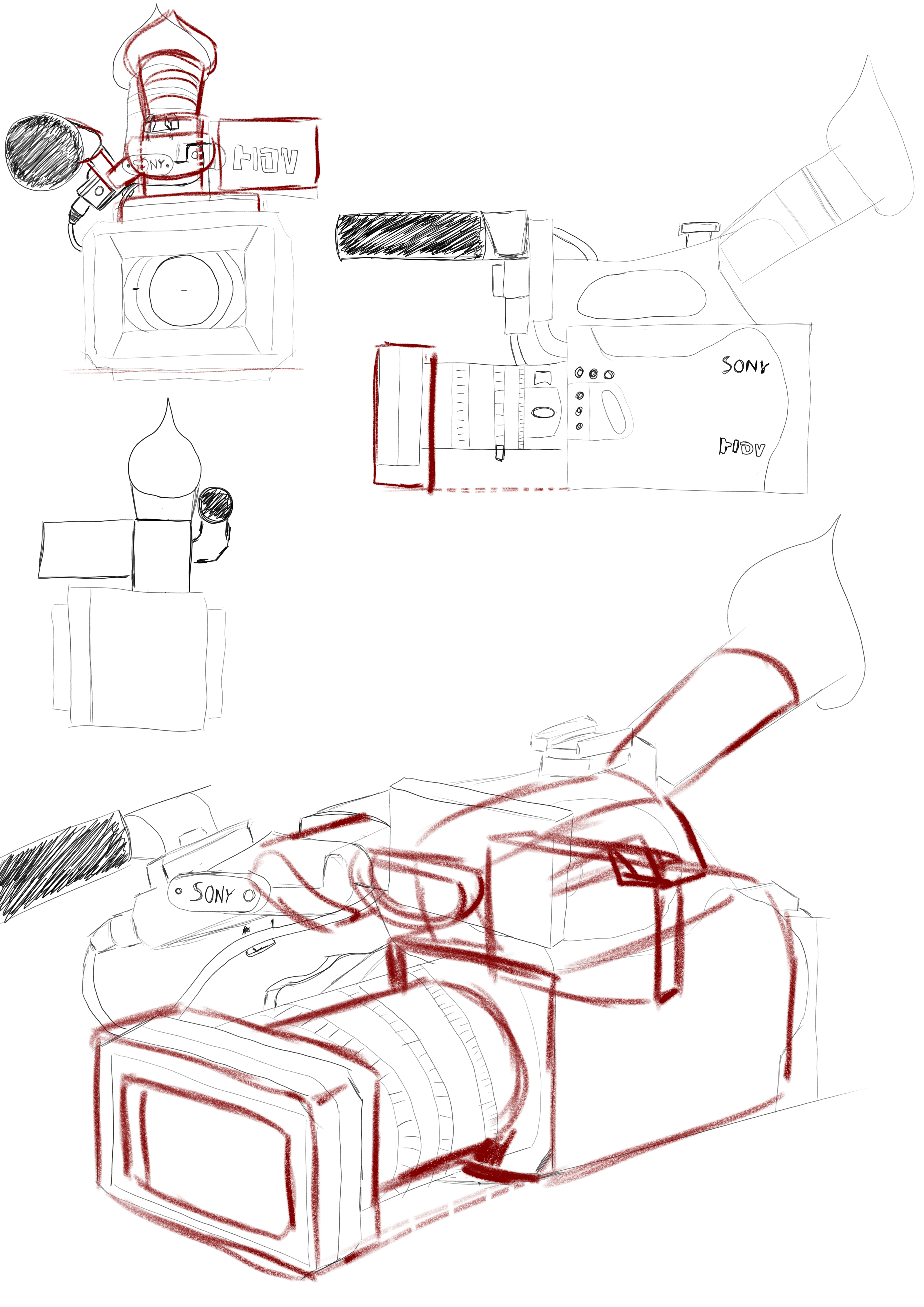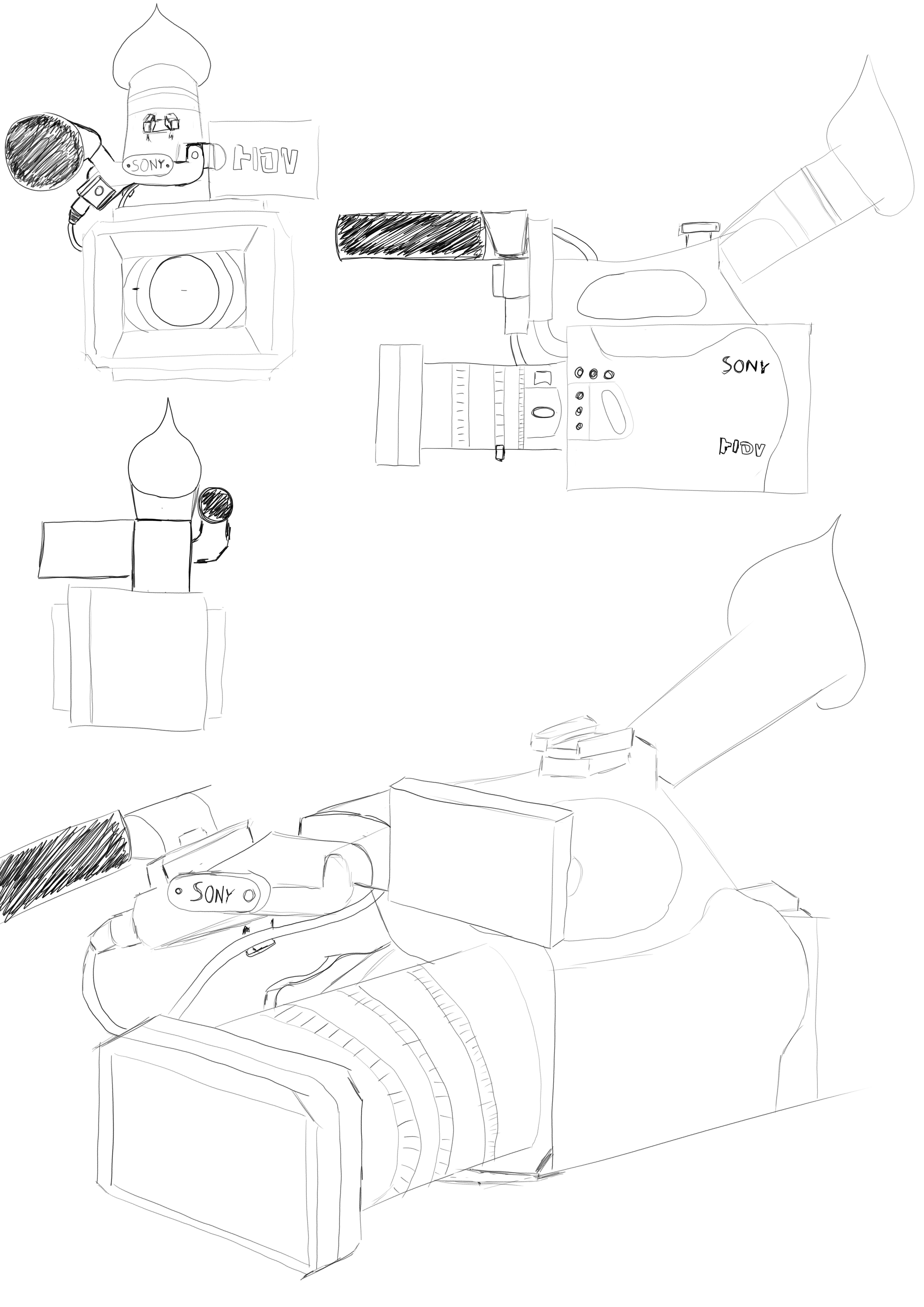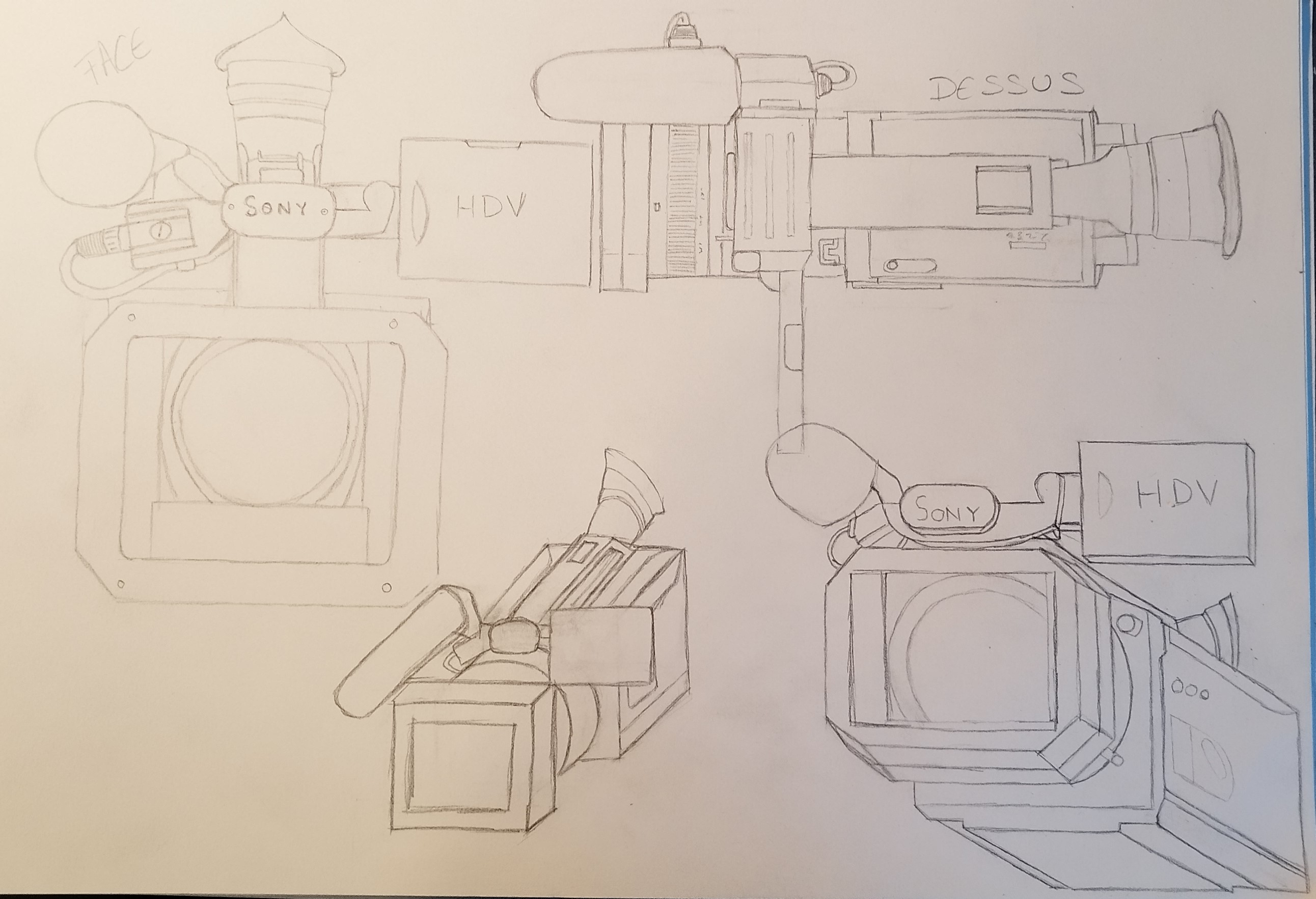 Bonjour Baleno, pas mal du tout! Effectivement se laisser aller à trop de détails peut te faire passer à côté de l'essentiel! Ici, la partie qui pêche un peu c'est la poignée de la caméran qui sous certains angles en vient presque qu'à disparaître tant elle s'applatit! C'est une partie importante, puisqu'elle est le point de jonction des autres éléments (micro, écran et oculaire). Pour le reste c'est du bon boulot! Si tu te laisses trop aller dans les détails fait toi des séries d'exercices de dessins ultra simplifiés à base de cube et de forme basique! ^^