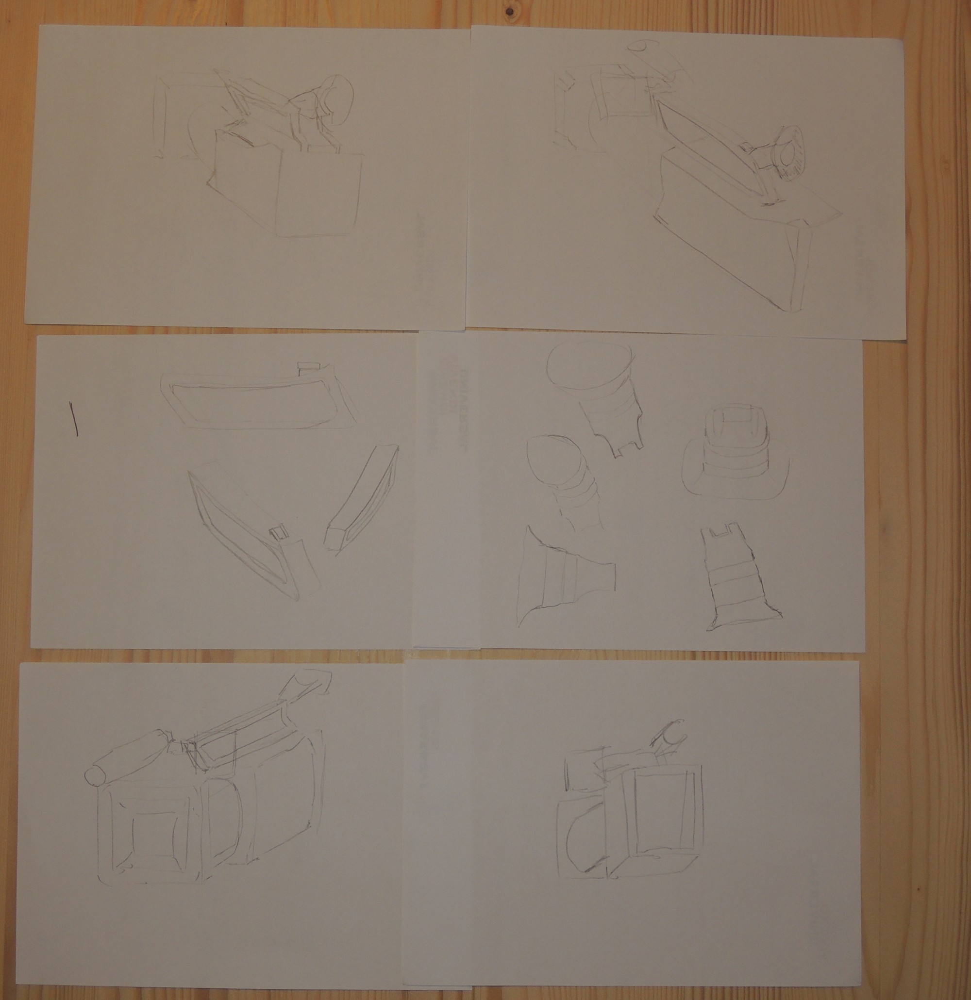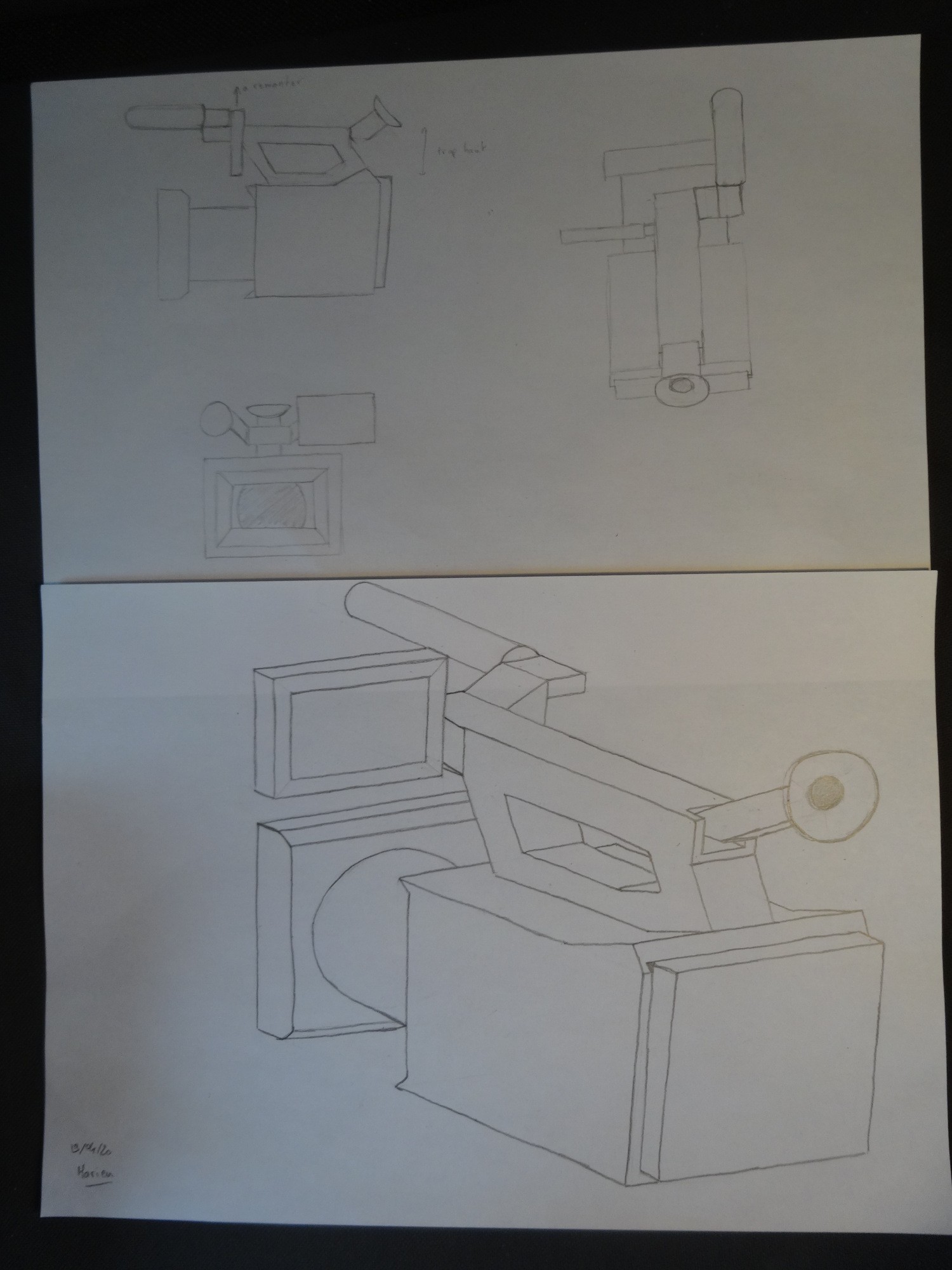 Ci-joint, une planche d'étude en 2D, un paquet de croquis/brouillon fait sur un bloc de papier (en petit format du coup) et une vue en perspective de la caméra. En attendant vos remarques, je vais aller regarder la vidéo de correction (et le cours d'après).