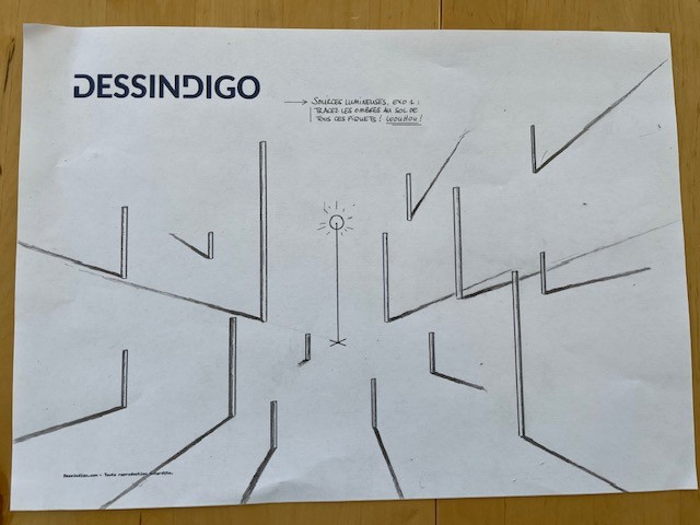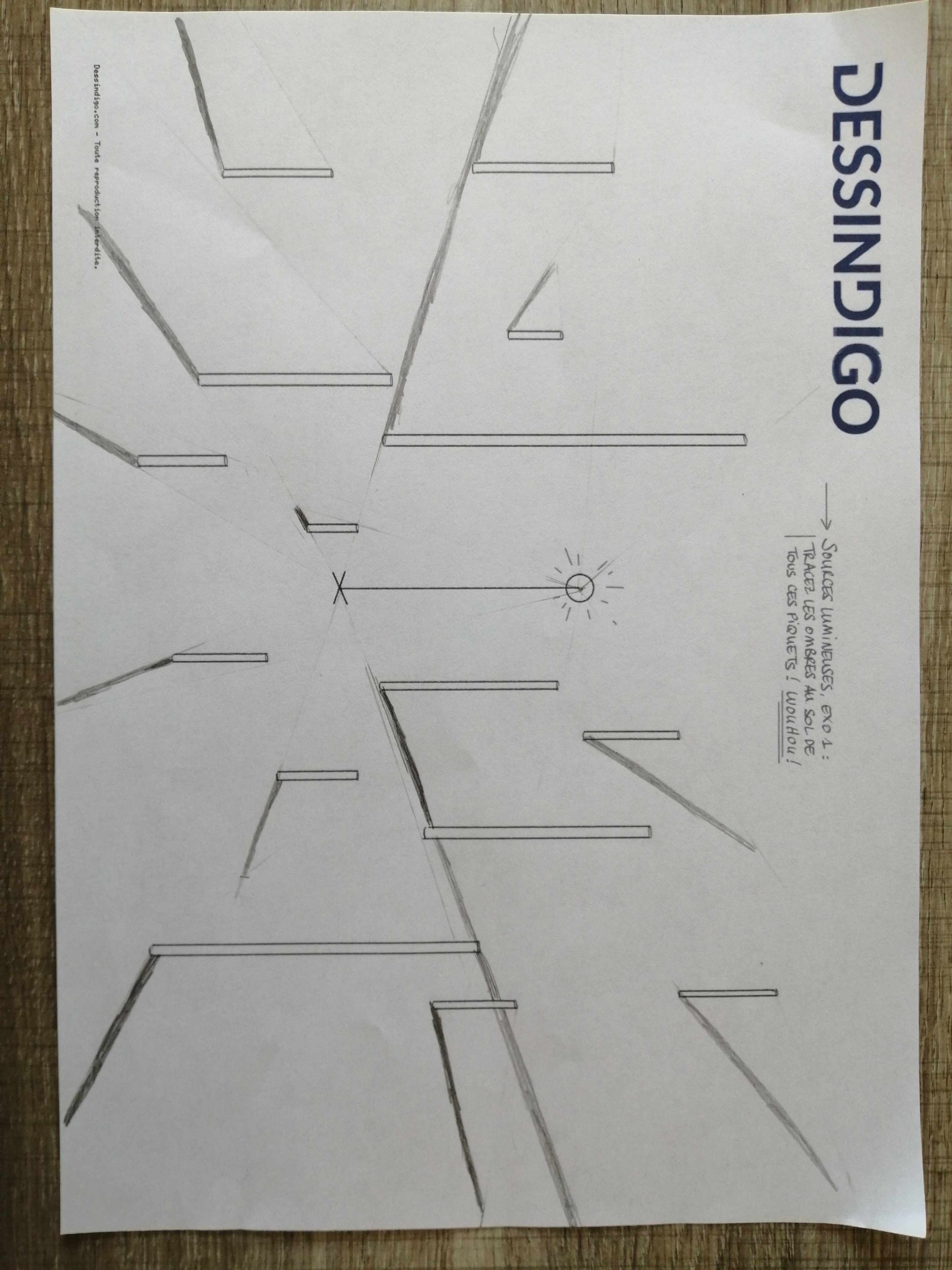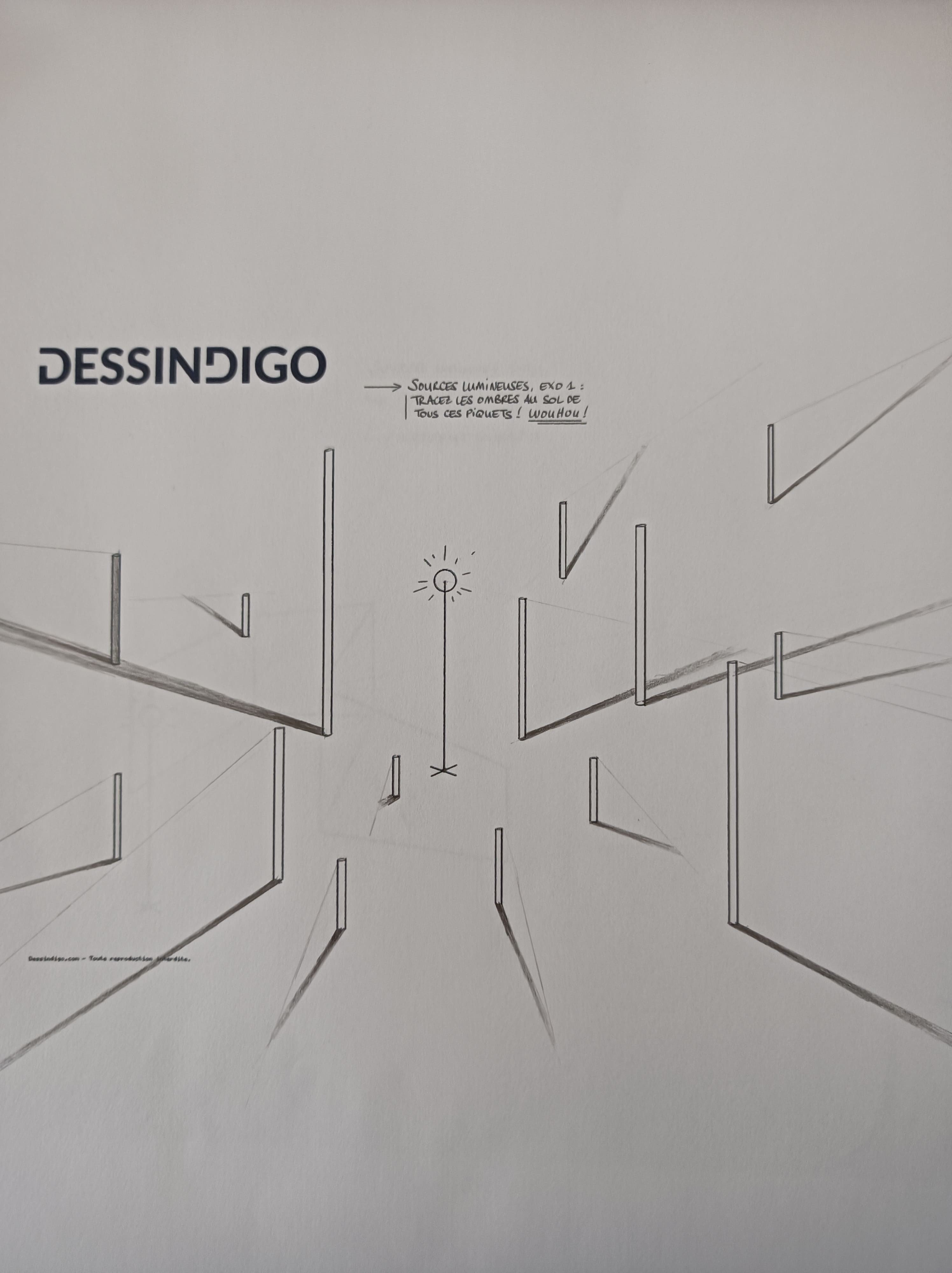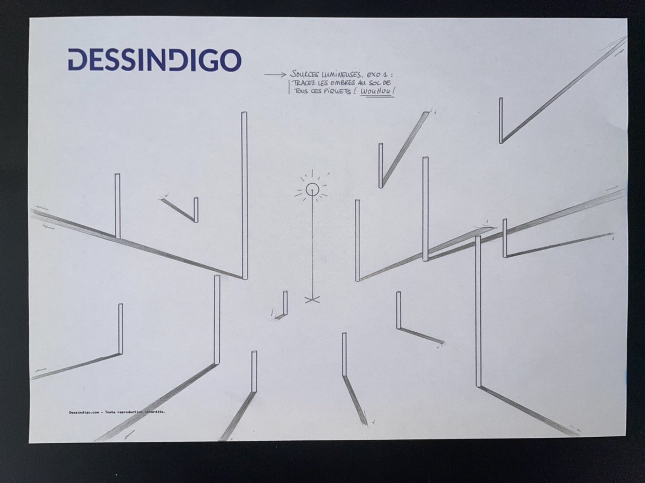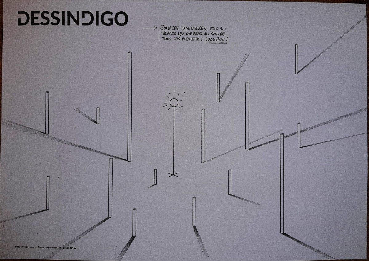 Je me suis posé la question sur 1 piquet qui semble se trouver derrière un plus grand à gauche de la feuille. J'ai portée l'ombre du grand sur le petit piquet, mais je n'ai pas trop su comment départager l'ombre globale, pou rmoi elle semble faire 2 ombres distinctes avec une délimitation entre 2 car une zone plus sombre derrière le petit piquet (même si ça ne se révèle pas flagrant sur mon dessin je l'avoue). Est-ce bien cela ?