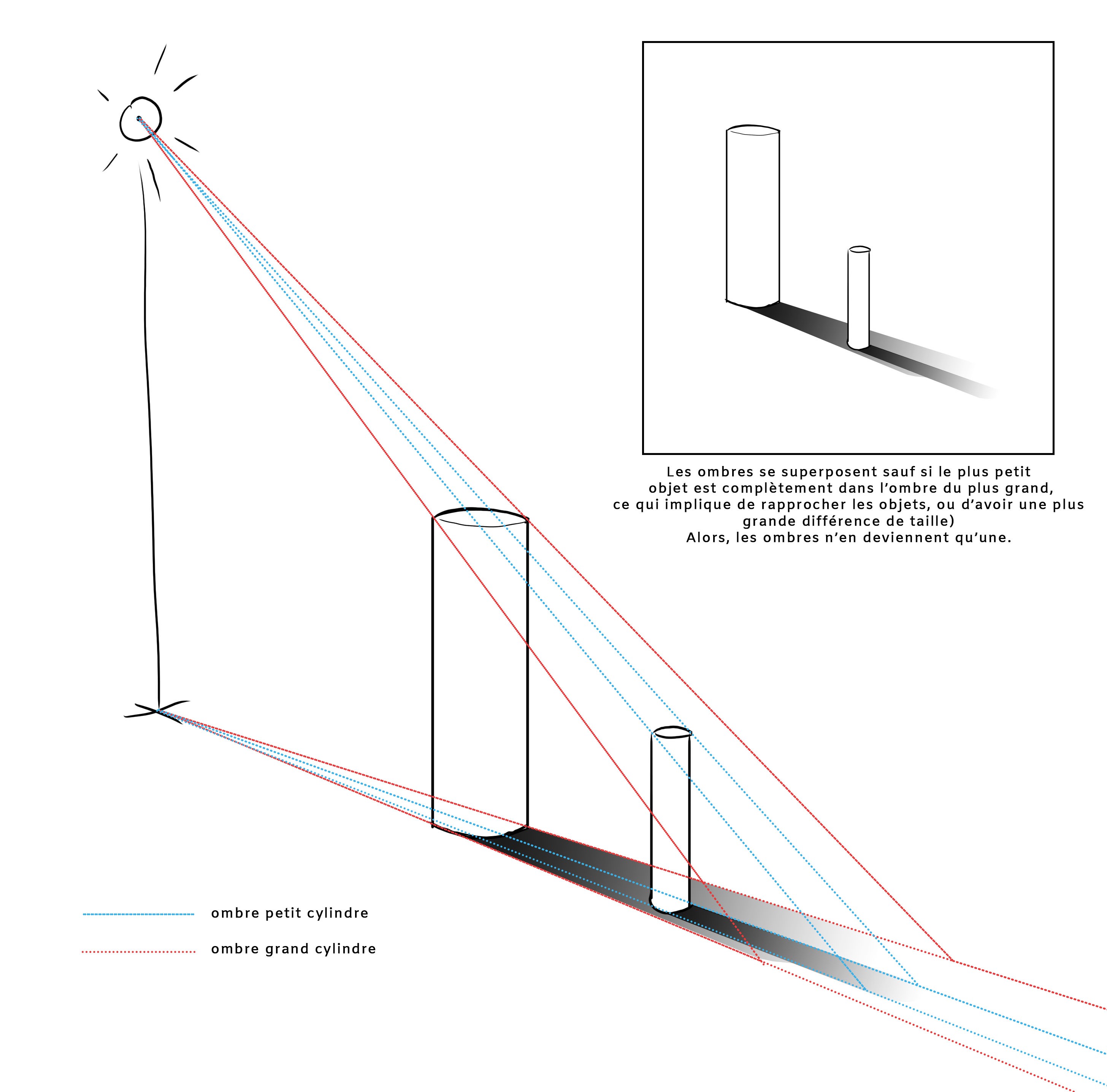 Si l'objet est un peu éloigné de l'autre, son ombre va se voir dans la partie dégradée de l'ombre du grand objet.