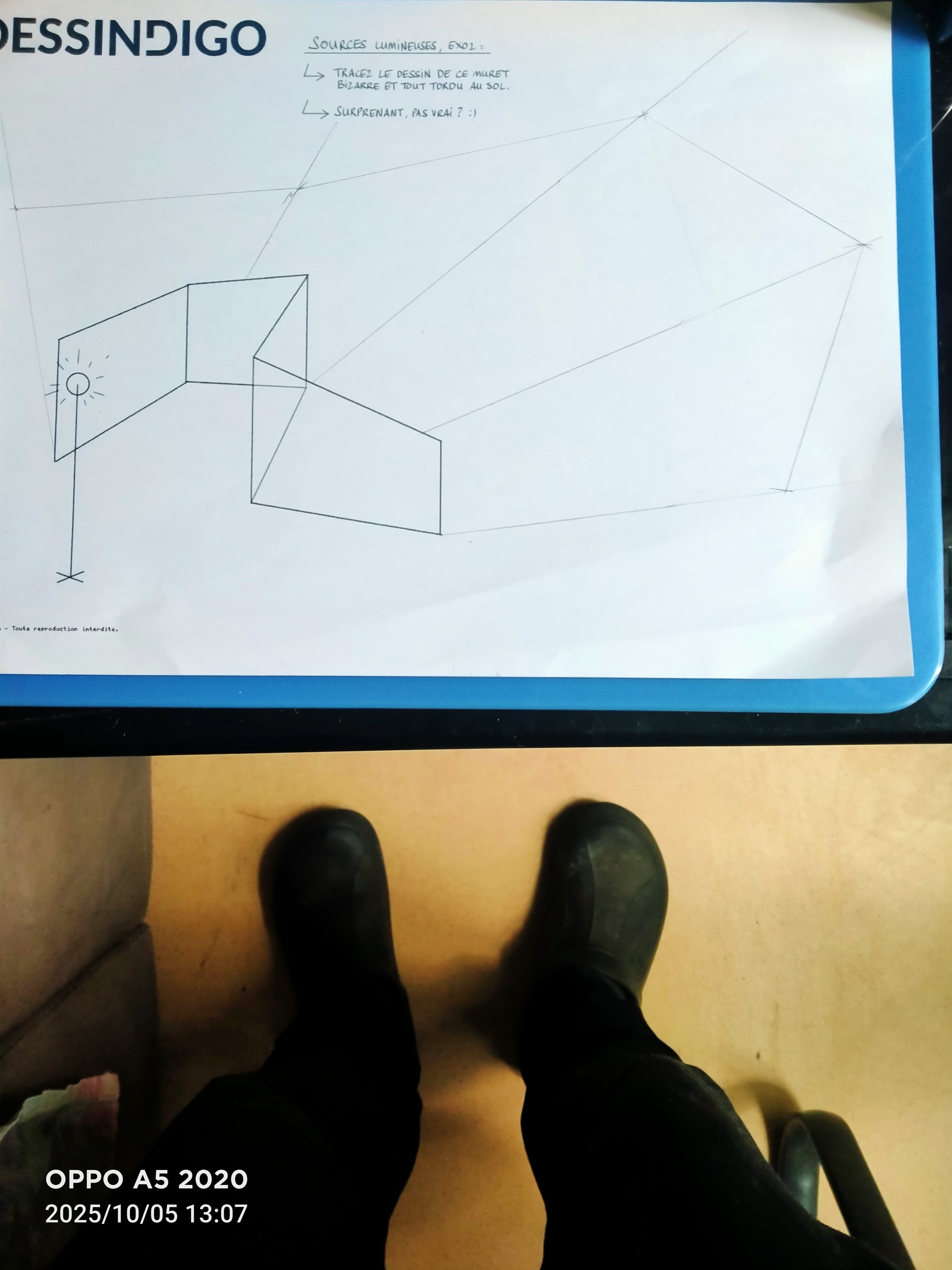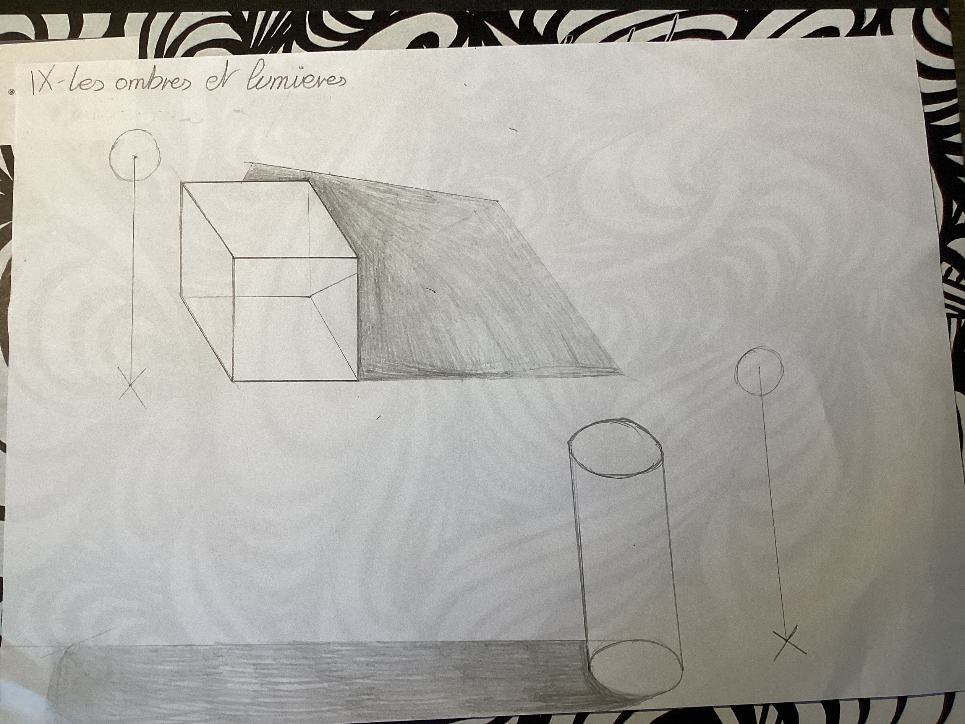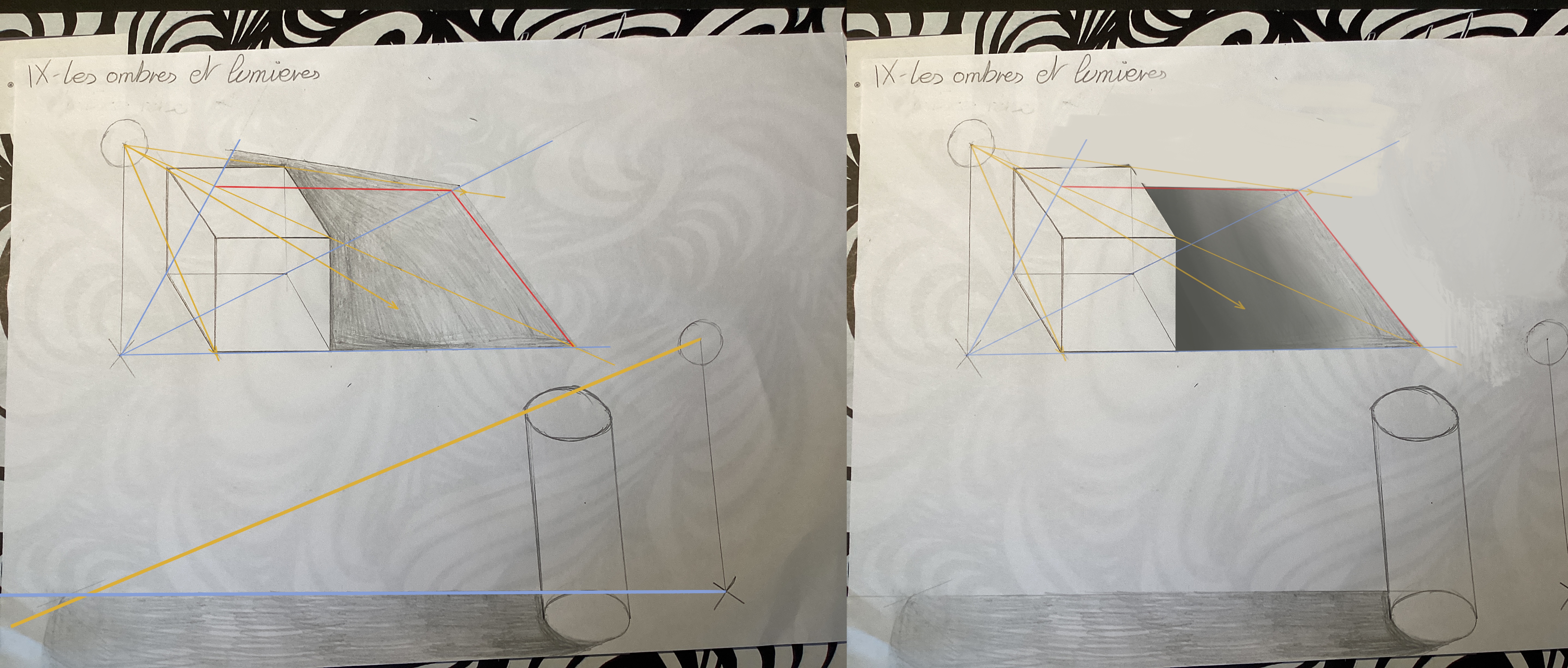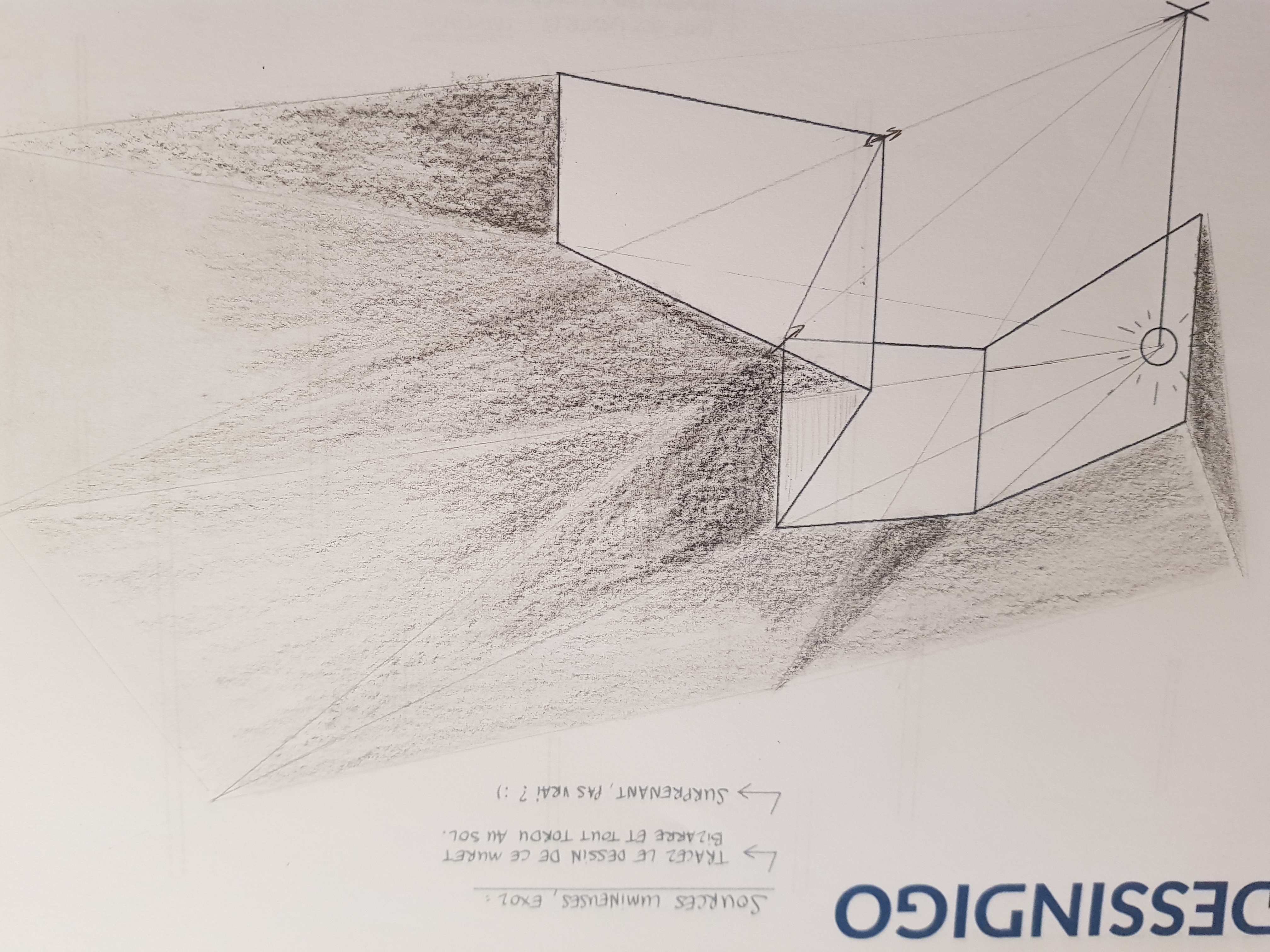 Ton exercice est très bien ! Tu as correctement suivi les lignes de référence pour projeter les ombres, c'est un point positif pour toi ! De plus, l'utilisation de différentes intensités d'ombre donne une touche stylistique qui rend l'intensité du contraste encore plus claire. Excellent !