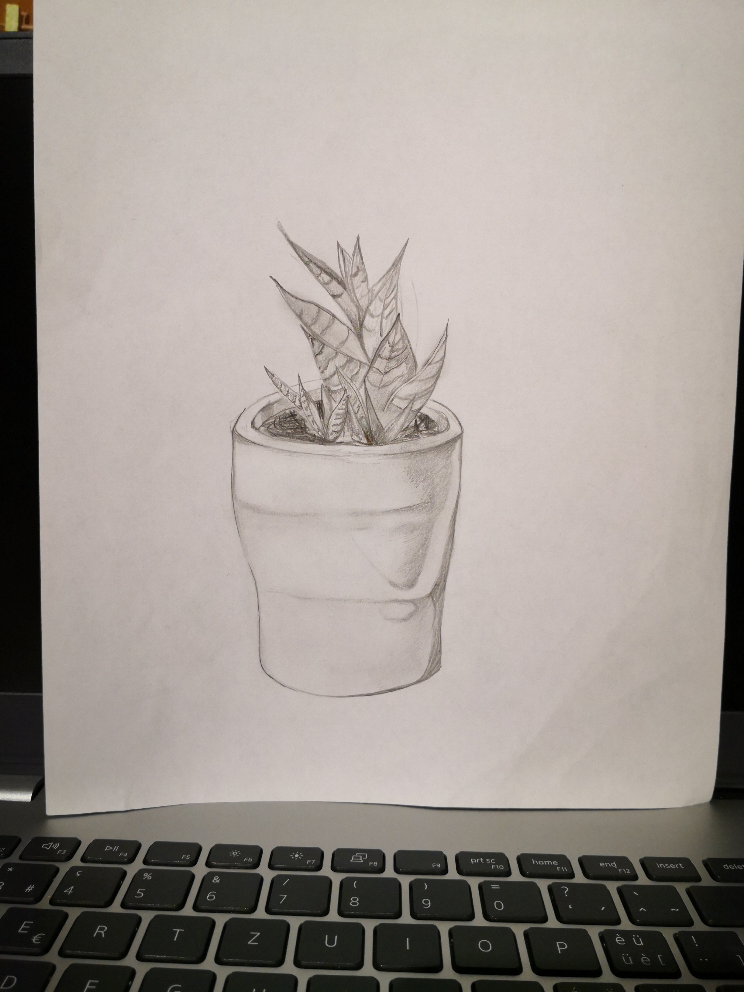C’est chouette, les volumes sont plutôt bien rendus :) il y a pas mal de blanc sur le pot donc peut être que l’ombre devrait plus se dégrader vers du plus clair. Je pense aussi qu’il faudrait un peu plus d’ombres dues à la lumière sur les feuilles. Un poil plus de contraste vers du plus foncé (pas sur la terre, là c’est ok) serait bienvenu. En tous cas c’est du bon travail :)