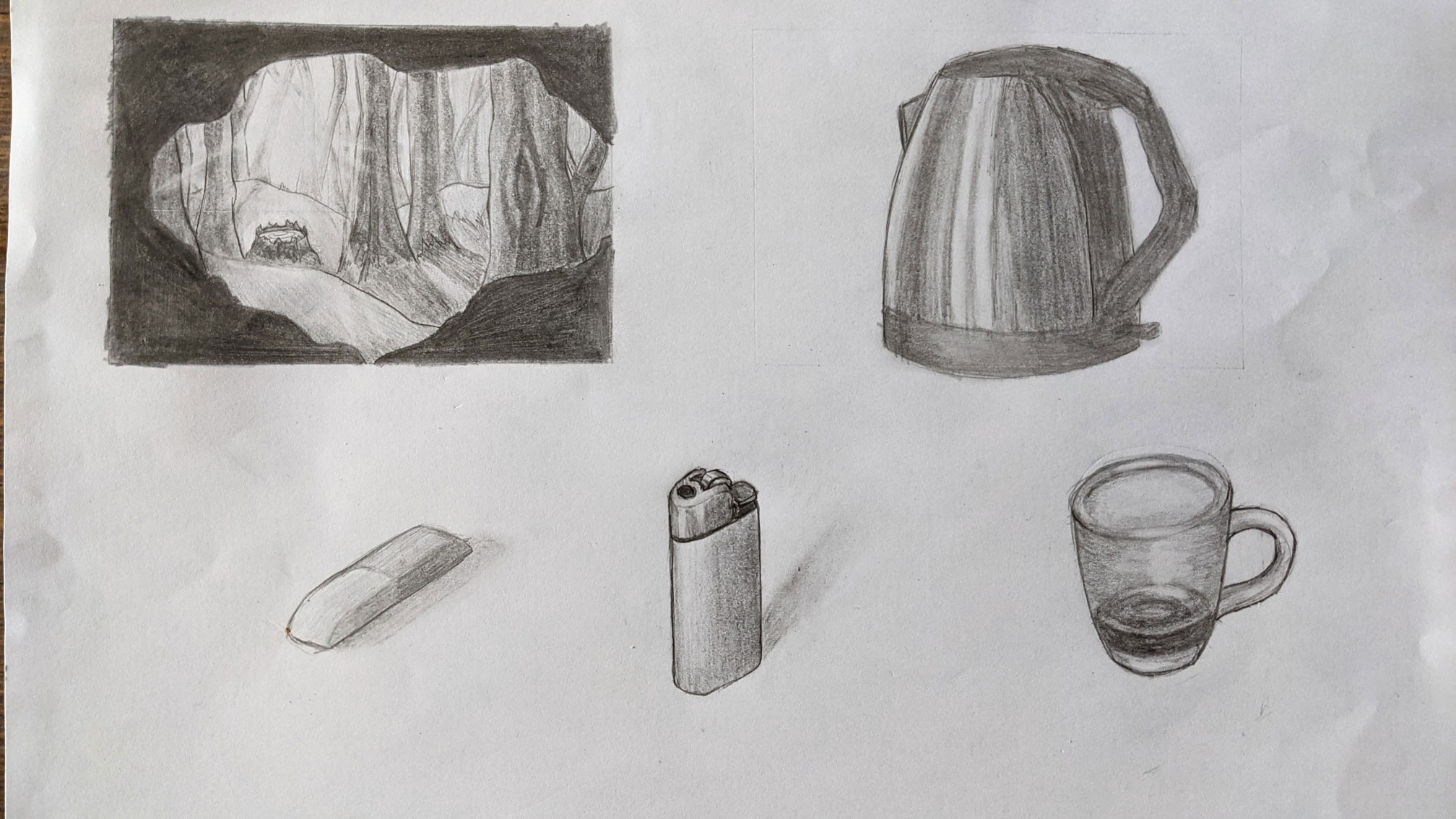 Bonjour Beberthetoon ! C’est du beau travail :) pour le paysage on voit bien les différences entre les plans. Globalement il y a un bon contraste sur tes dessins, peut-être légèrement moins sur la gomme. Pour la cafetière ça manque peut être légèrement de différence entre le foncé du métal de la cafetière et sa anse. Il faudrait que je vois le modèle pour vraiment savoir ce qui doit plus clair ou plus foncé. En tous cas c’est bien fait tout ça, bravo :)
