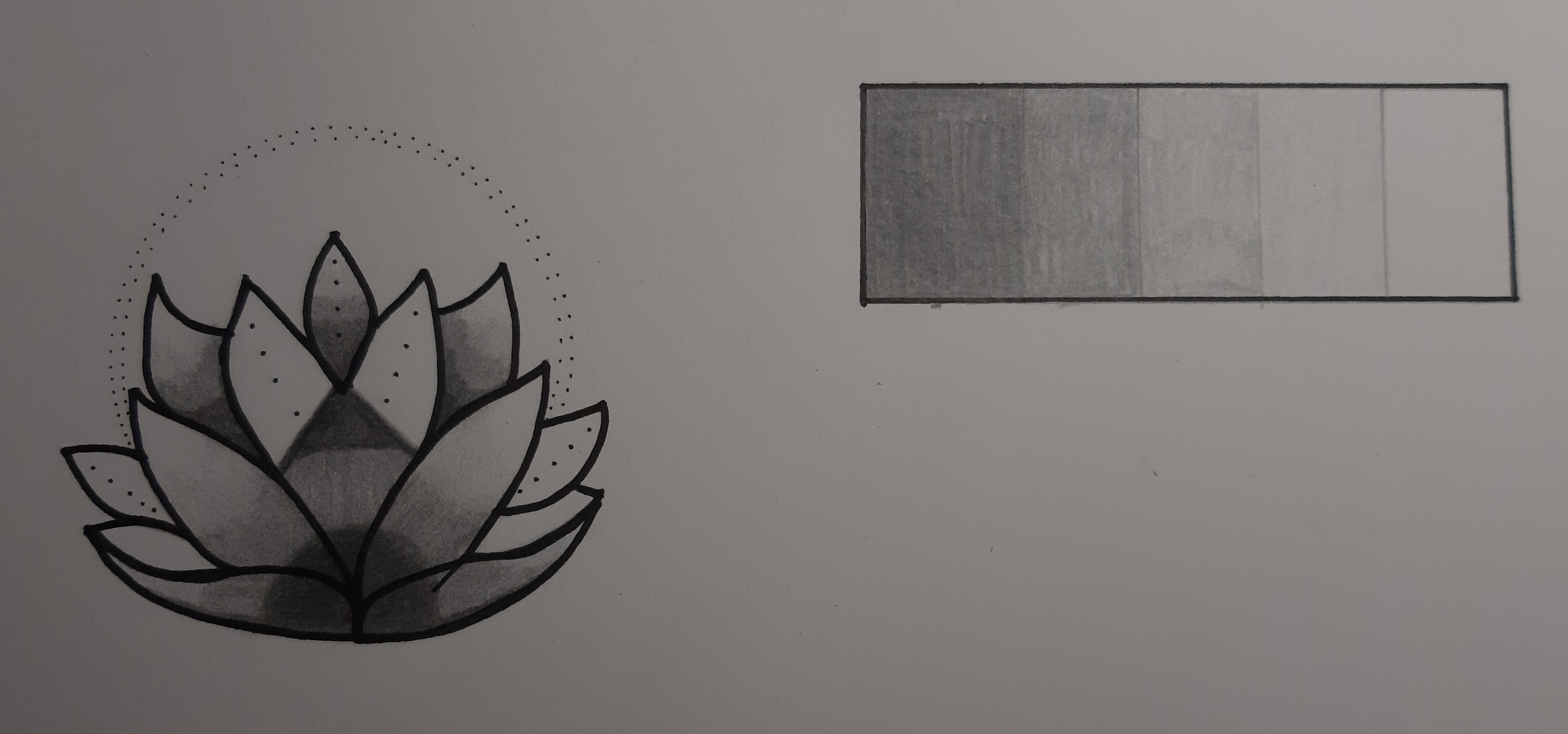 Ah un travail façon tatouage ! C'est joli ! Tu as bien contrasté ton dessin, même plus que sur ton échelle, et sa rend plutôt bien :) La remarque que je pourrais faire c'est qu'il faudrait faire des dégradés plus progressifs entre tes teintes, là ça fait des crans qui s'arrêtent assez nets. Par exemple si tu vas du foncé au plus clair, plus tu t'éloignes du foncé moins tu appuies, de manière progressive. Joli travail sinon :)