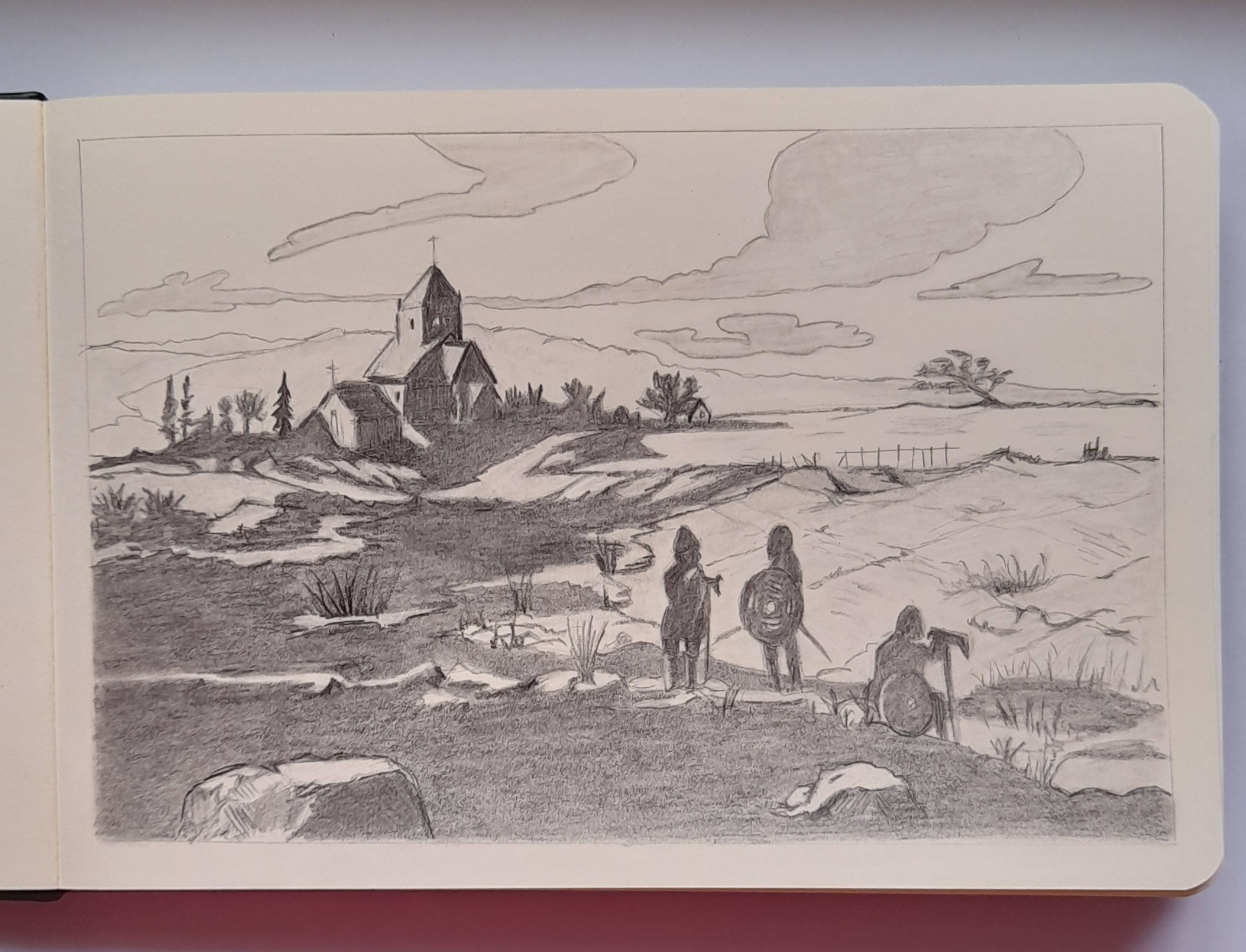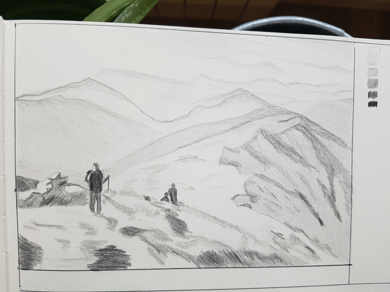 C'est du beau travail, on voit bien les contrastes et la perspective atmosphérique ! Peut-ête juste qu'au plan le plus proche les zones les plus claires sont un peu trop claires. Foncer un petit peu permettrait de mieux détacher ce premier plan ^^
