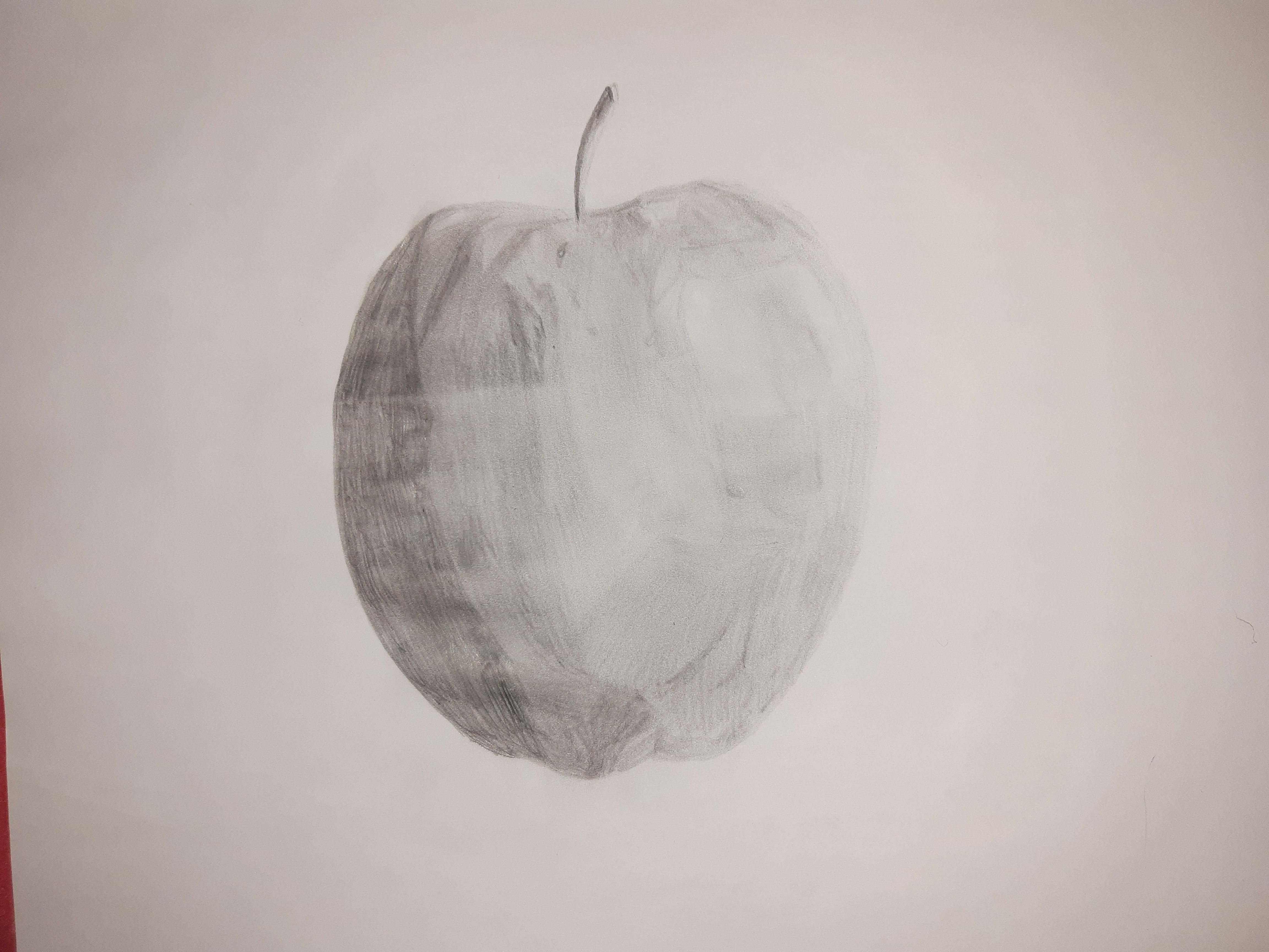 C'est un bon début :) Les contrastes sont plutôt bien, tu vois bien où sont les ombres. Attention à l'effet patchwork, on voit des zones d'ombres très délimitées qui ne suivent pas toujours les volumes. On peut améliorer les choses en travaillant les dégradés. On peut faire des transitions dans l'ombre en appuyant progressivement moins, repassant... Egalement on peut mettre plus en valeur la zone de lumière dans la partie en haut à droite de la pomme en gommant la zone. Joli travail en tous cas !
