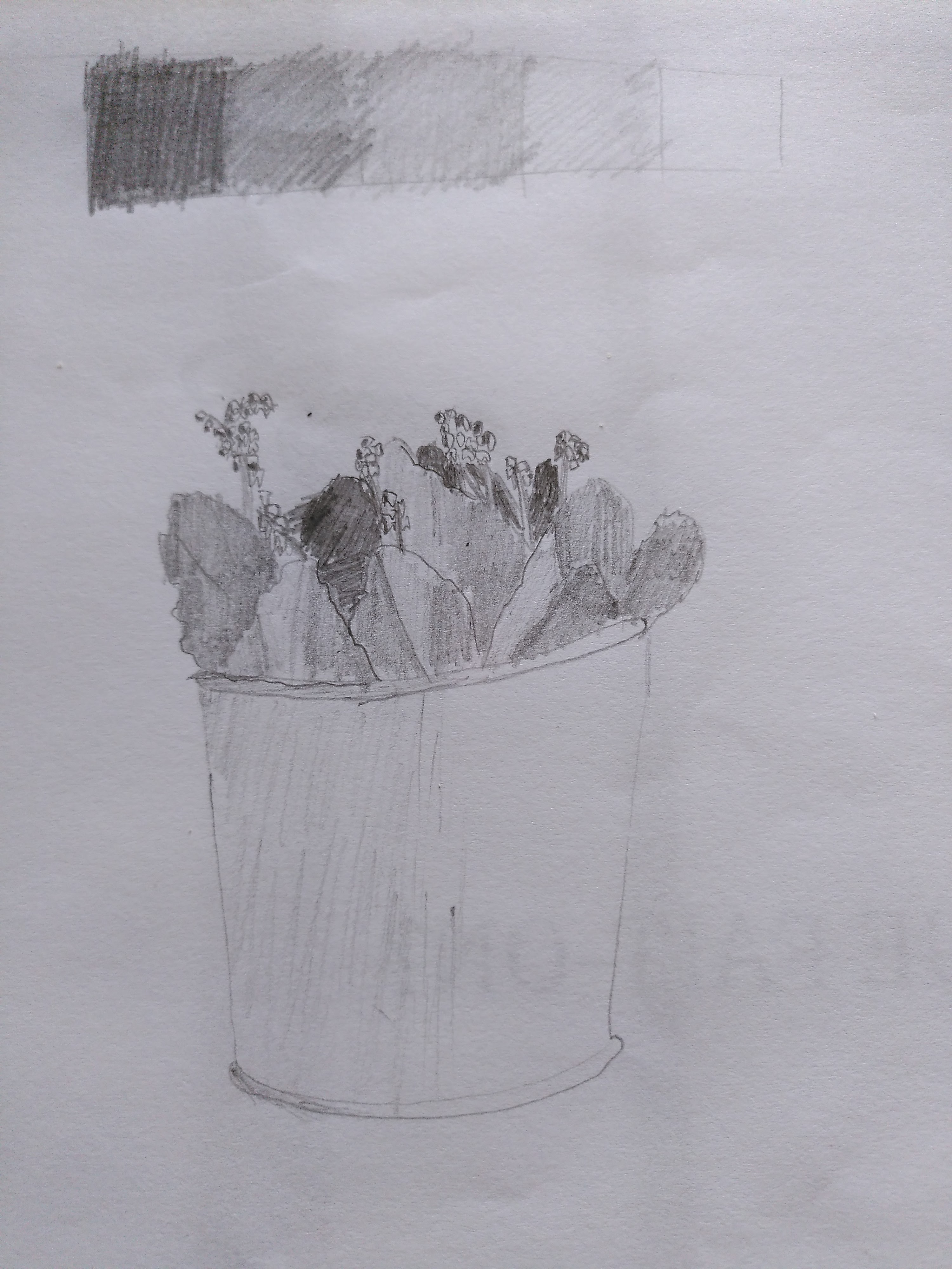 Concernant ton dessin c'est plutôt bien compris mais on voit peu la direction de la lumière sur la plante. Sur le modèle on voit que toute la partie gauche est dans une forte ombre, alors que sur ton dessin les valeurs sont assez similaires. Je pense que les détails ont peu embrouiller. Quand on regarde la photo en louchant donc en flou, on voit mieux les tendances générales d'ombre et de lumière. Pas mal sur le pot, mais on peut foncer plus pour plus de contraste. Travail soigné en tous cas :)