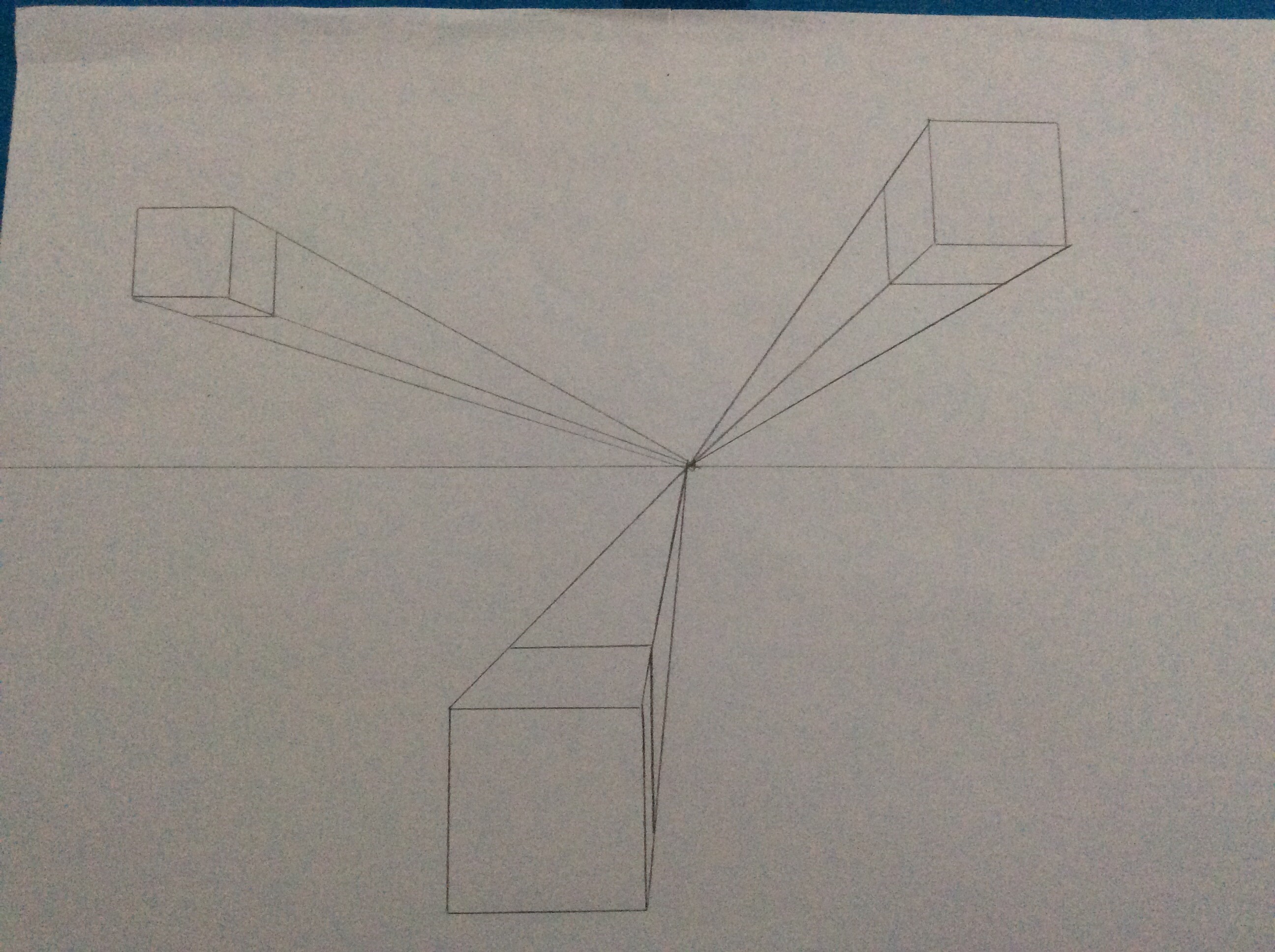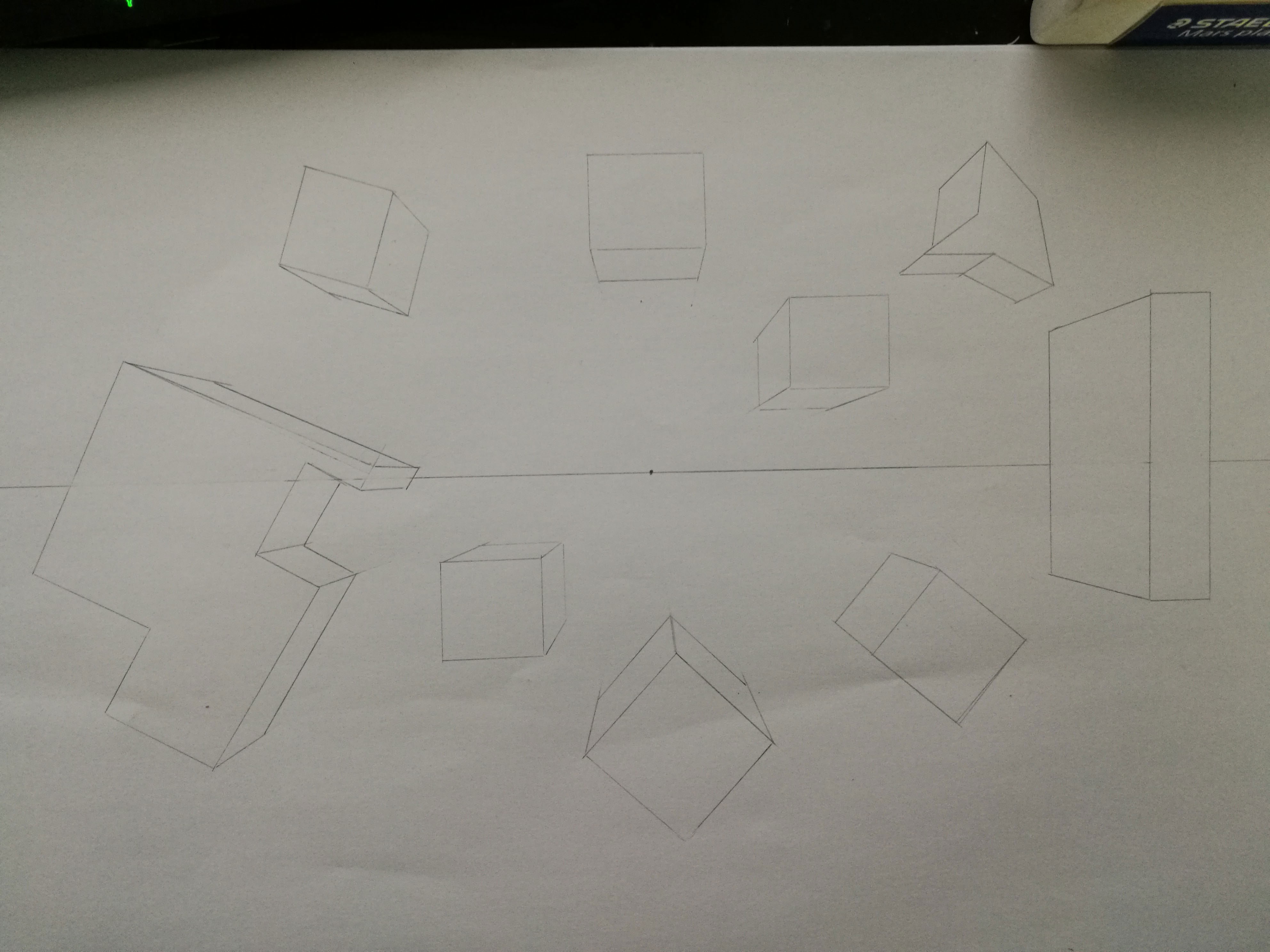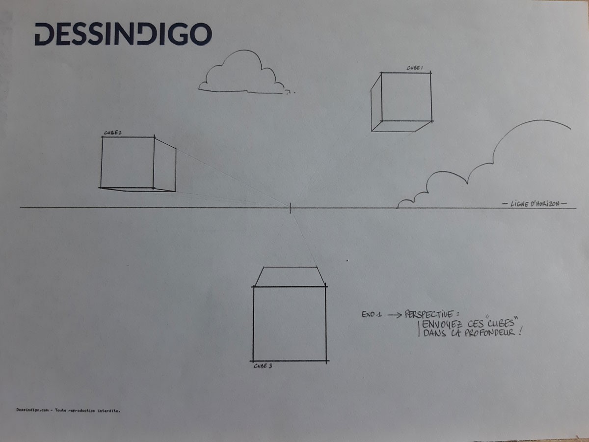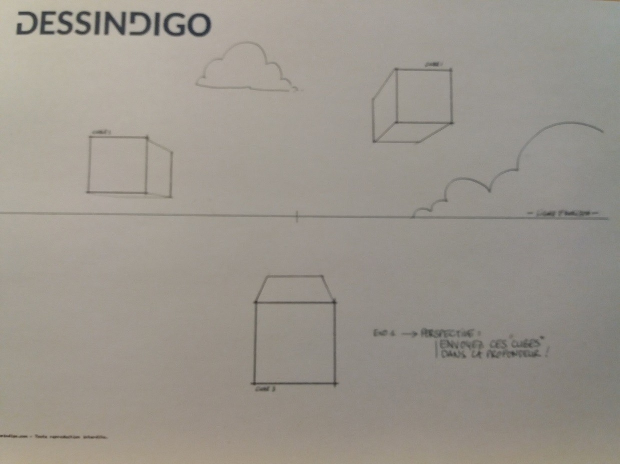N'ayant pas d'imprimante, j'ai tout mis sur une même feuille en reproduisant plus ou moins les formes à mettre en perspective.