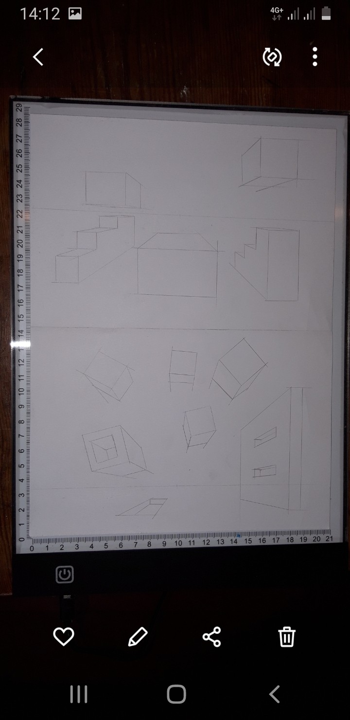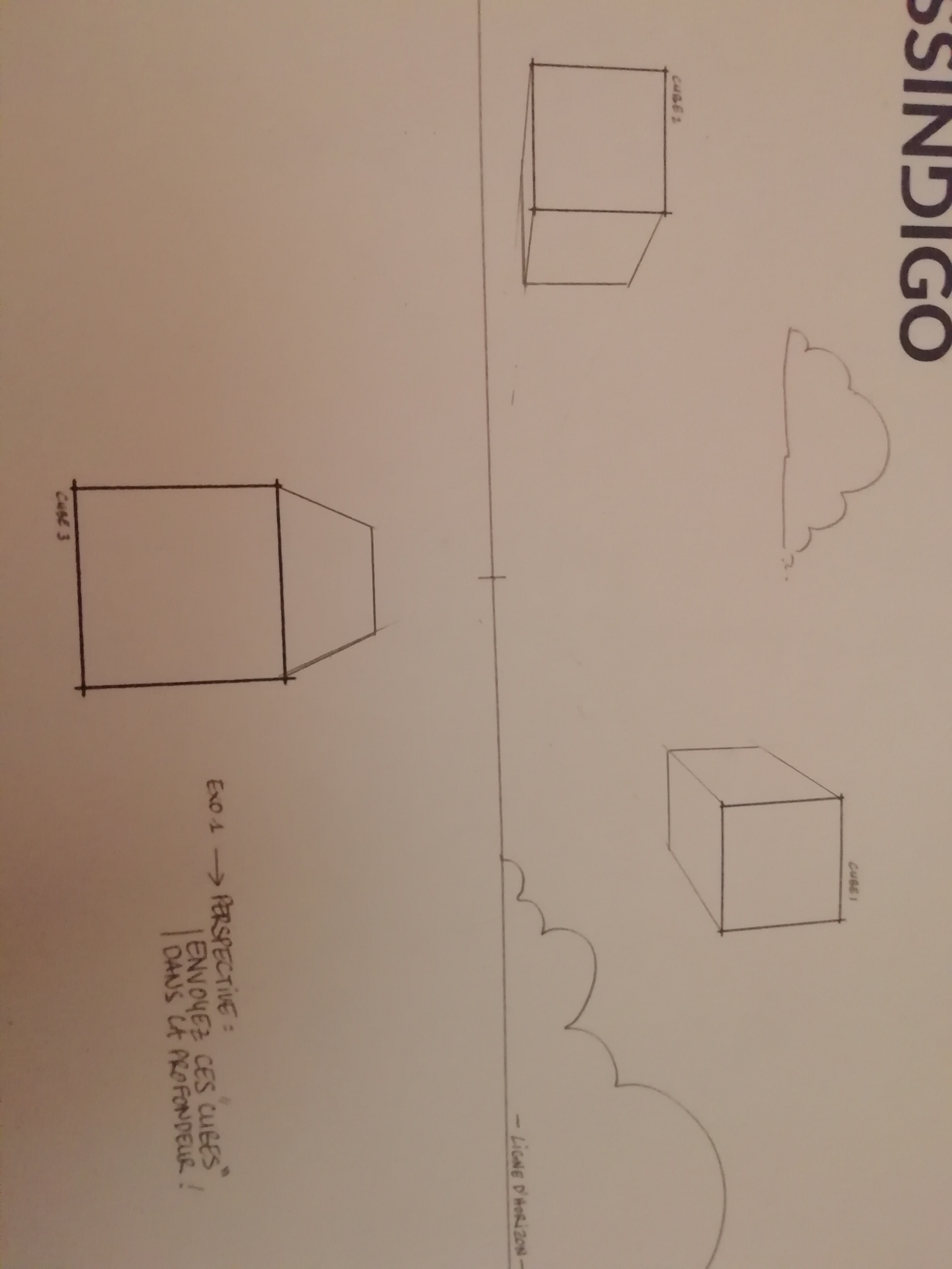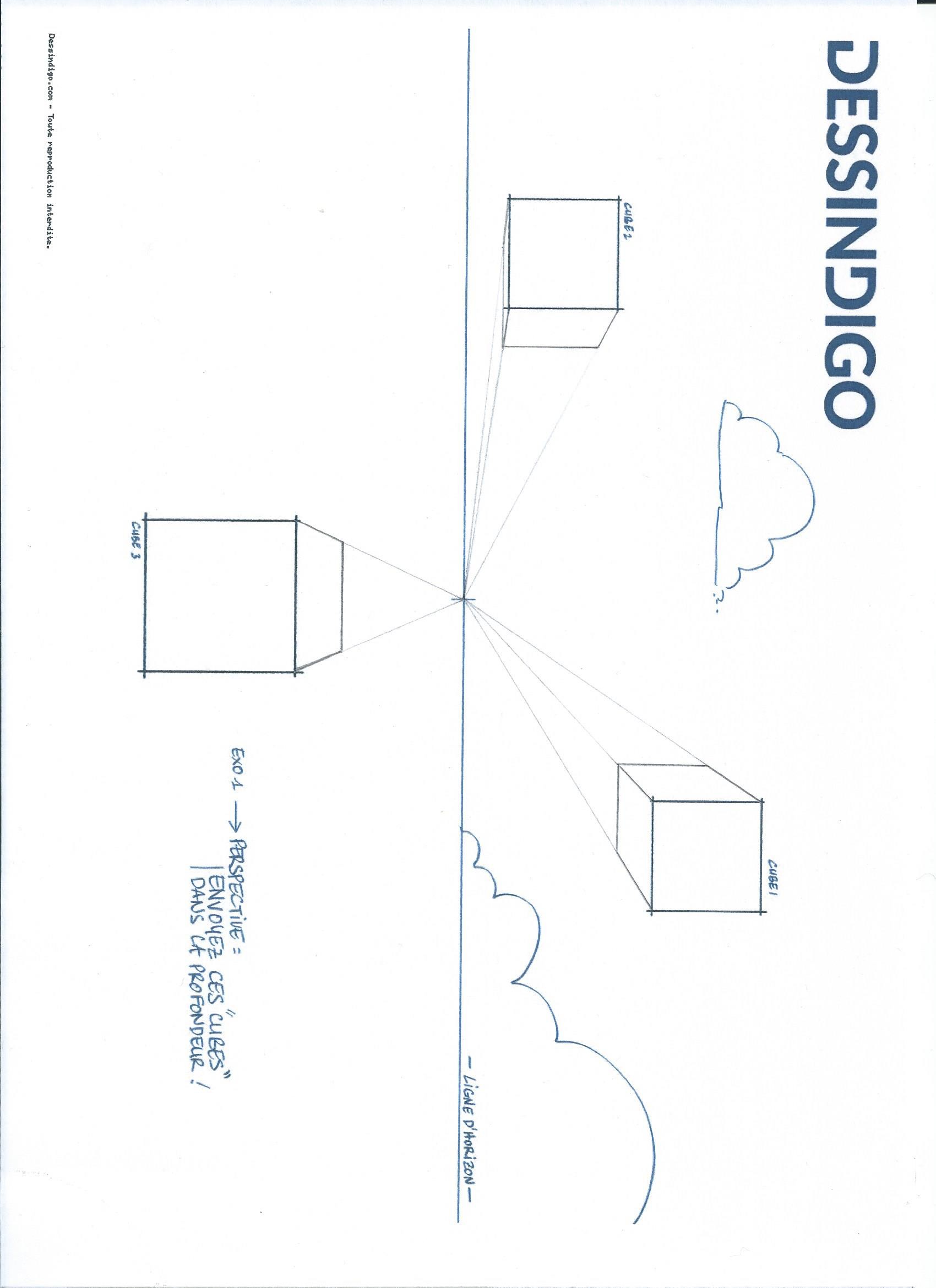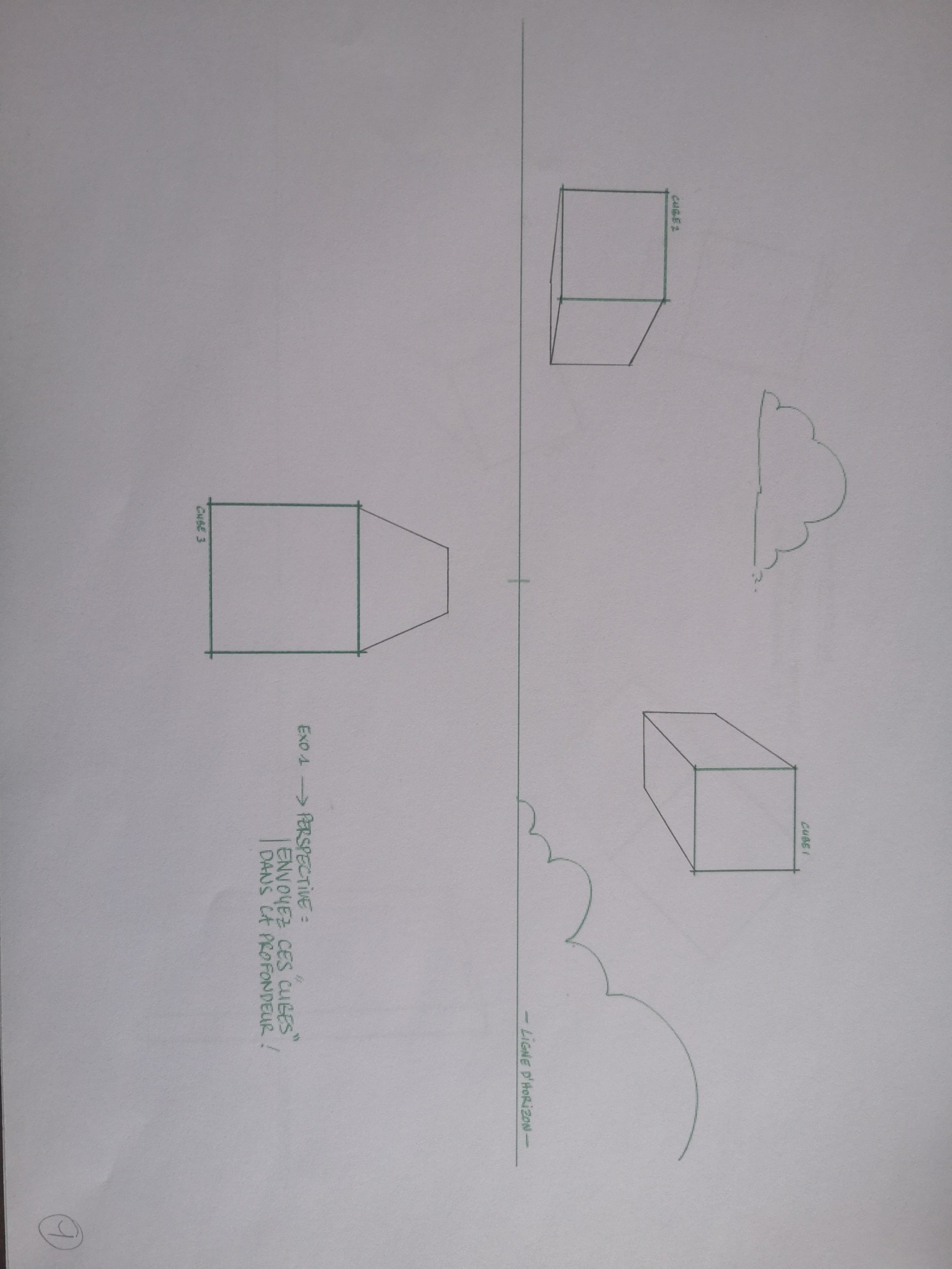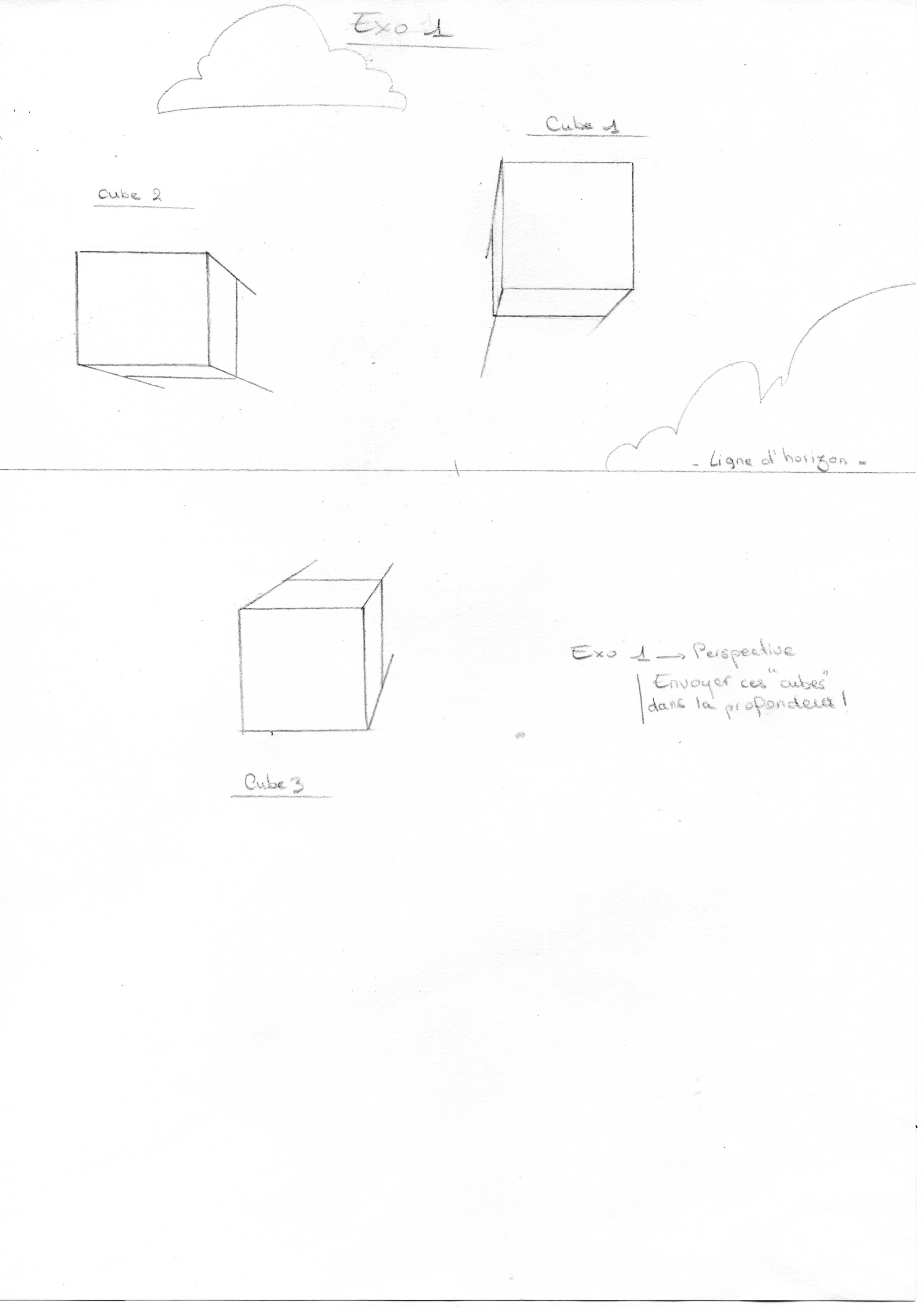 Voici mes cubes. pour les 3 exercices, j'ai eu le meme soucis: comment savoir quelle longueur mes arretes font dans la profondeur? Jusqu'ou arreter mes traits?